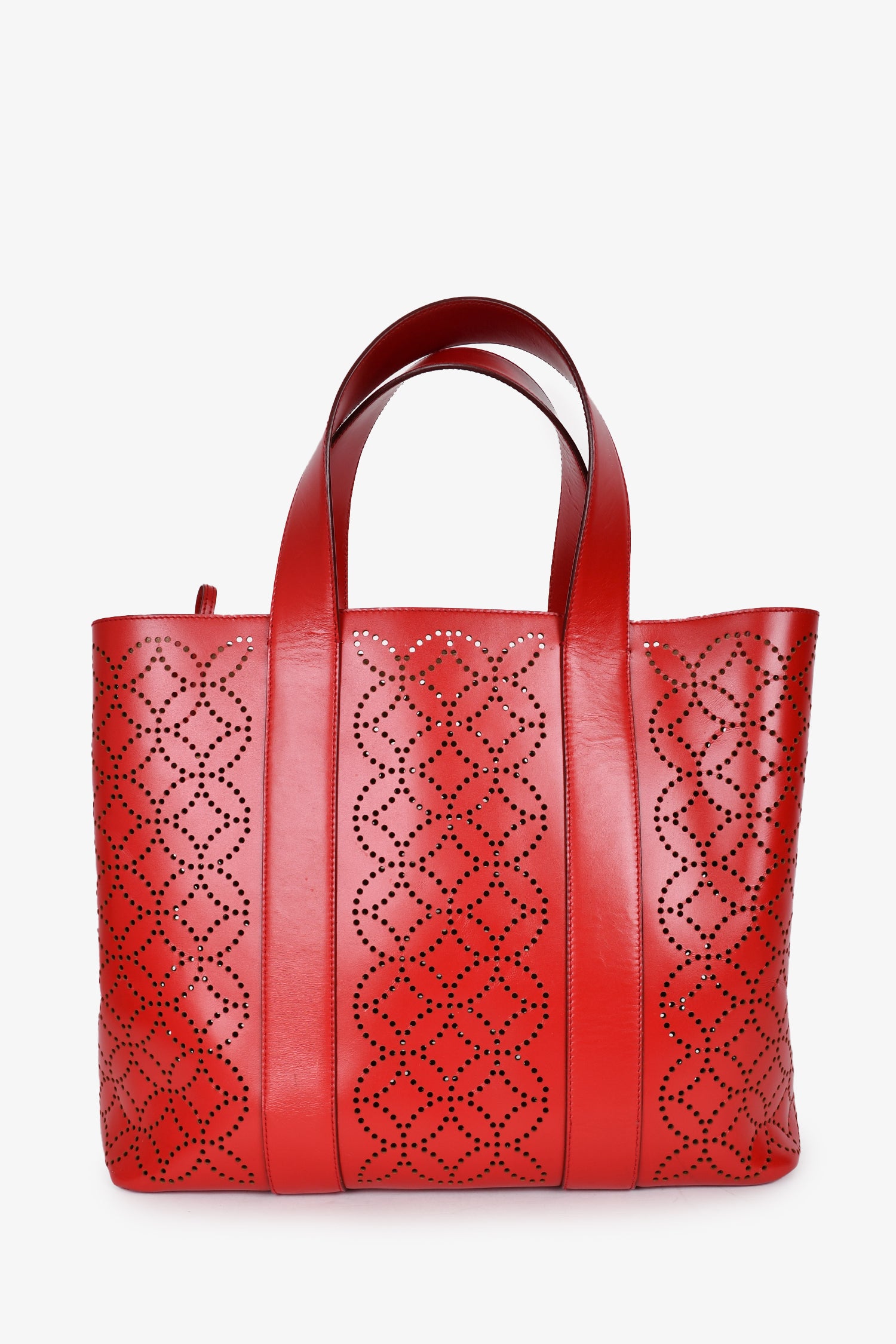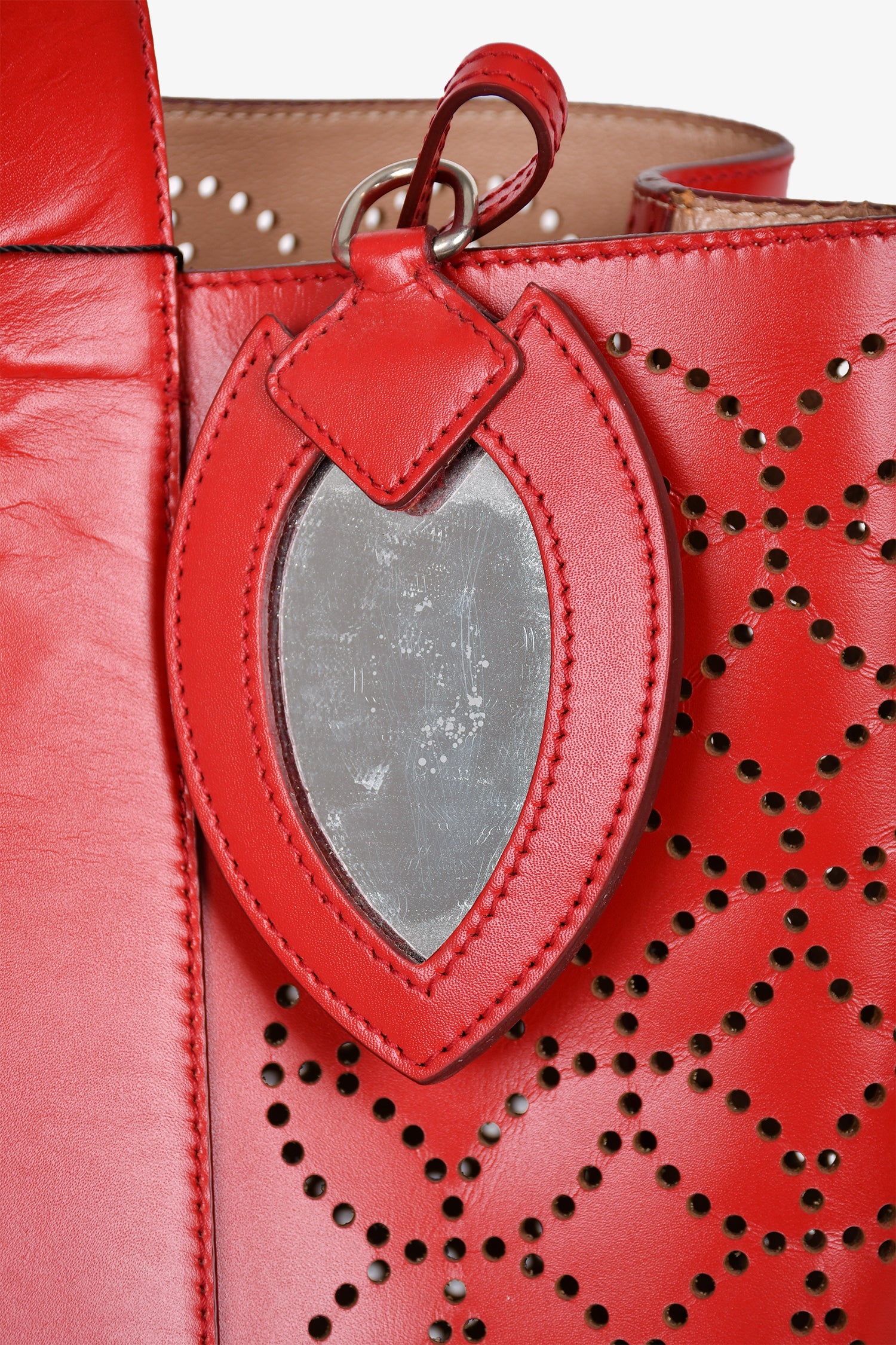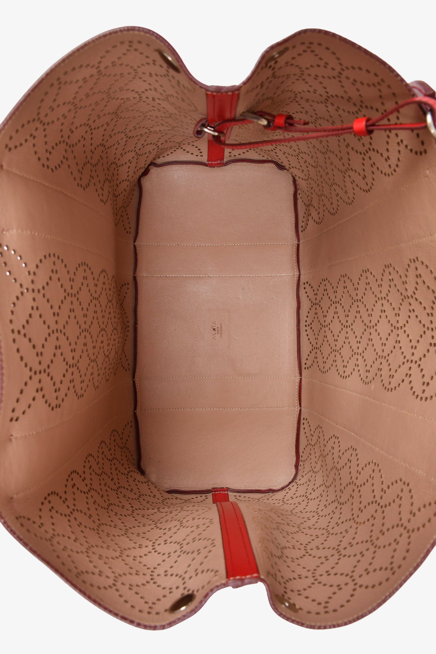 Refresh availabilityAlaia Paris Red Perforated Leather Top Handle Tote. Open interior. Taupe leather interior. Detachable zip pouch and compact mirror. Silver-tone hardware. Tonal stitching. Snap-button closures on the sides.