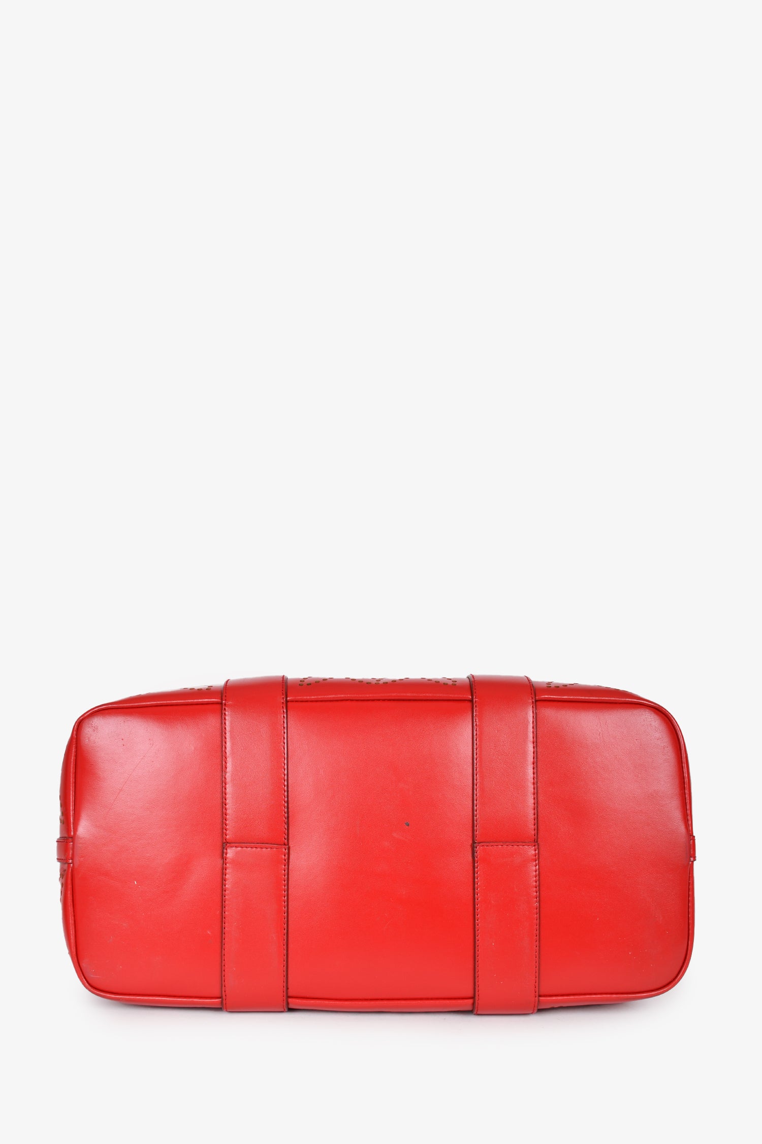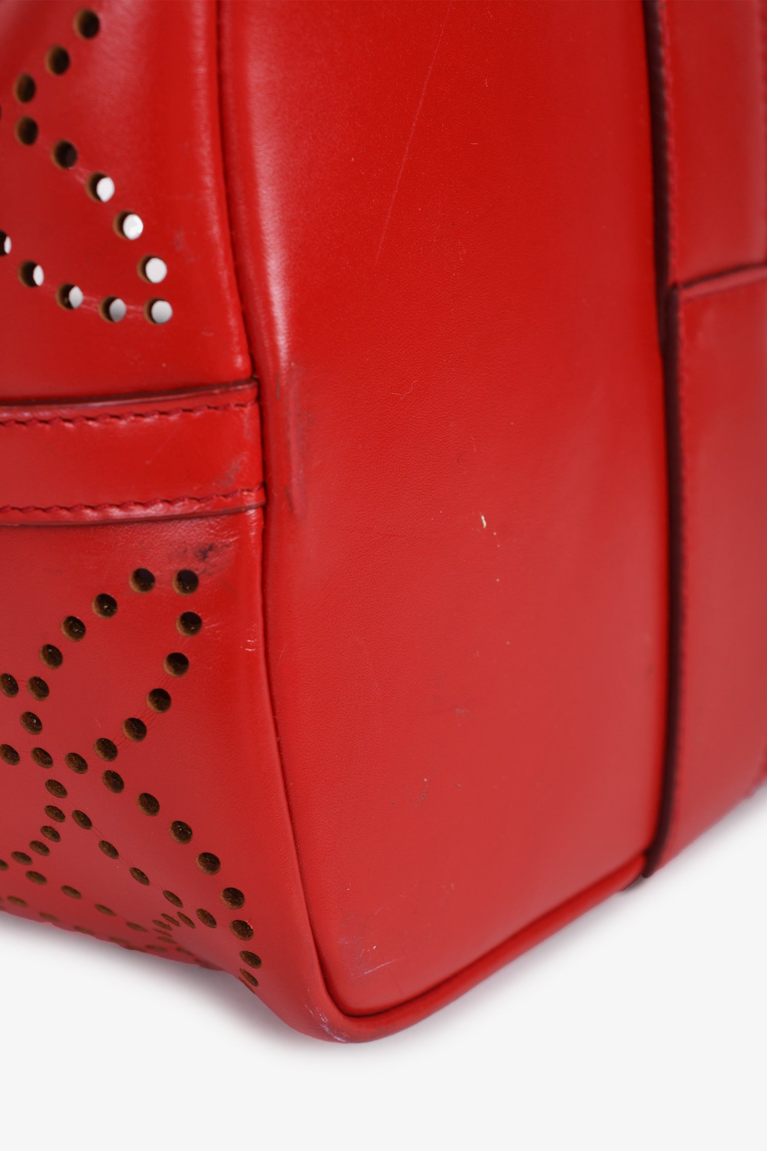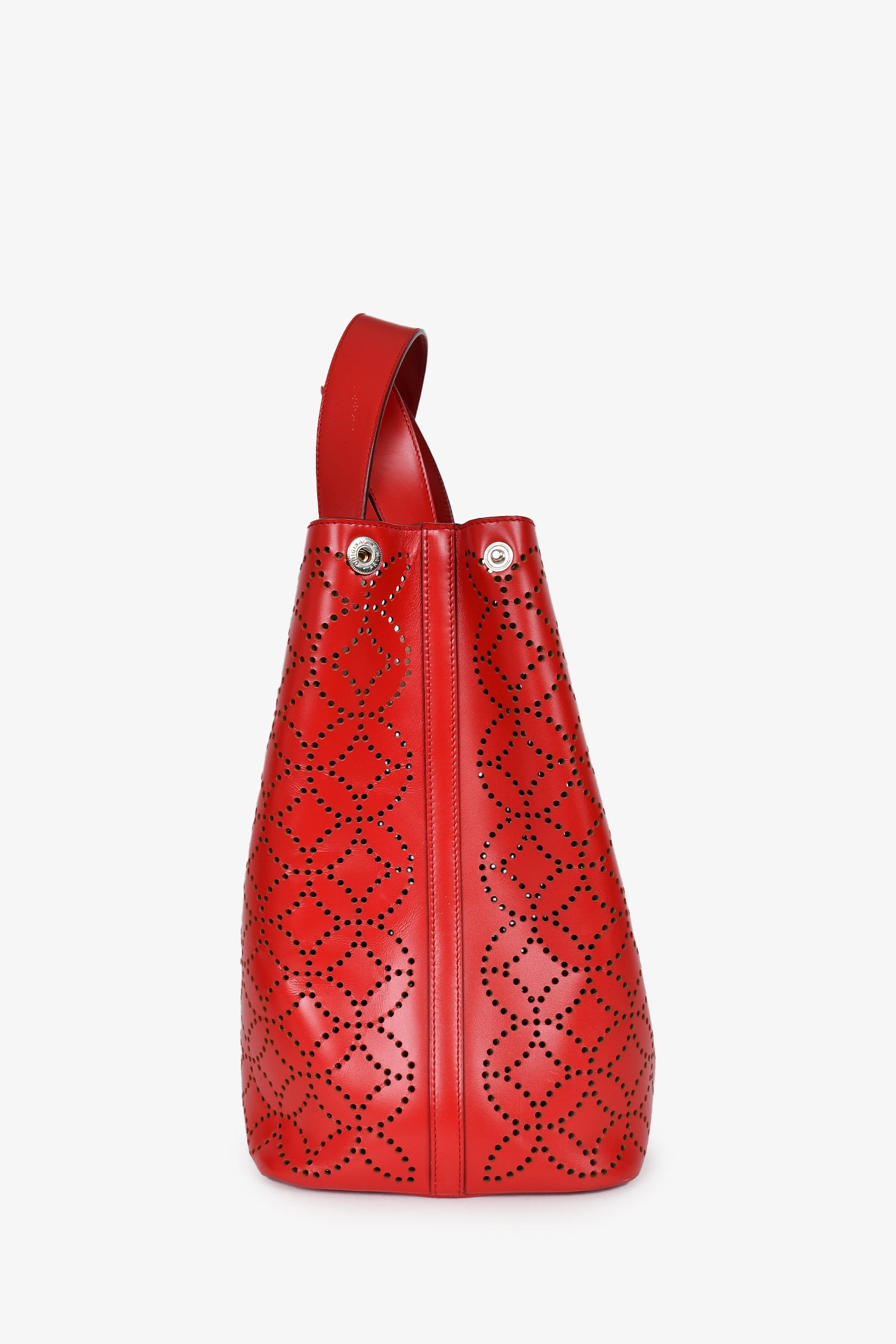 Refresh availabilityAlaia Paris Red Perforated Leather Top Handle Tote. Open interior. Taupe leather interior. Detachable zip pouch and compact mirror. Silver-tone hardware. Tonal stitching. Snap-button closures on the sides.