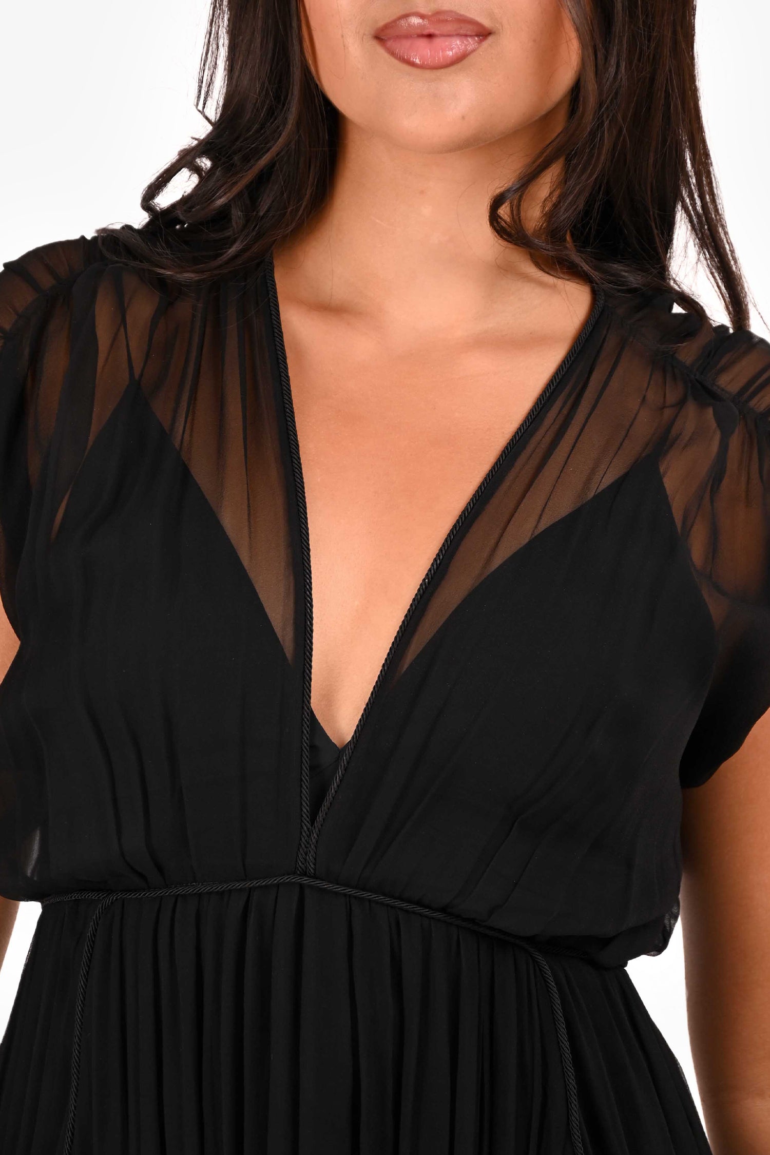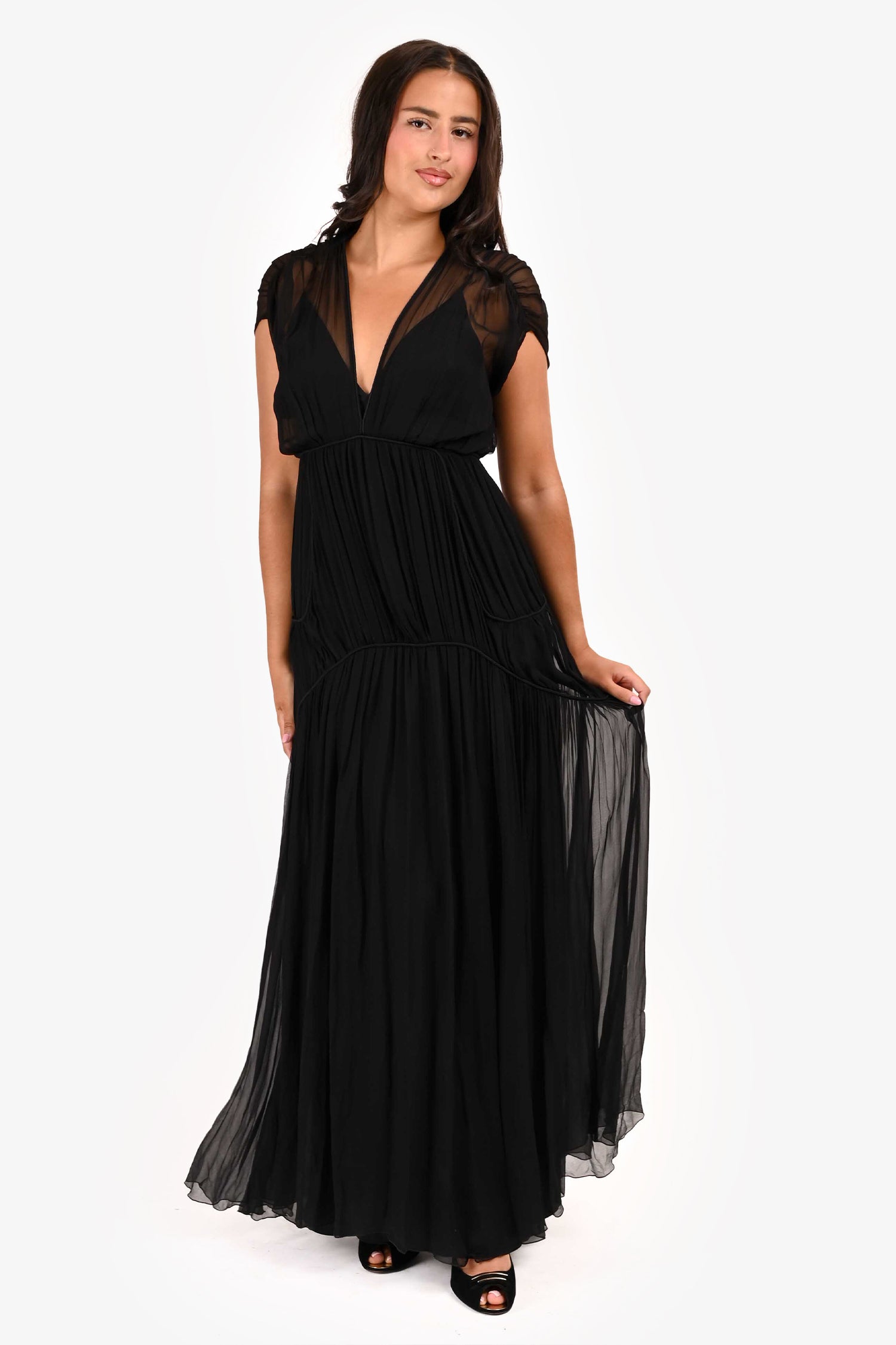 Refresh availabilityAlberta Ferretti Black Chiffon Tiered Open Back Dress. Sleeveless. Tiered chiffon layers throughout. Cutout detail in the back. V neckline. Concealed side zip closure. Interior tonal detachable slip. Tonal stitching.