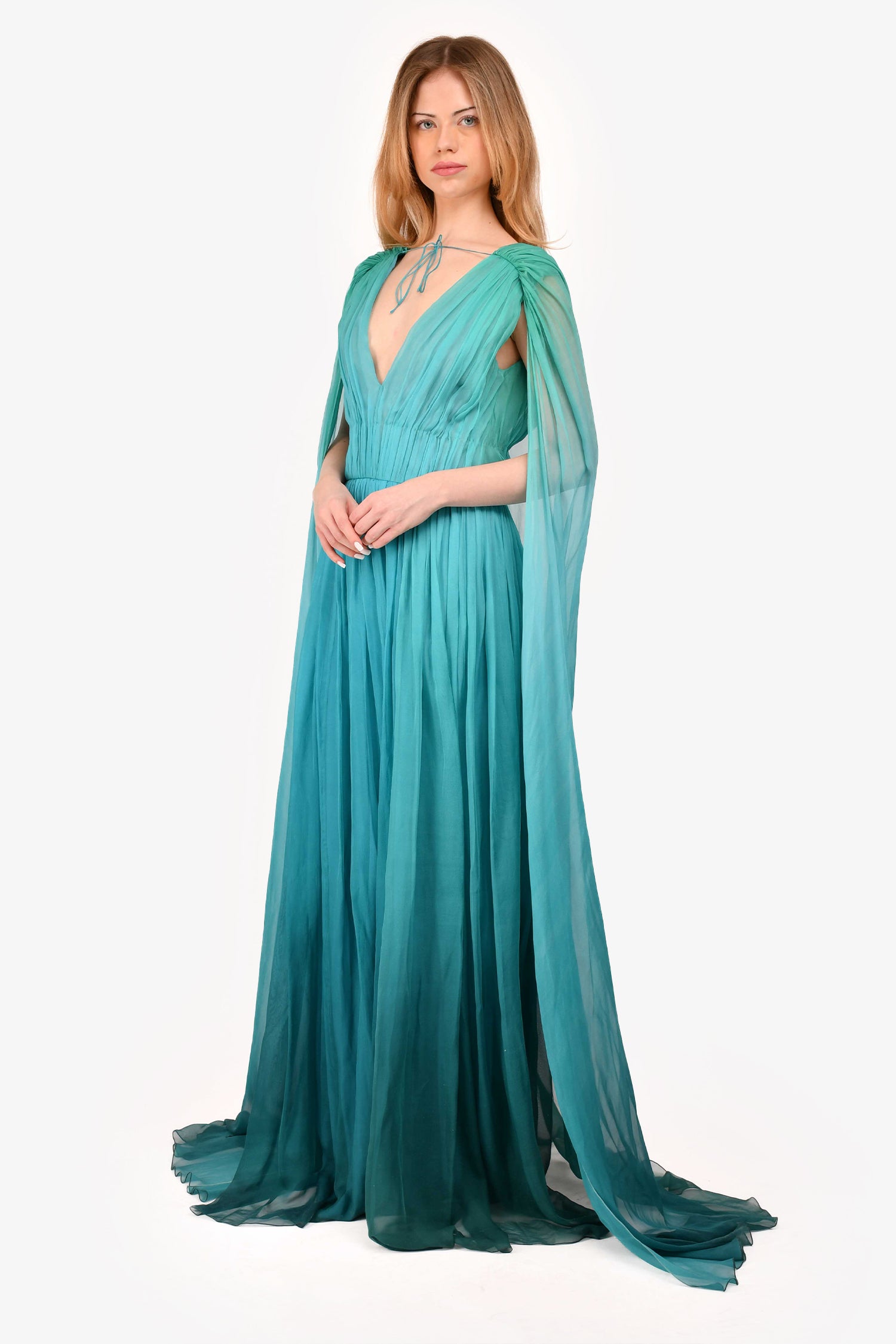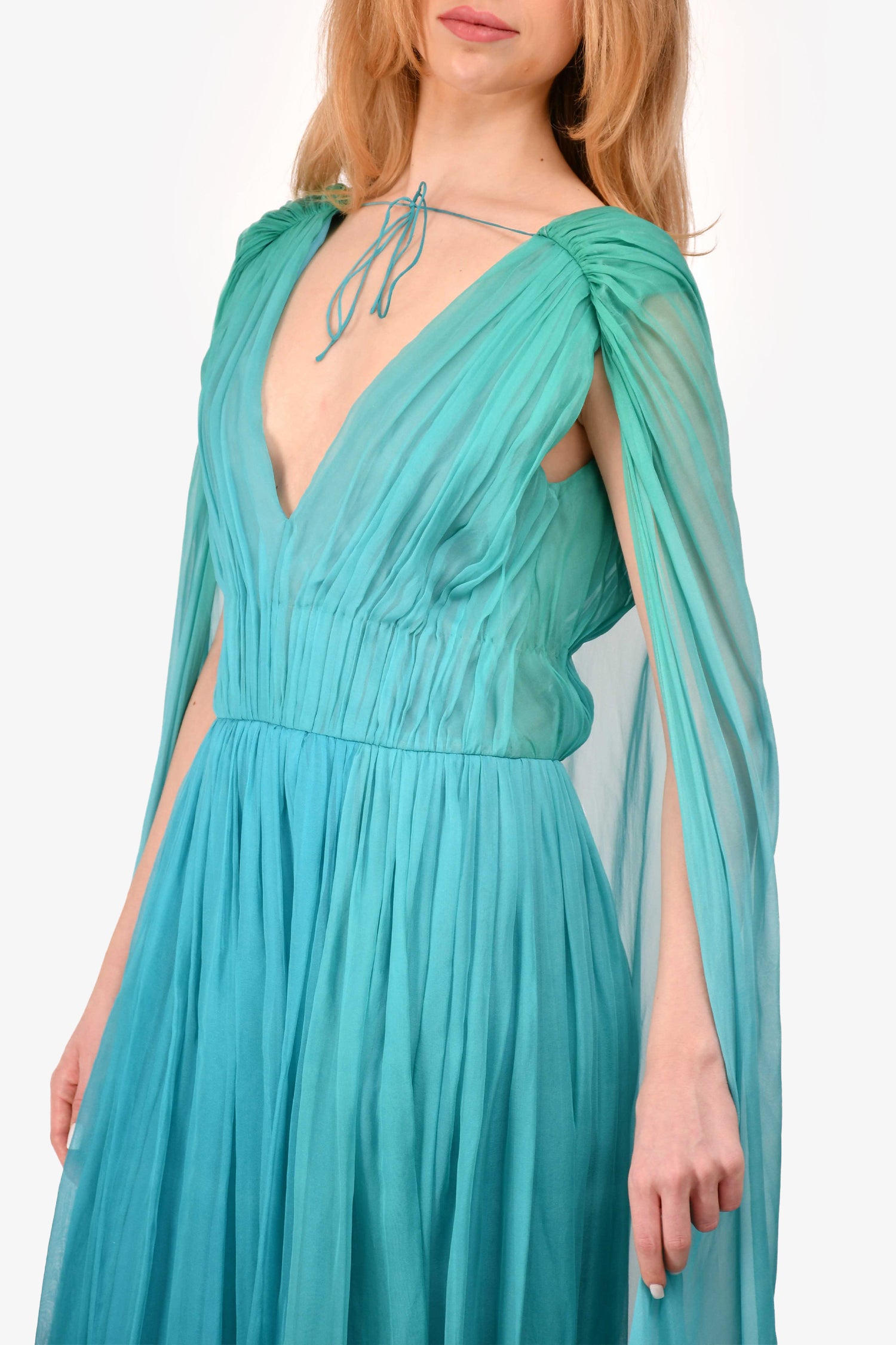 Refresh availabilityAlberta Ferretti Green Silk Ombre Sleeveless Pleated Dress. V-neckline. Cape attached. Side zipper closure. Interior leotard closure. Tonal hardware. Pleated throughout. Tonal stitching.