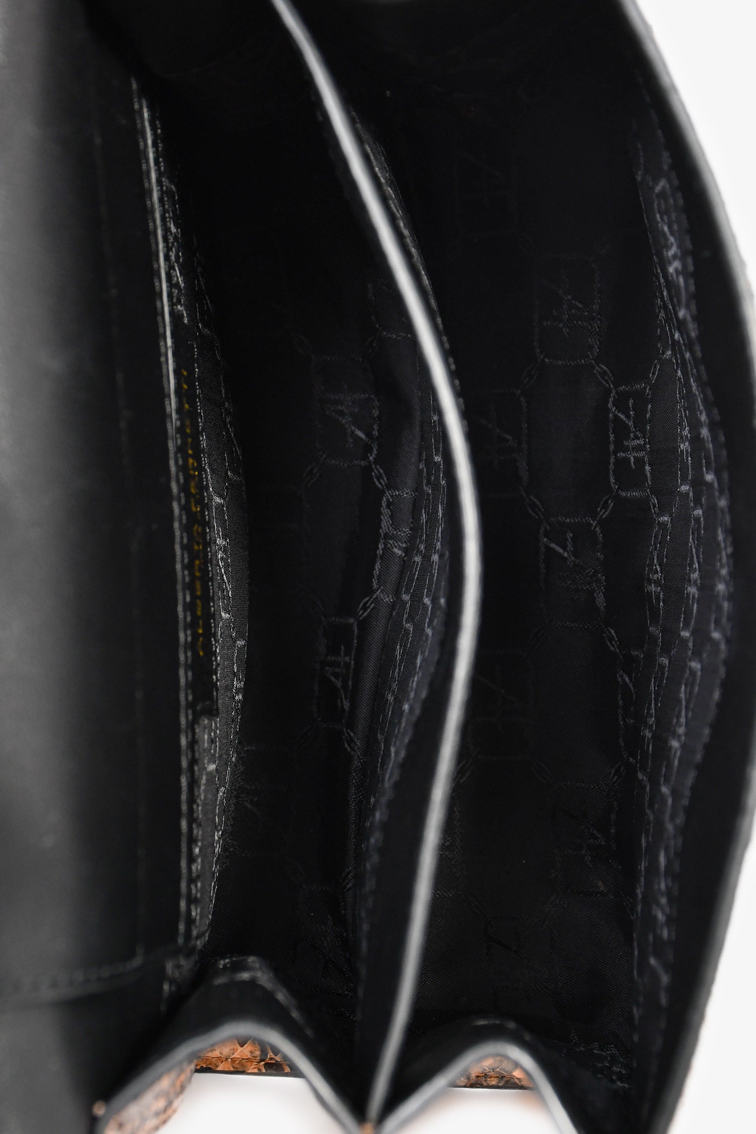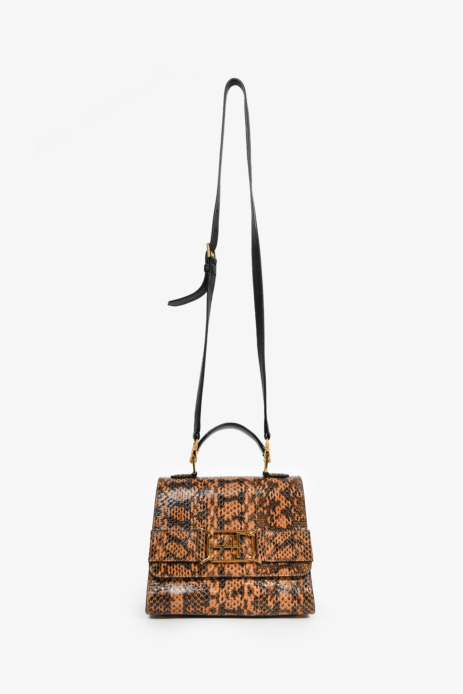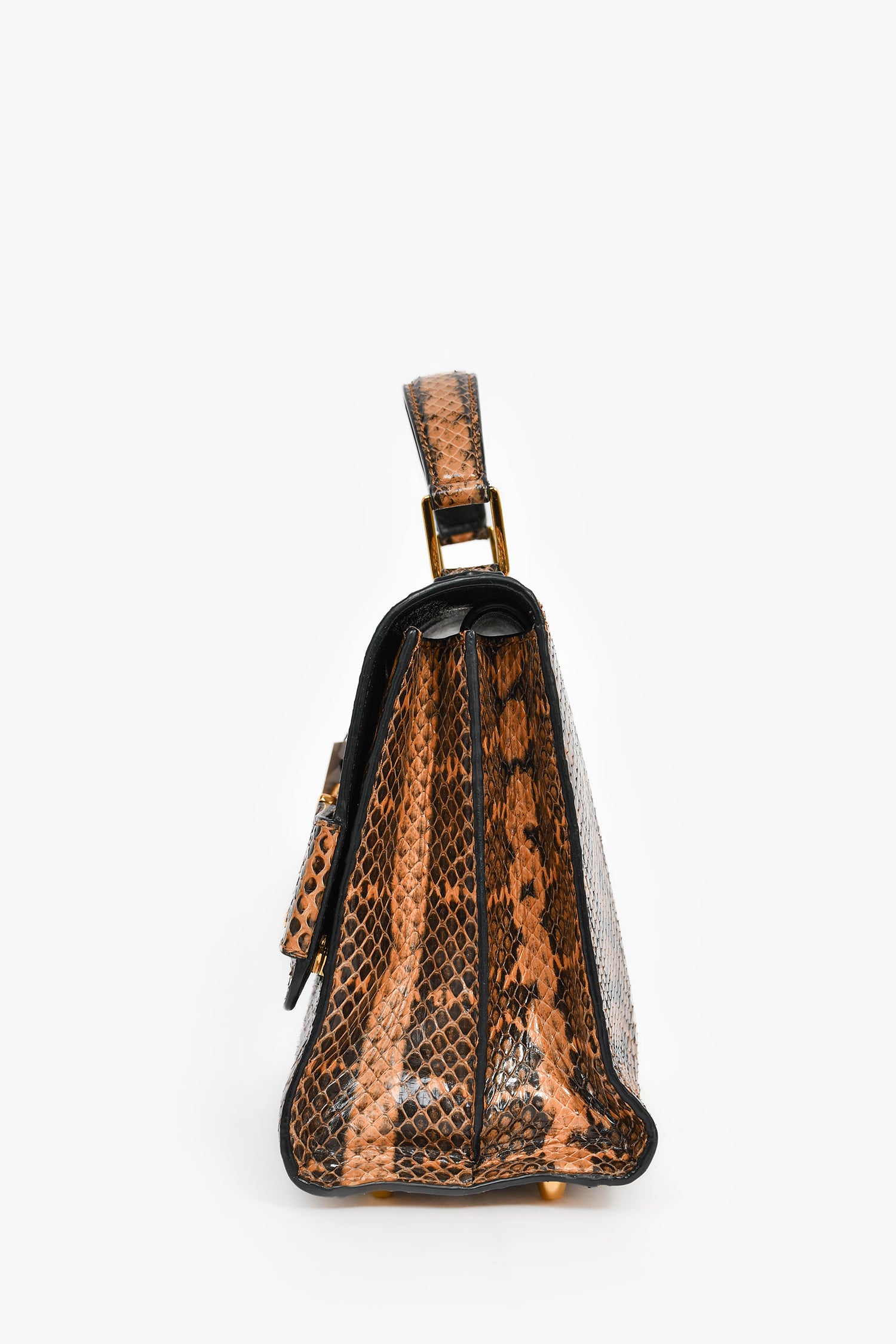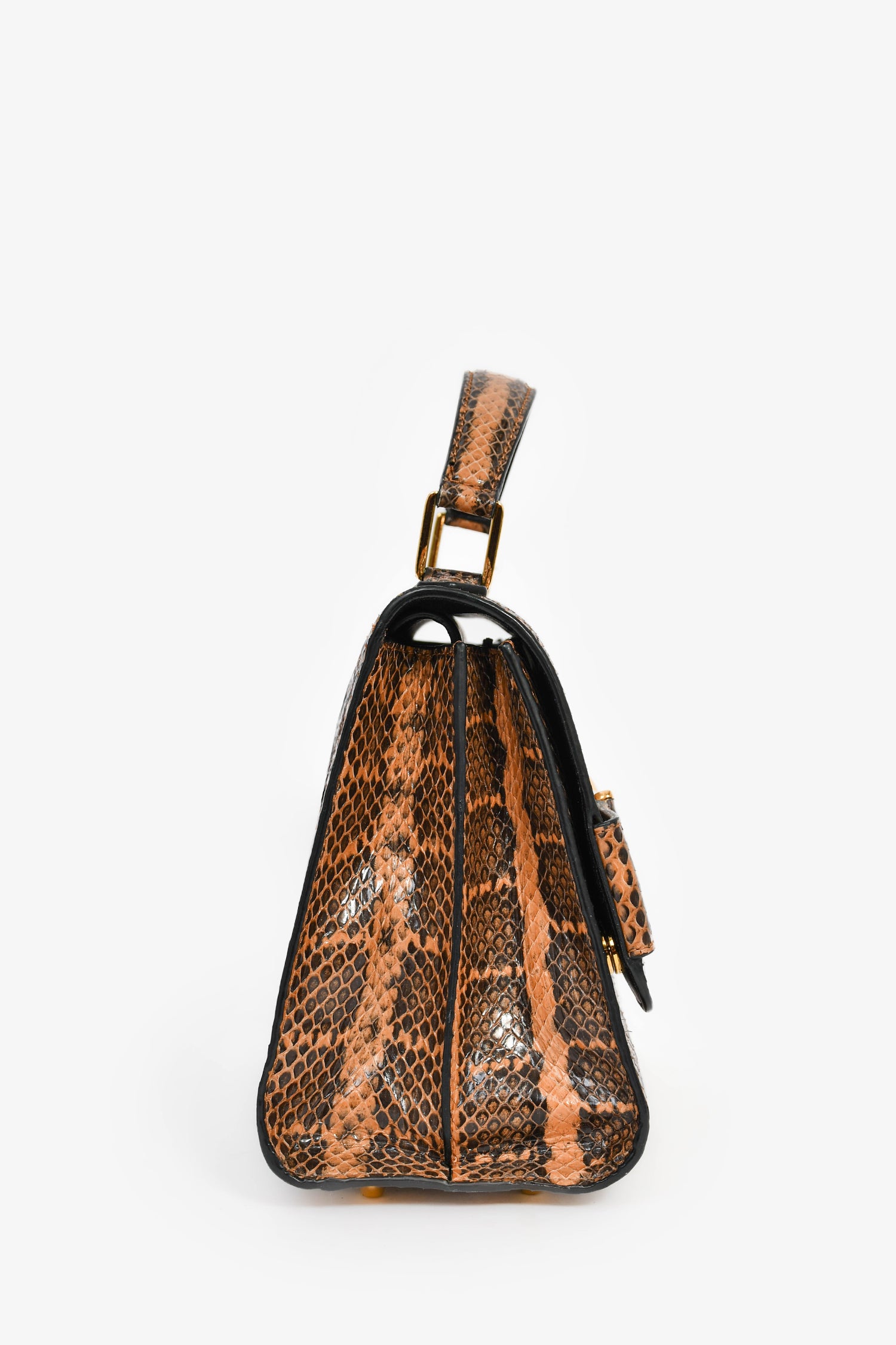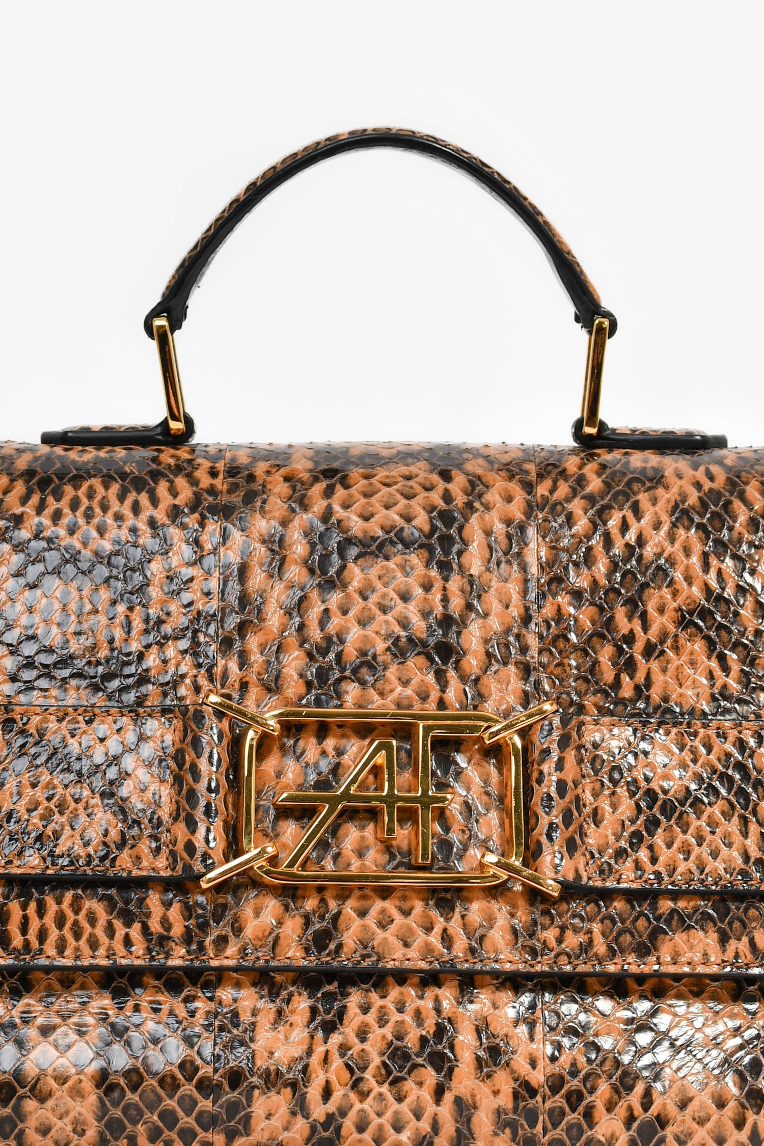 Refresh availabilityAlberta Ferretti Orange/Brown Snakeskin Top Handle Bag. Front fold-over flap with magnetic button closures. Black leather interior lining. Two interior compartments; separated by a divider. Gold-tone hardware. Detachable strap.