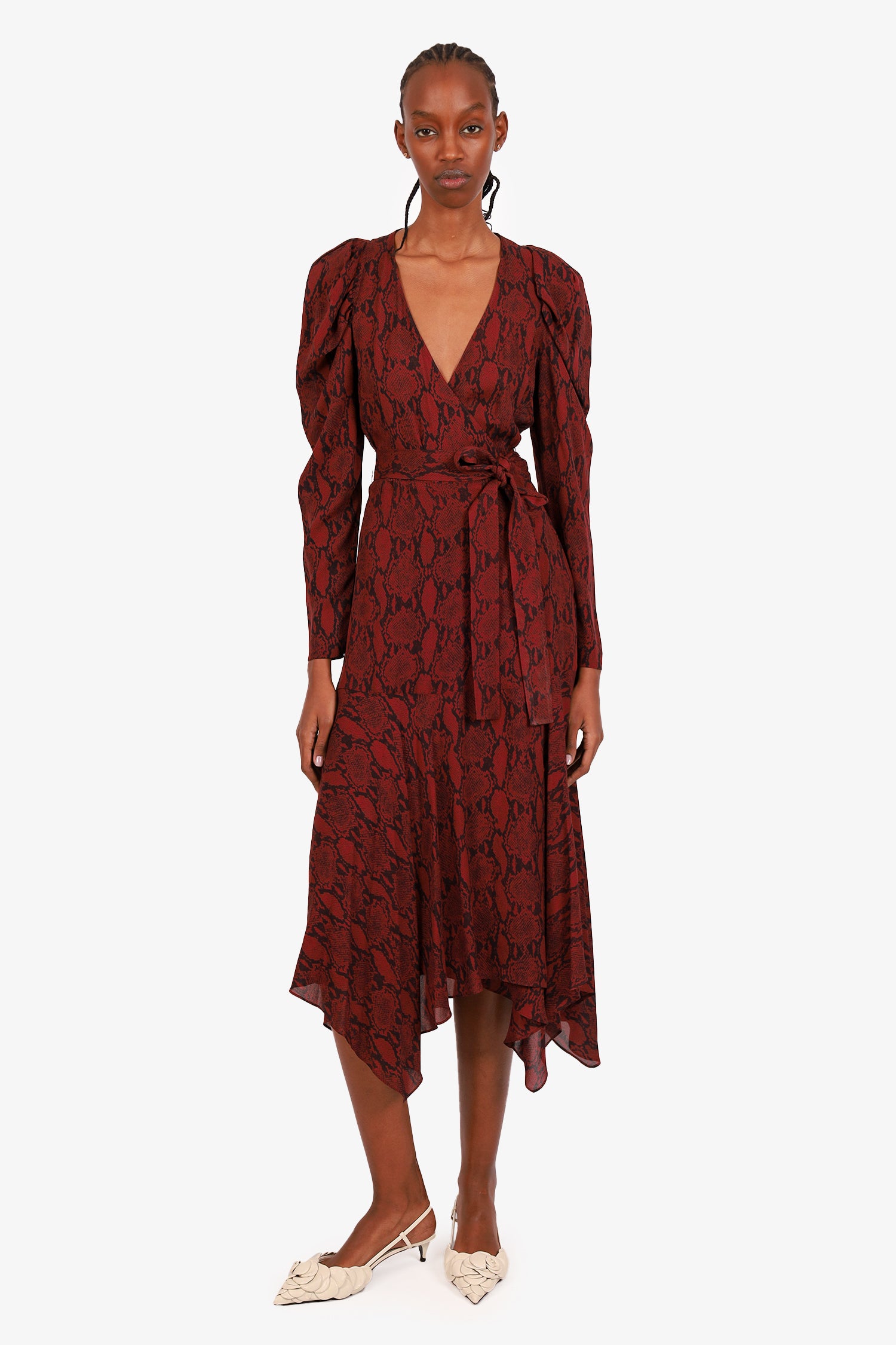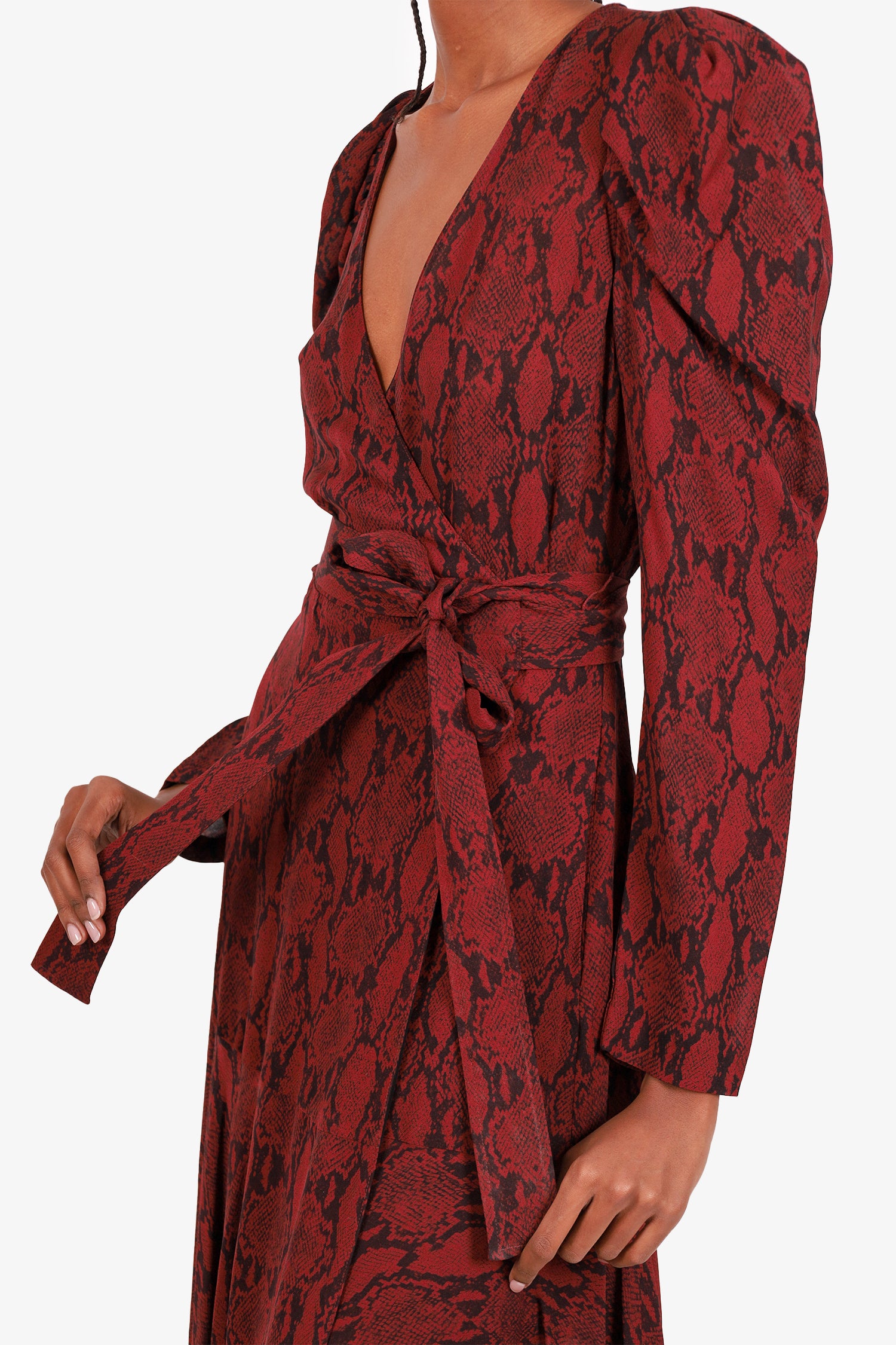 Refresh availabilityALC Red/Black Silk Snake Print Maxi Dress. V-neckline. Side tie closure. Long-sleeves. Tonal stitching.