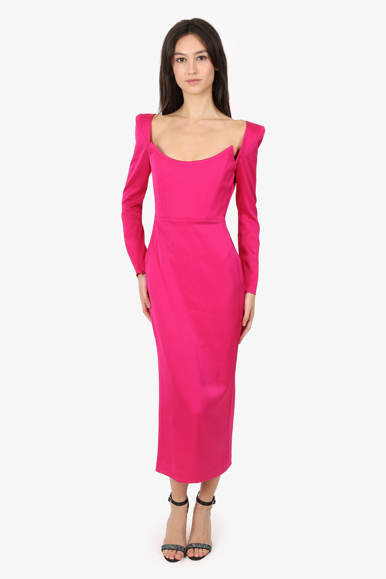 Refresh availabilityAlex Perry Pink Satin Long Sleeve Gown. Slip-on. Round neckline. Rear zip closure. Padded shoulder. Sleeve cuffs with zip closure. Lined interior. Built-in boning. Tonal stitching.