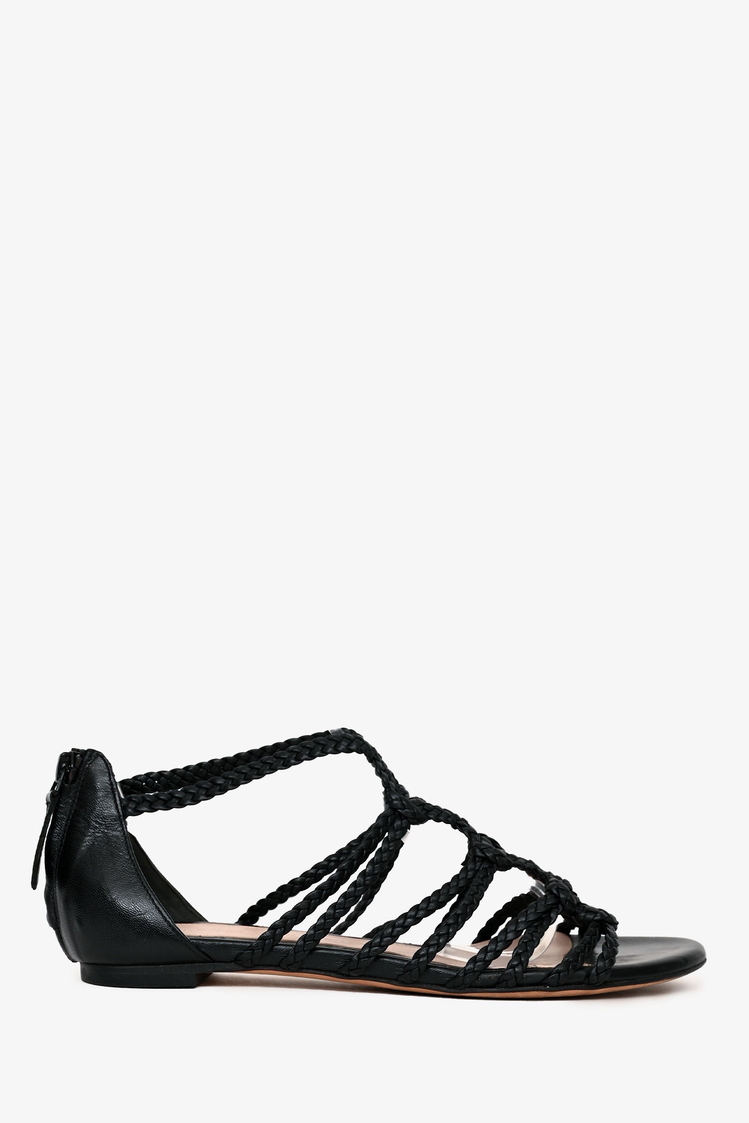 Refresh availabilityAlexander McQueen Black Leather Braided Sandals. Open toe. Braided leather straps. Back zip closure. Flat sole. Tonal stitching.
