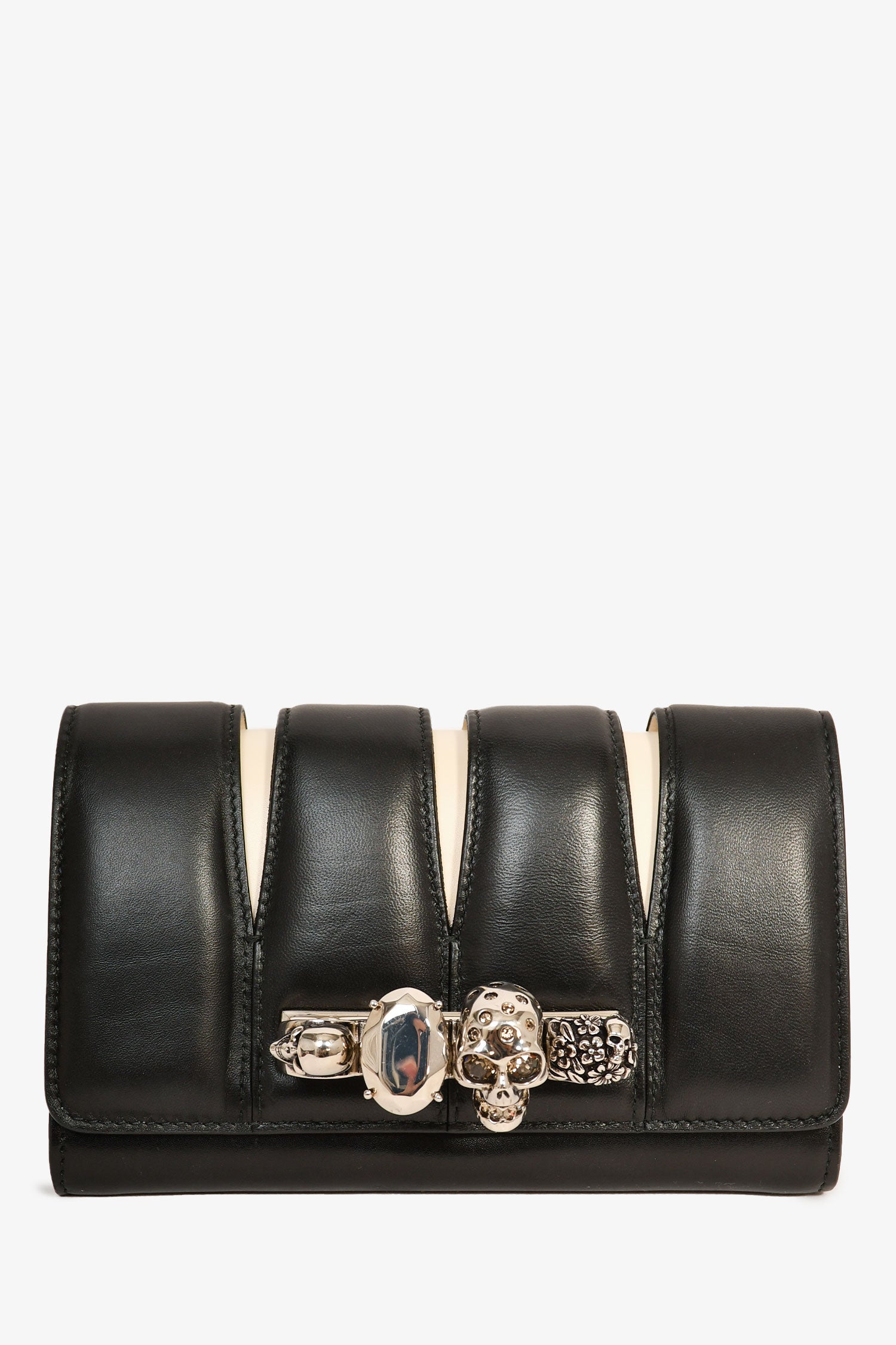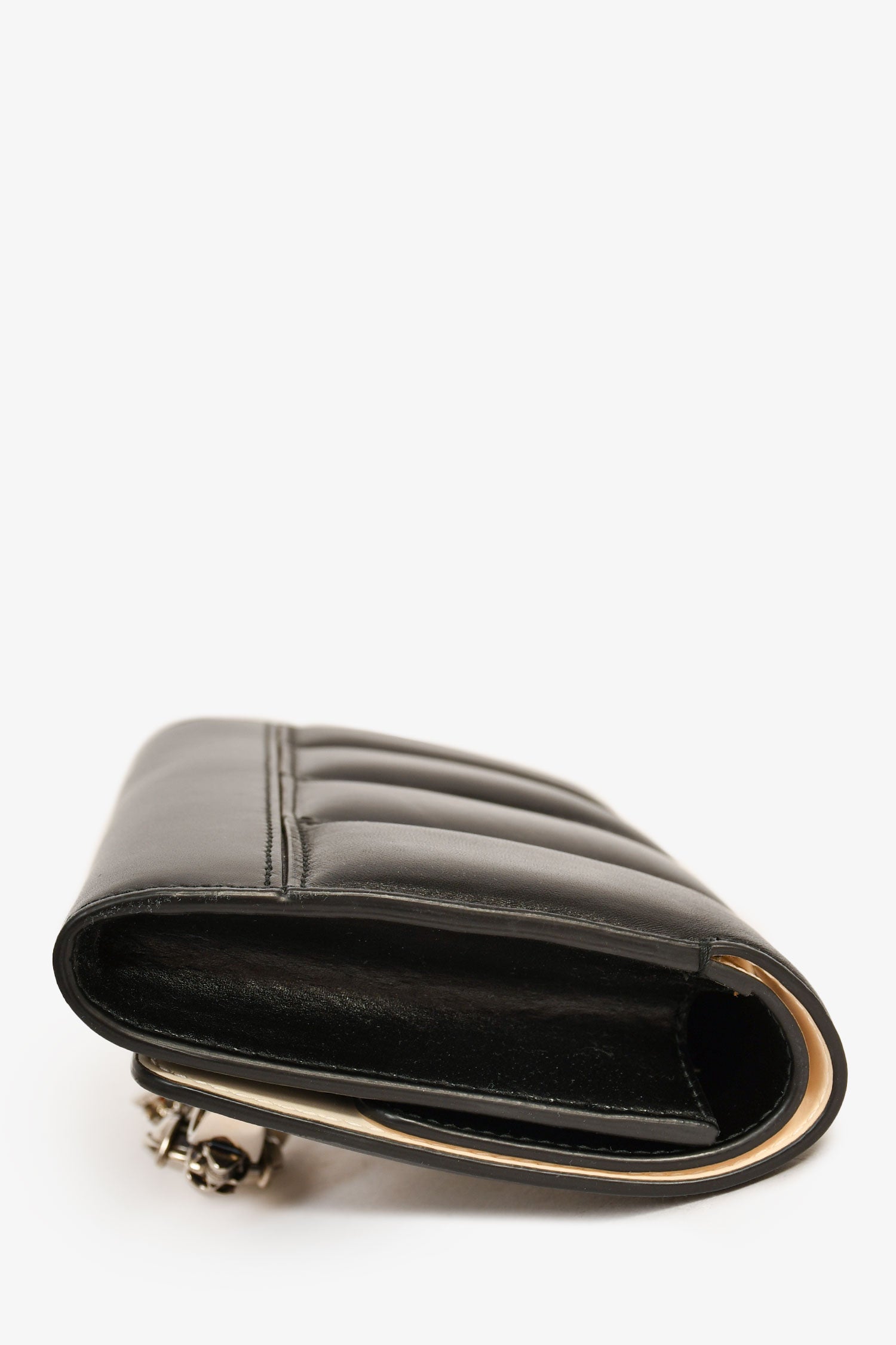 Refresh availabilityAlexander McQueen Black/Leather 'Slash' Clutch Bag with Chain. Front fold-over double flap with magnetic and snap button closure. Single interior compartment with a card slot and a wall slip pocket. Crystal details. Silver-tone hardware. Tonal stitching.
