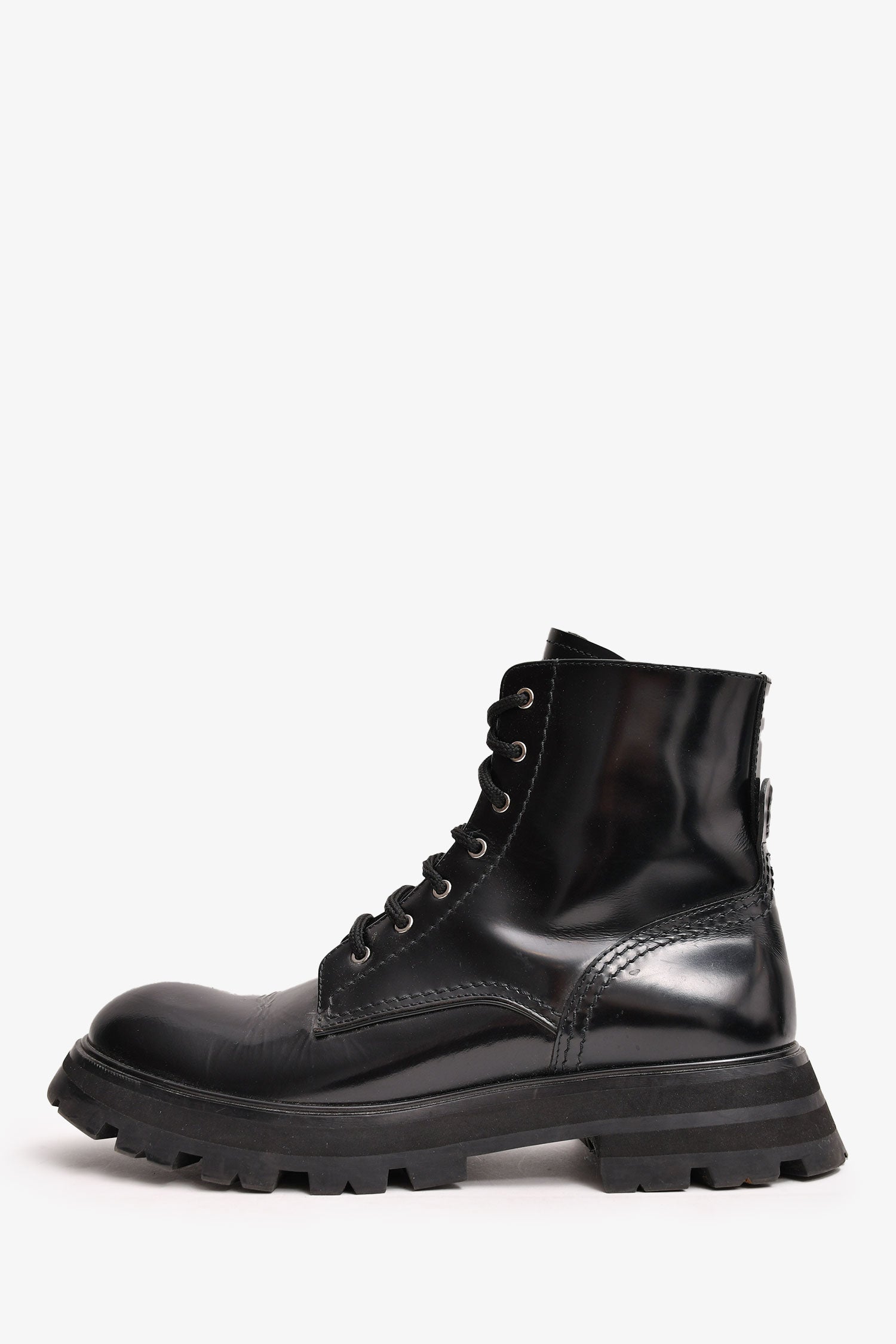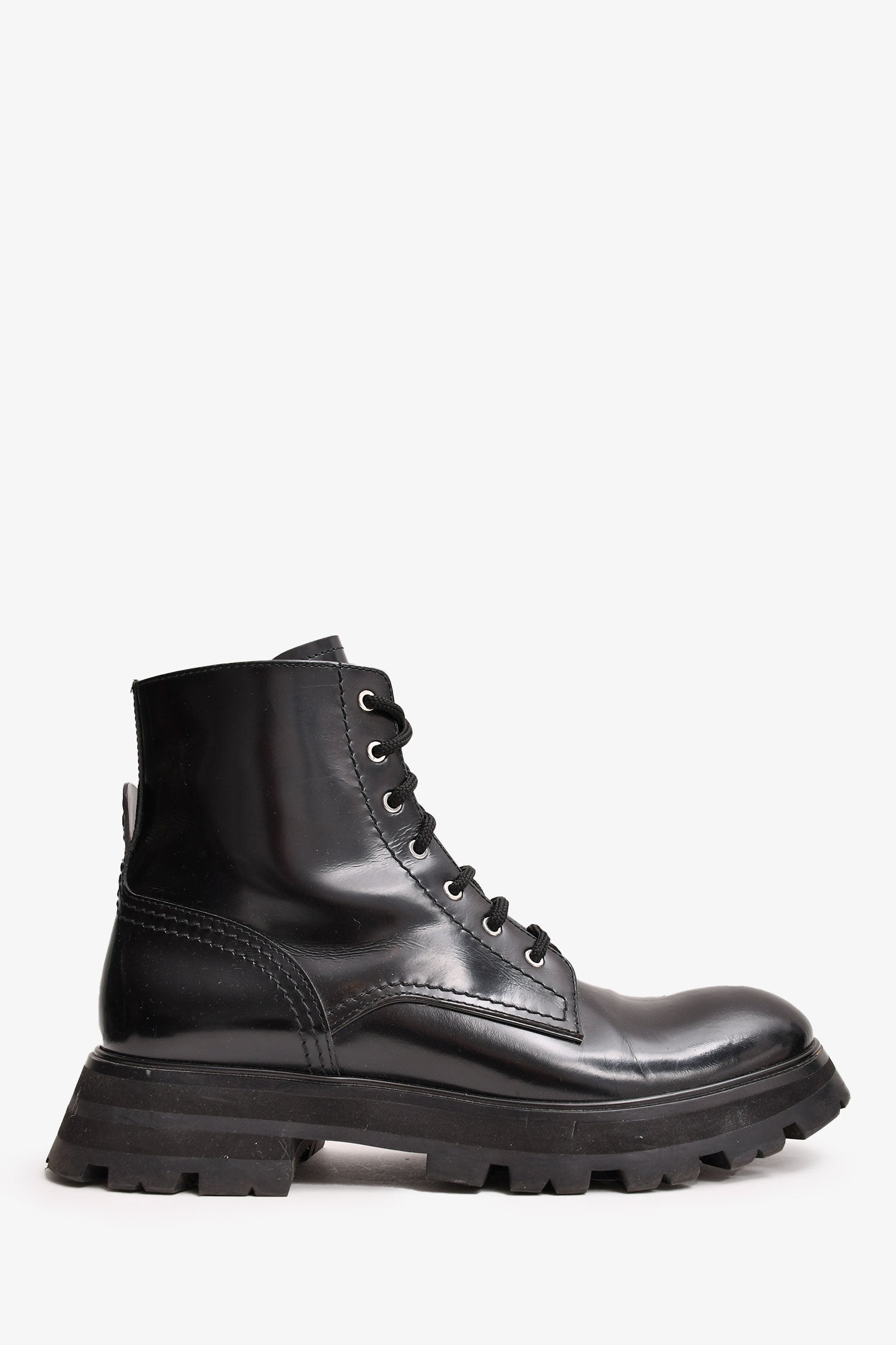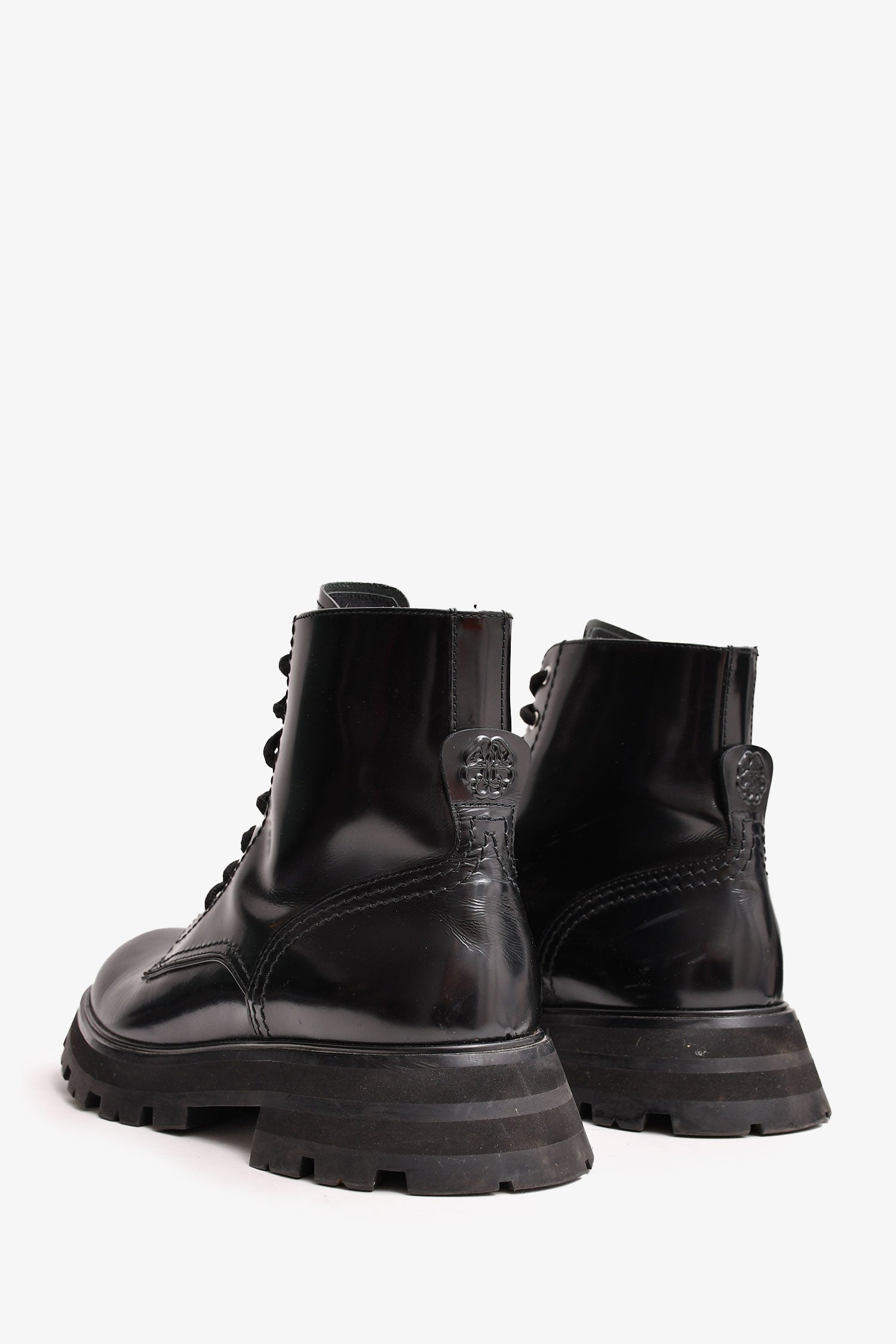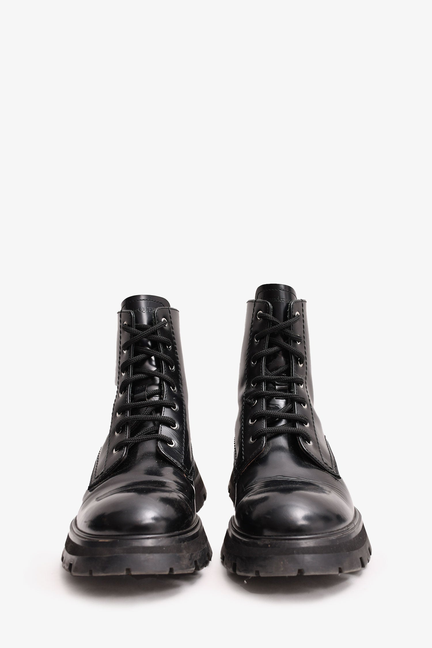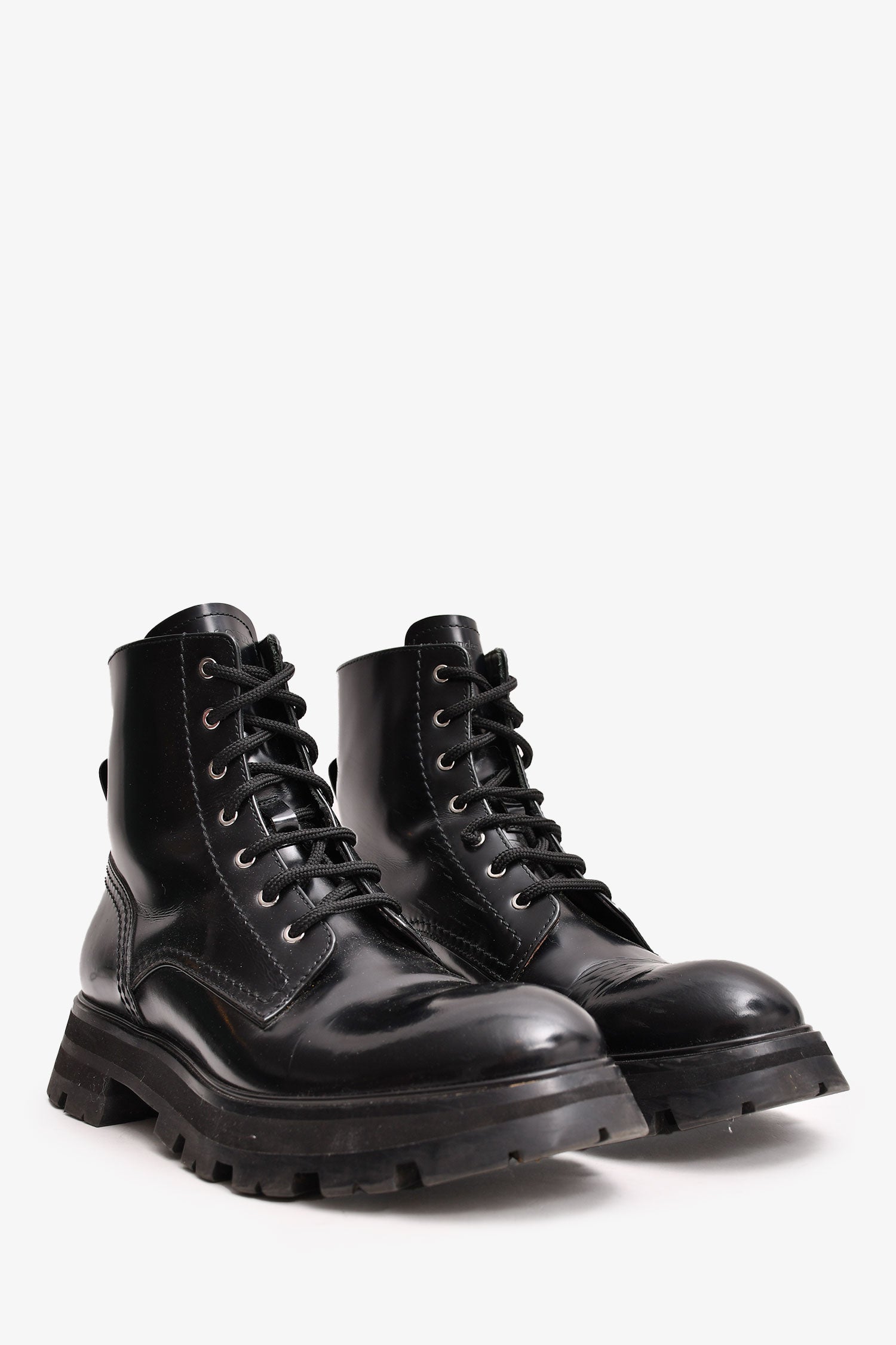 Refresh availabilityAlexander McQueen Black Patent Lace-Up Combat Boots. Round toe. Treaded bottoms. Glossy finish.