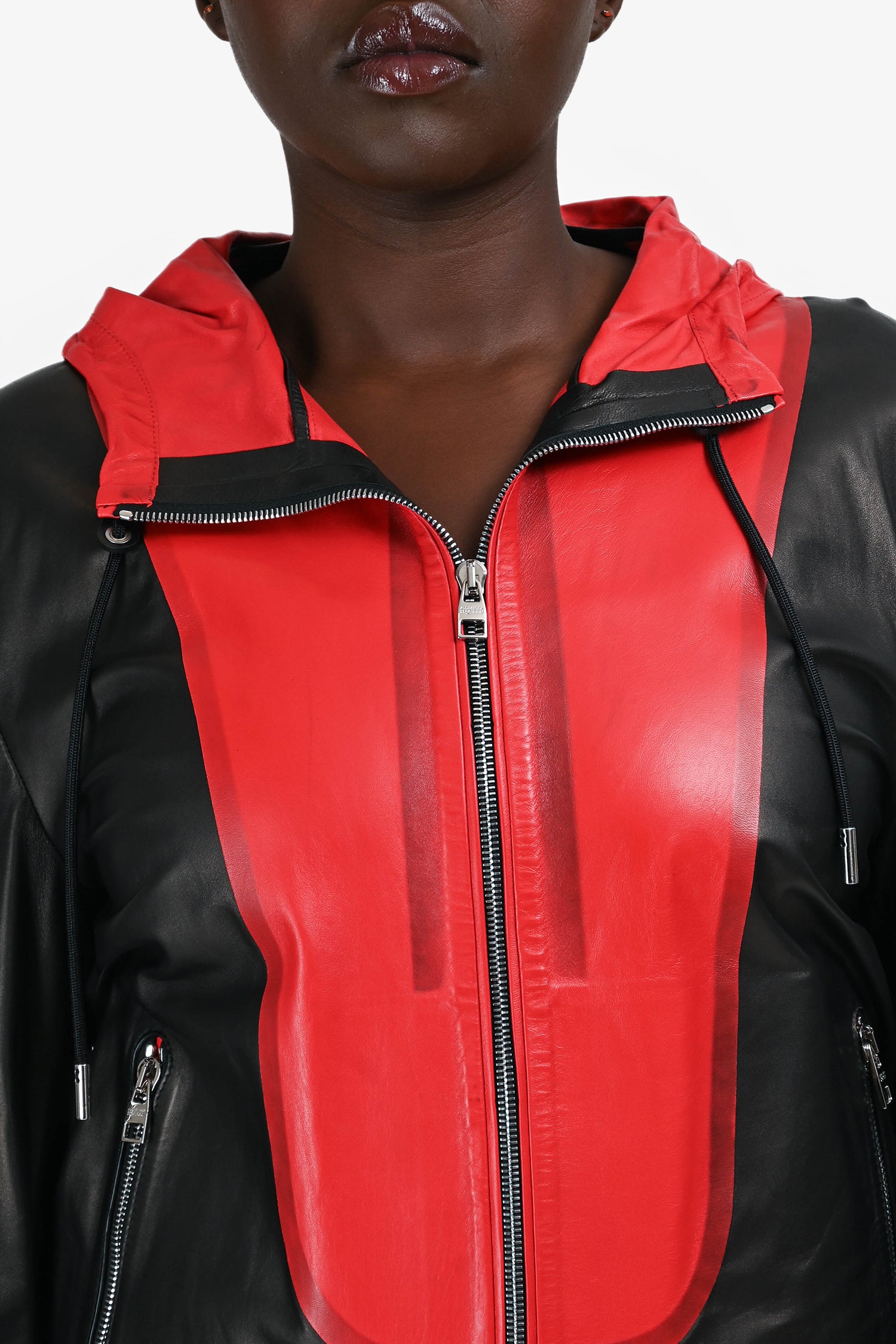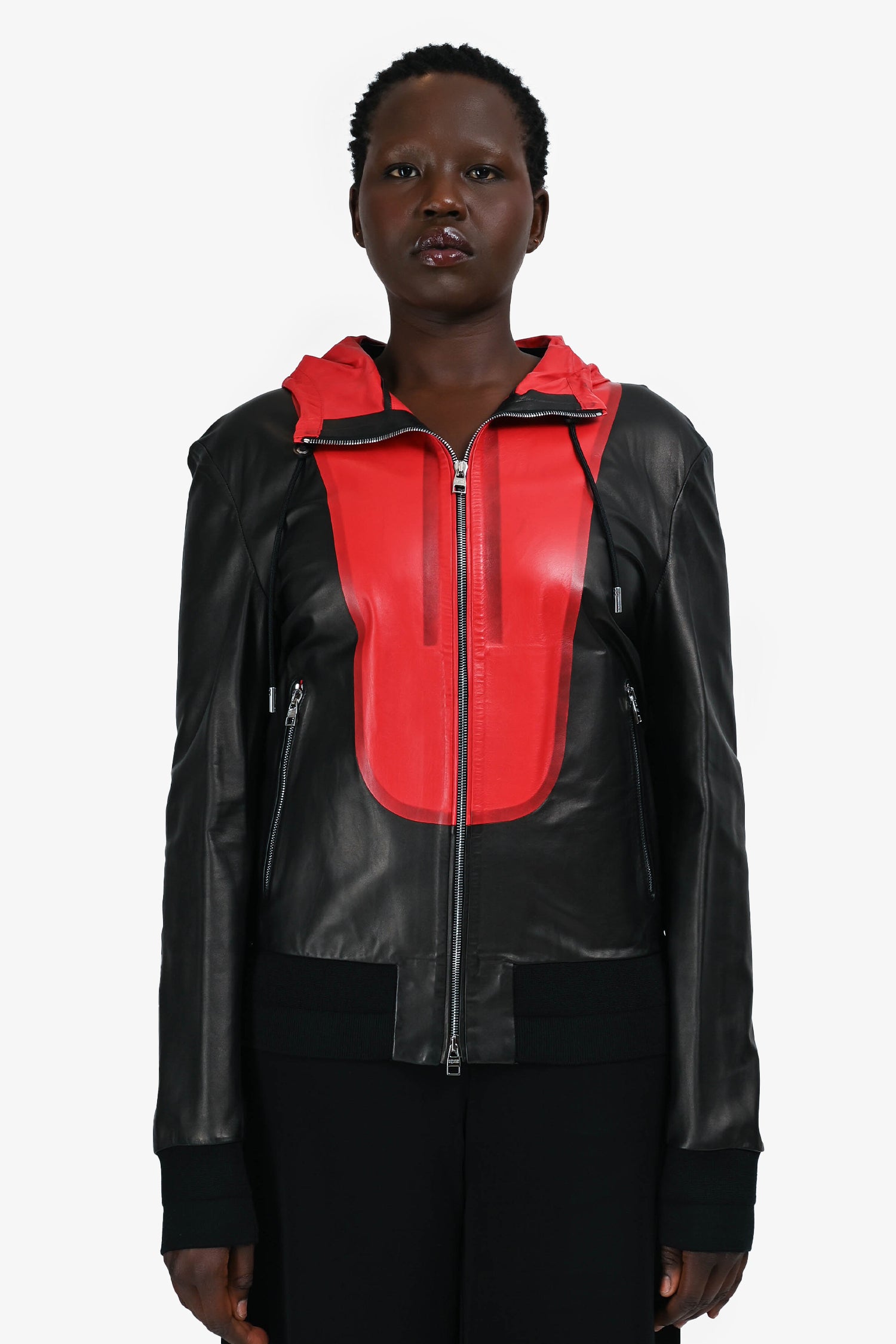 Refresh availabilityAlexander McQueen Black/Red Leather Hooded Zip Jacket. Drawstring fastening on the hood. Front zip-up closure. Ribbed hem and cuffs. Two side pockets with zip closure. Tonal stitching.