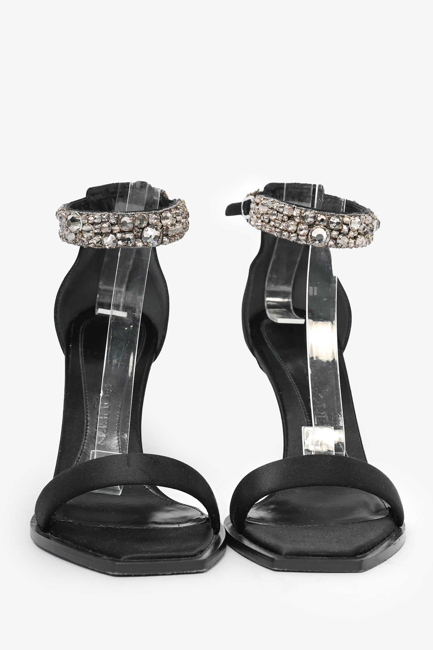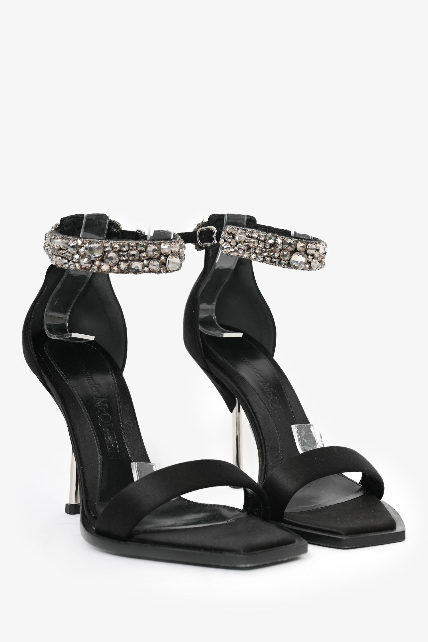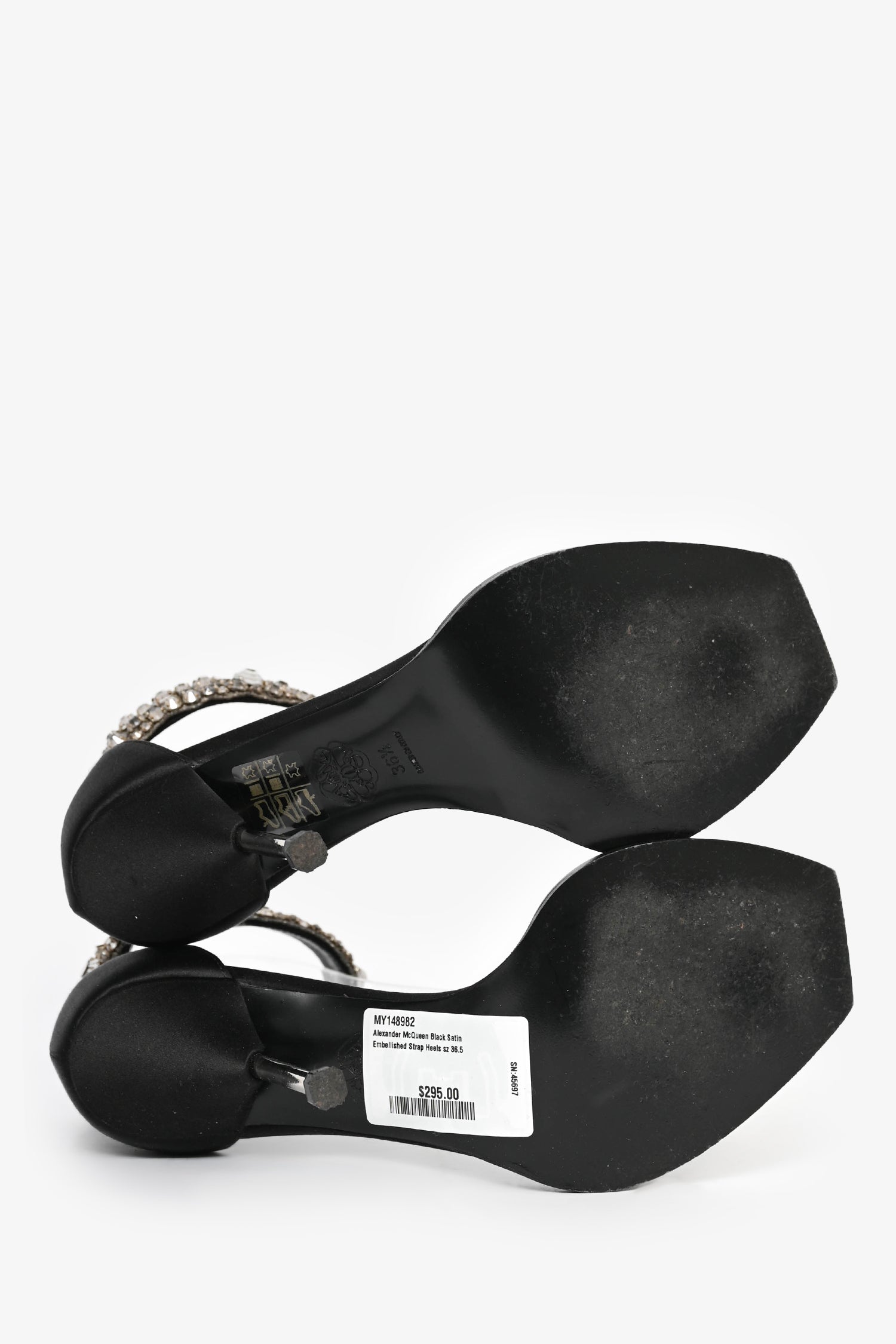 Refresh availabilityAlexander McQueen Black Satin Embellished Strap Heels. Crystallized ankle strap with adjustable buckle closure. Open-square toe. Tonal stitching.