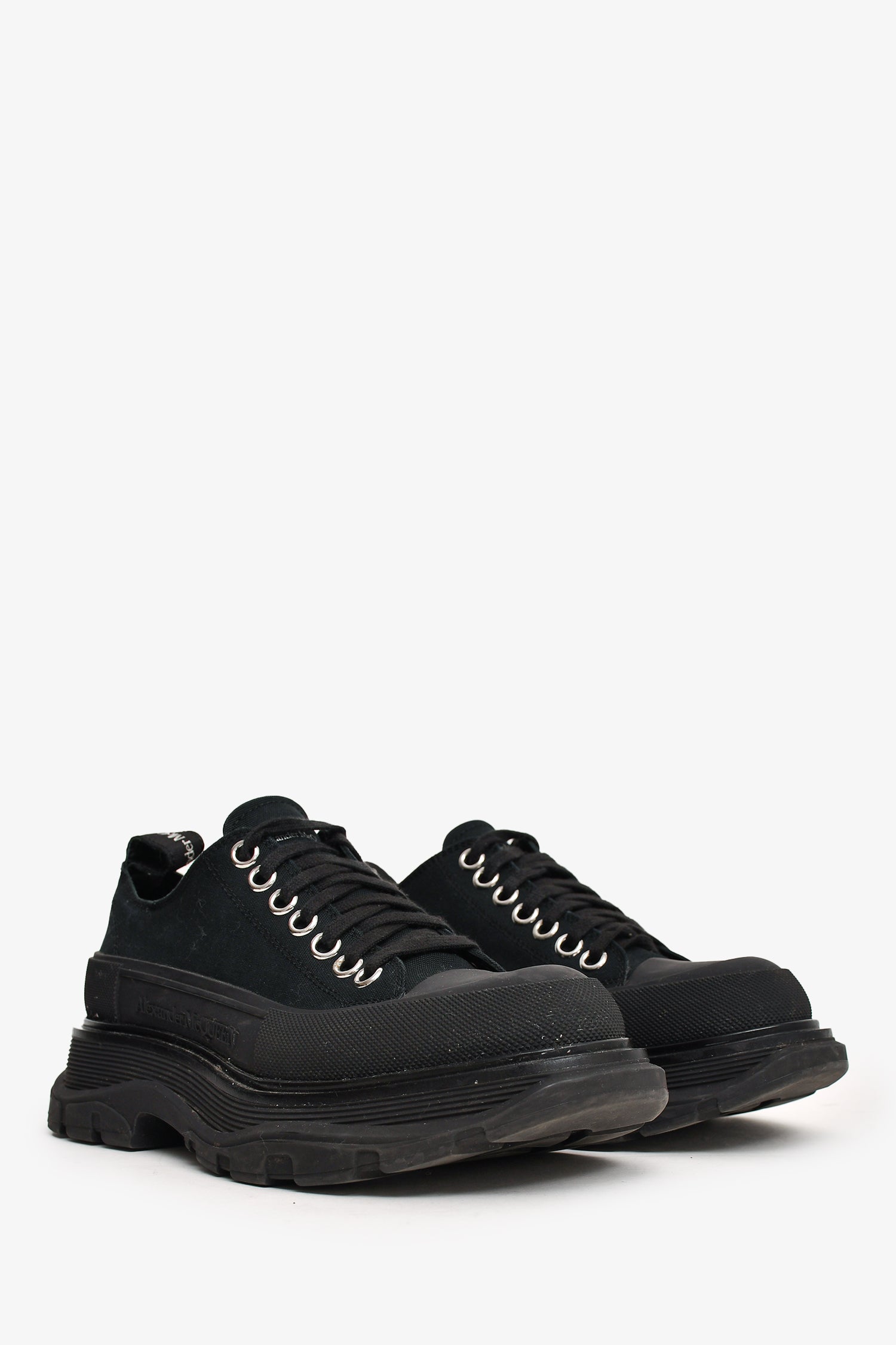 Refresh availabilityAlexander McQueen Black Tread Slick Lace Up Sneakers. Rubberized soles. Silver-tone hardware. Lace-front closure. Tonal stitching.