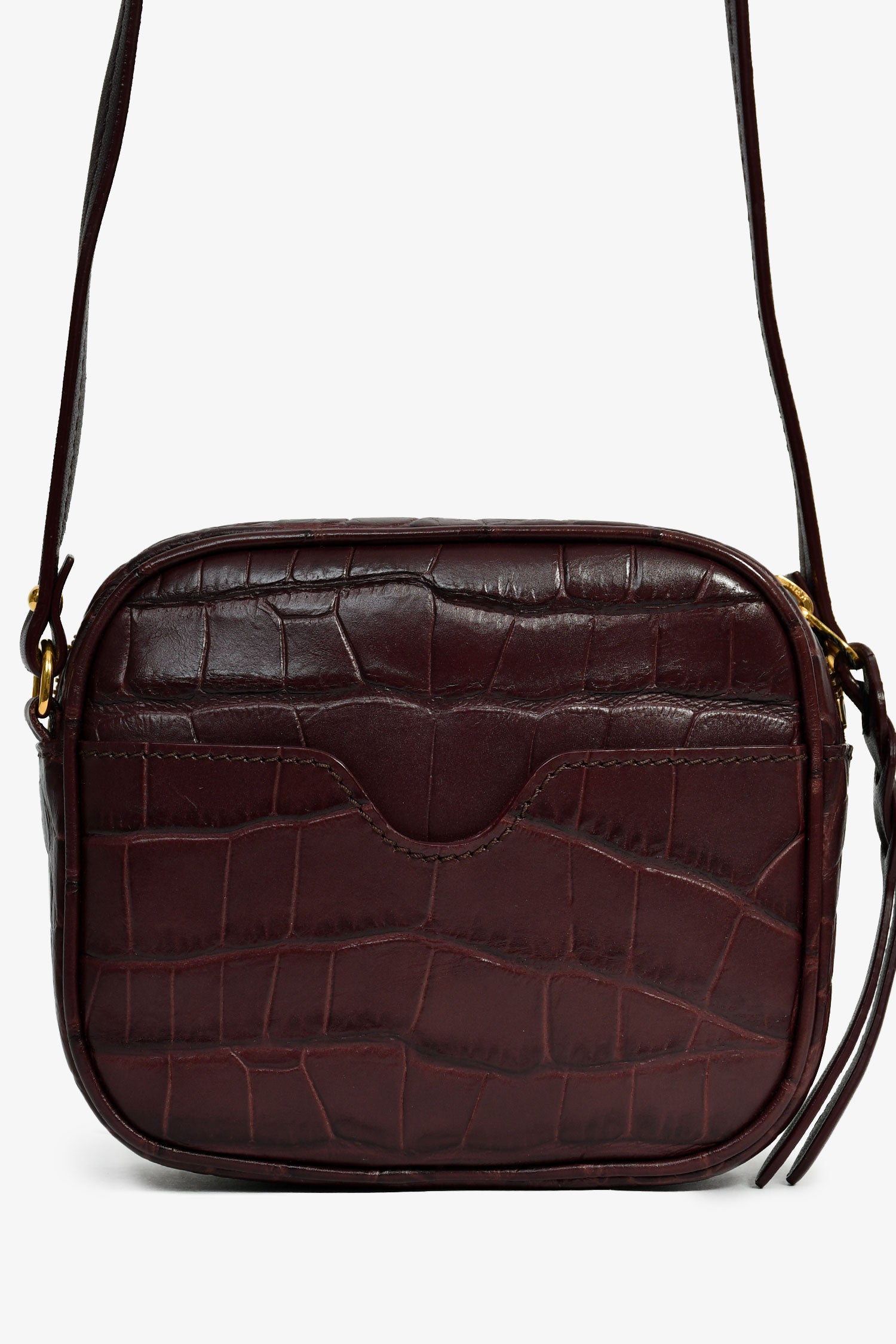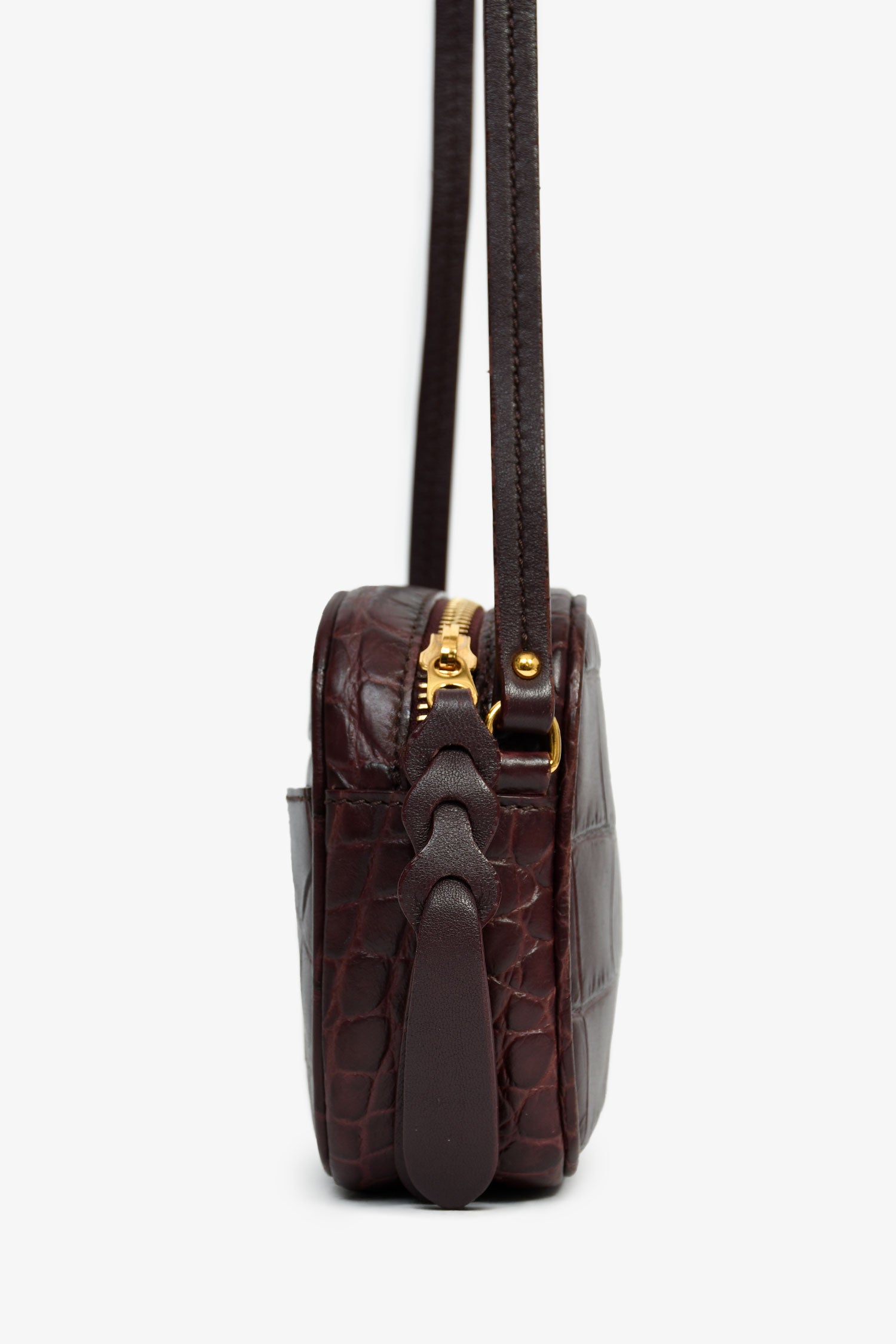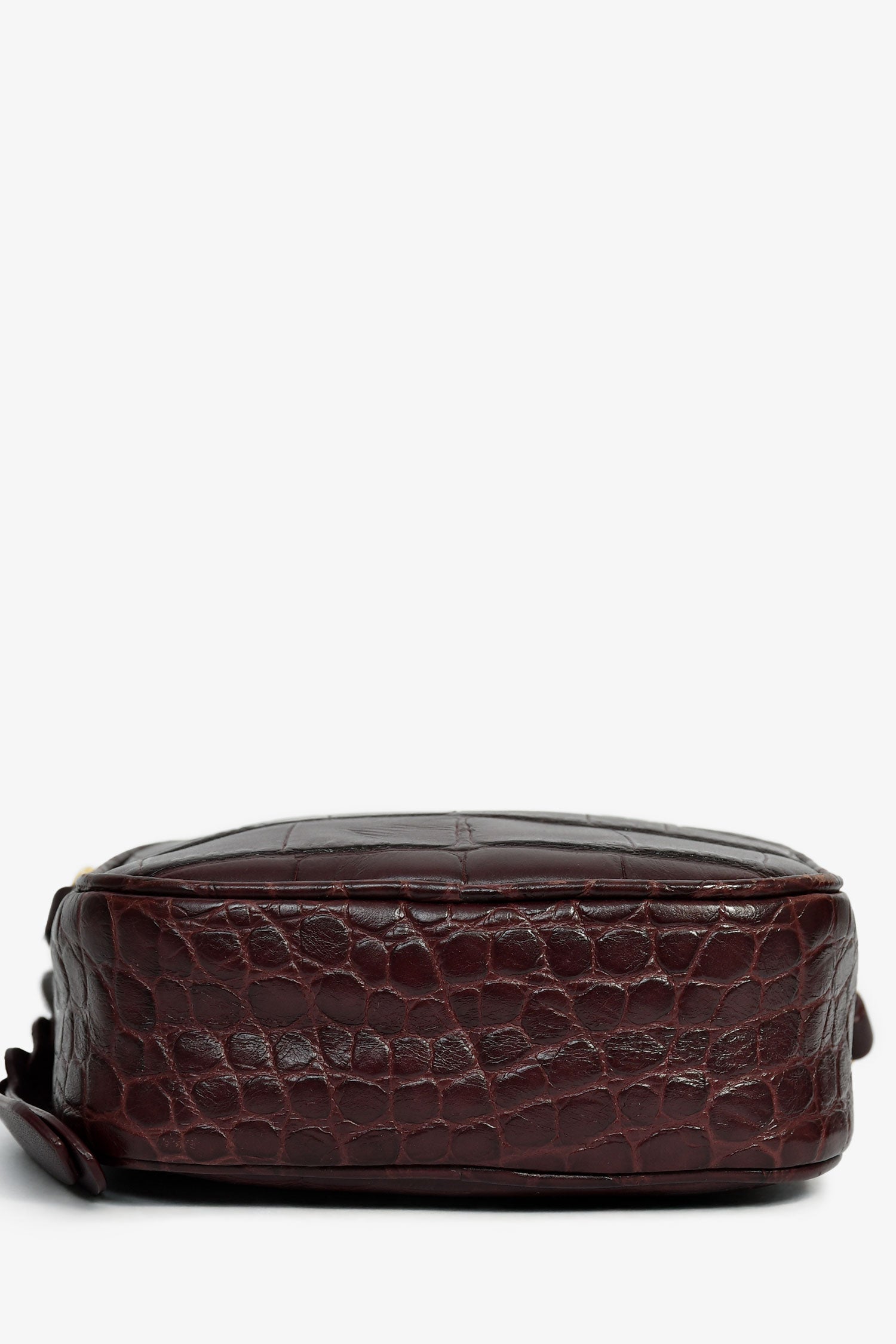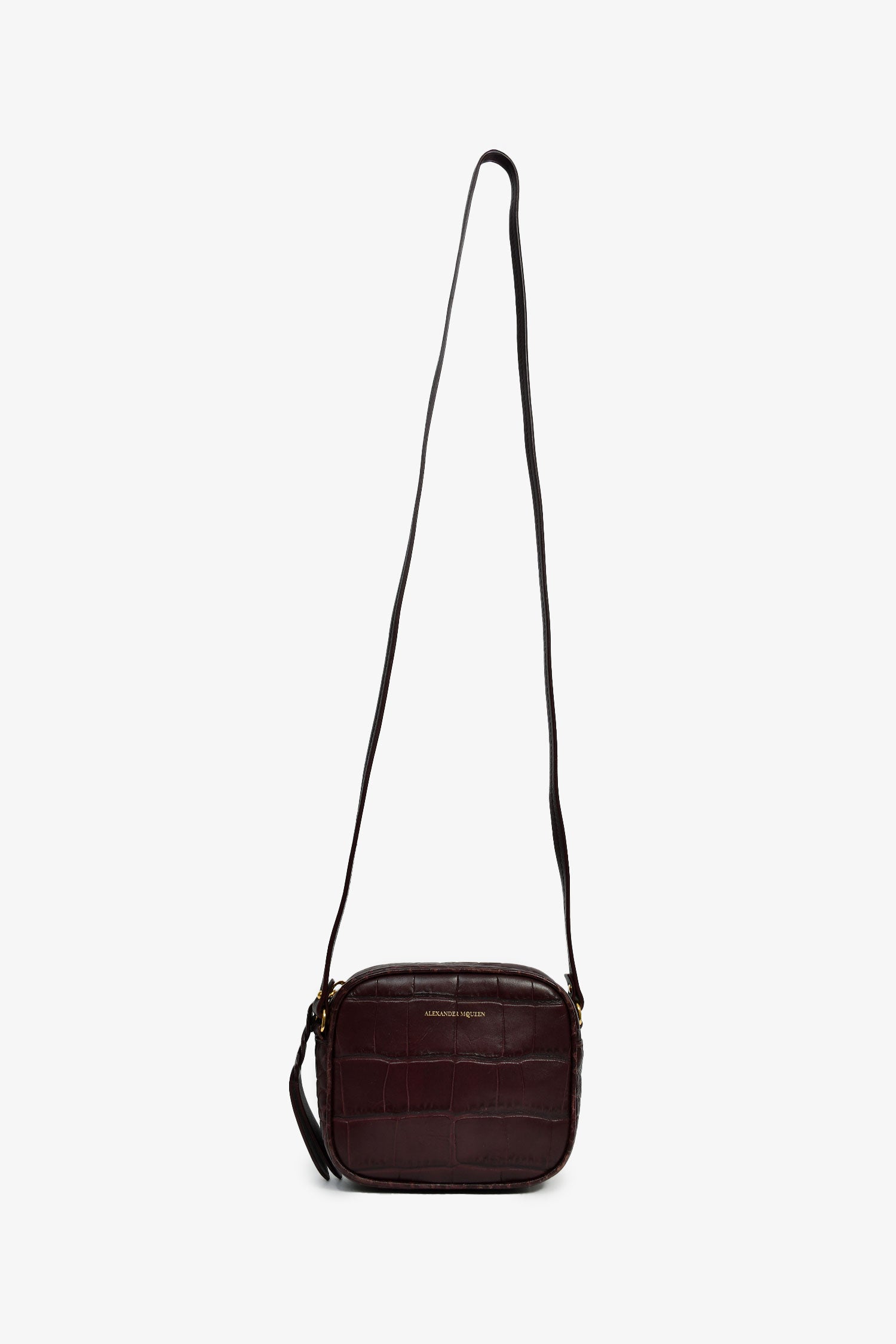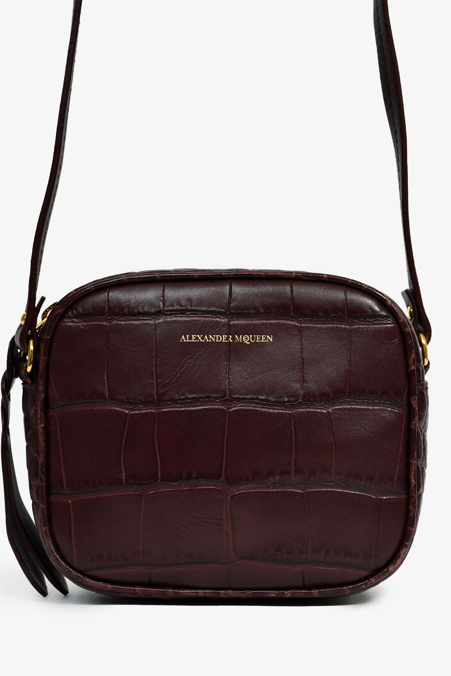 Refresh availabilityAlexander McQueen Burgundy Croc Effect Mini Camera Crossbody. Top zip closure. Suede lined interior. Single interior card slip pocket. Rear exterior slip pocket. Single crossbody strap. Tonal stitching. Gold-tone hardware.