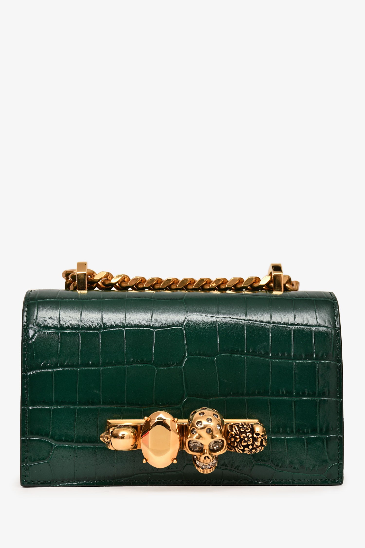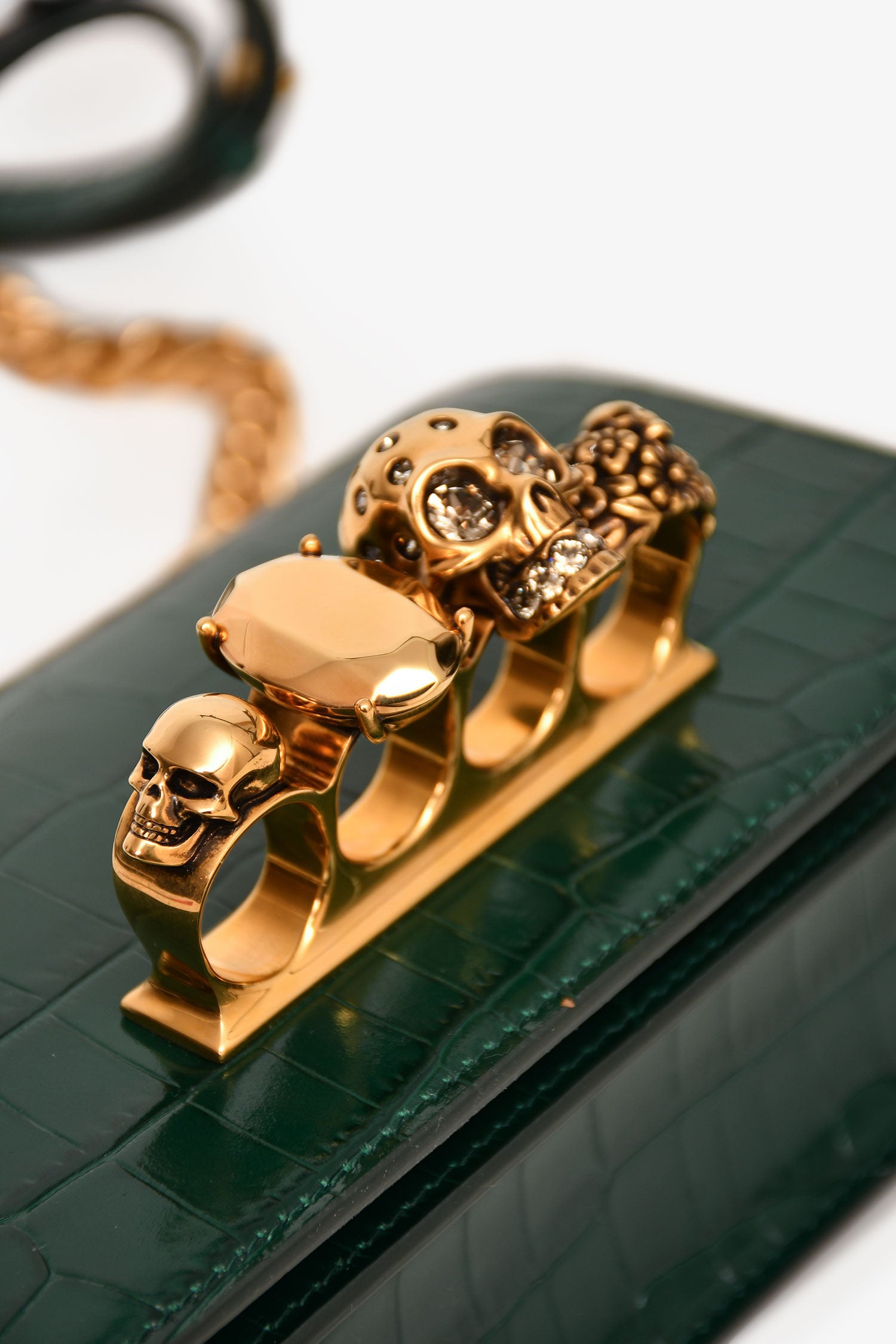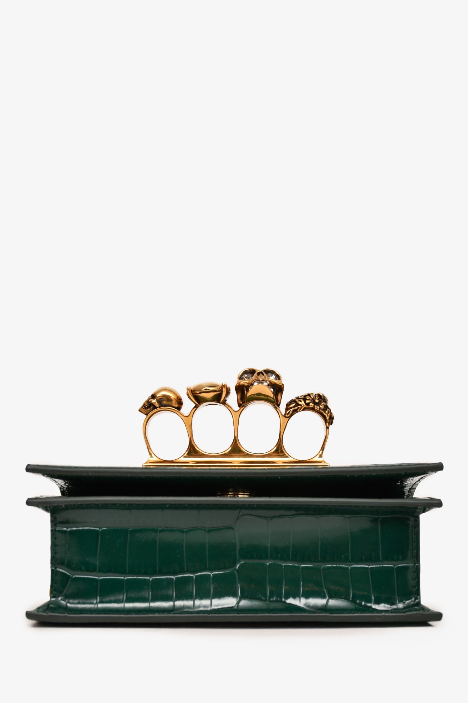 Refresh availabilityAlexander McQueen Green Croc Embossed Knuckle Crossbody. Front fold-over flap with magnetic button closure. Knuckle ring detailing on front. Single interior wall slip pocket. Tonal stitching. Gold-tone hardware.