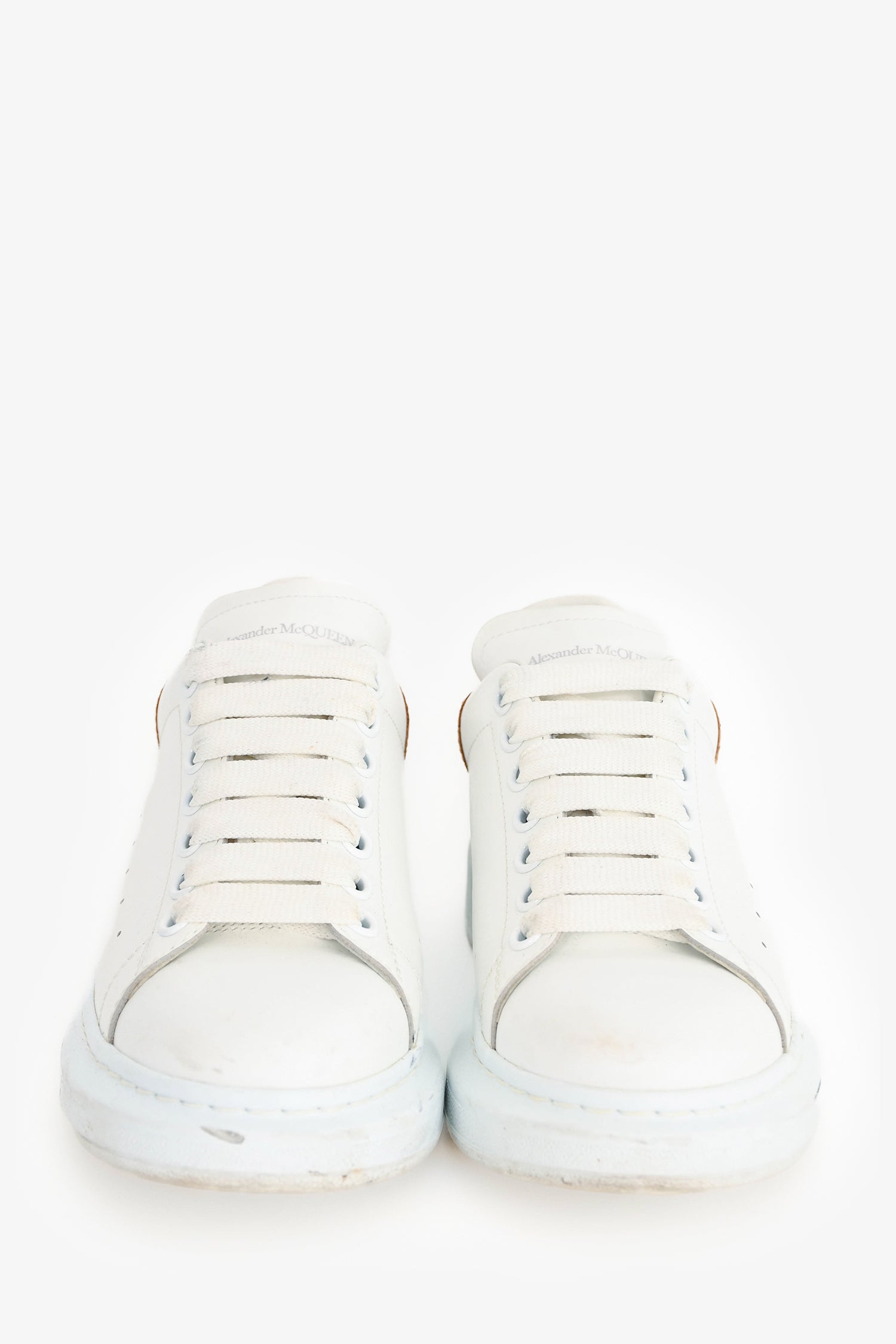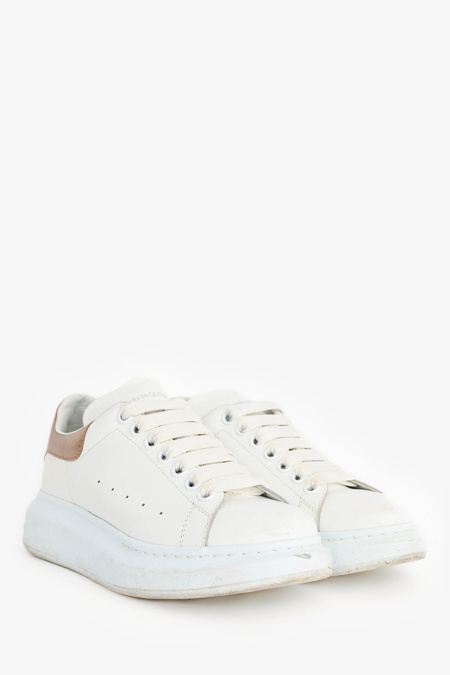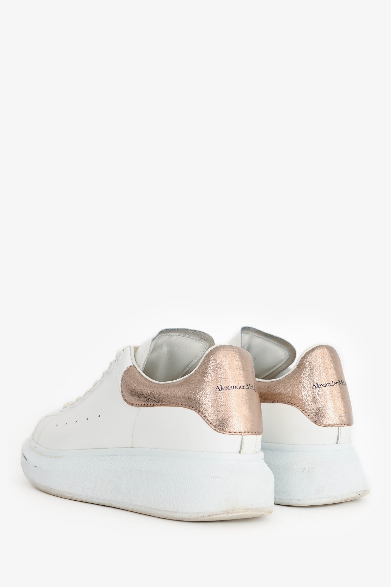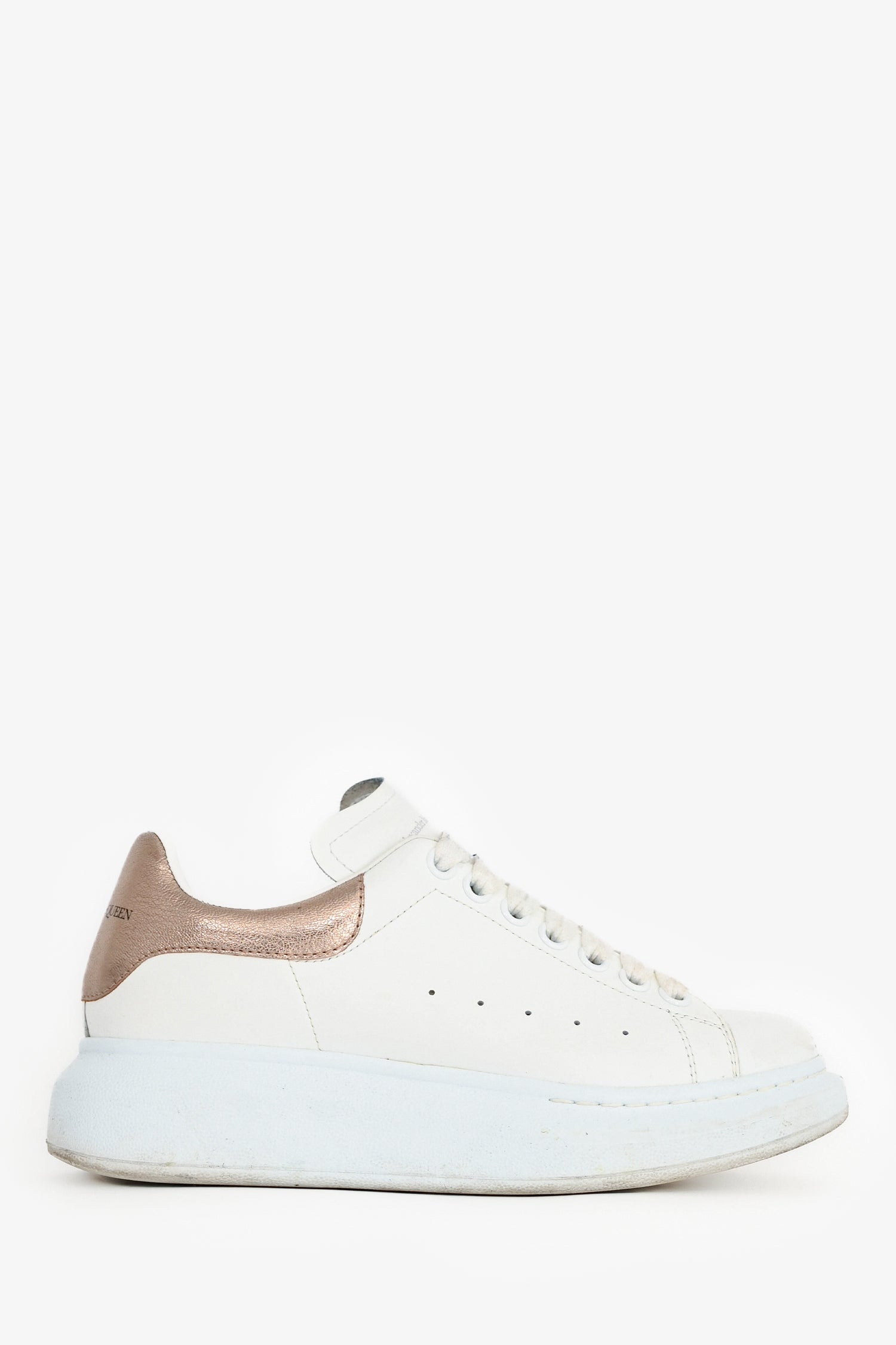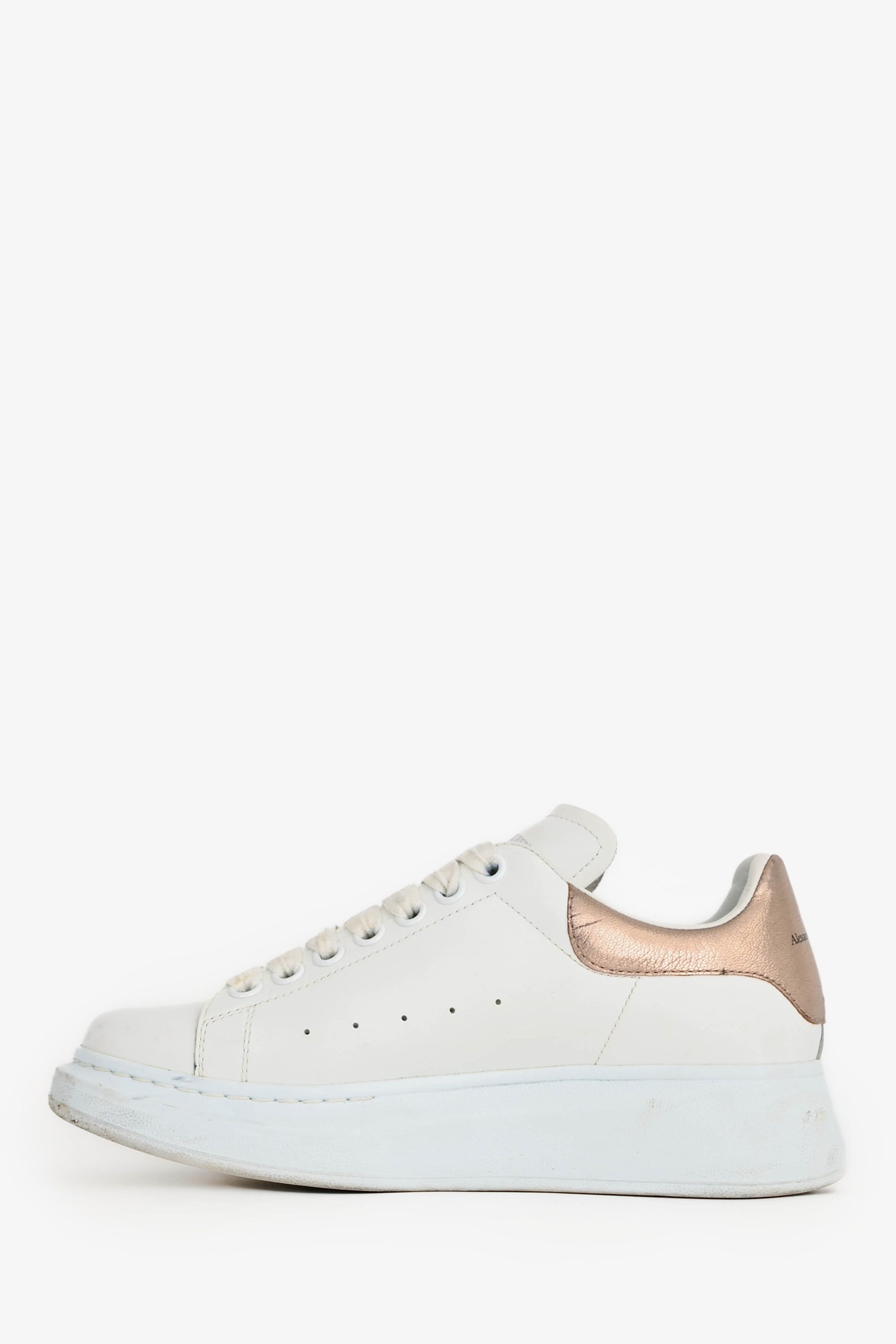 Refresh availabilityAlexander McQueen White/Copper Metallic Leather Oversize Sneakers. Round toe. Lace-up front. Contrast metallic copper heel tab. Tonal stitching.