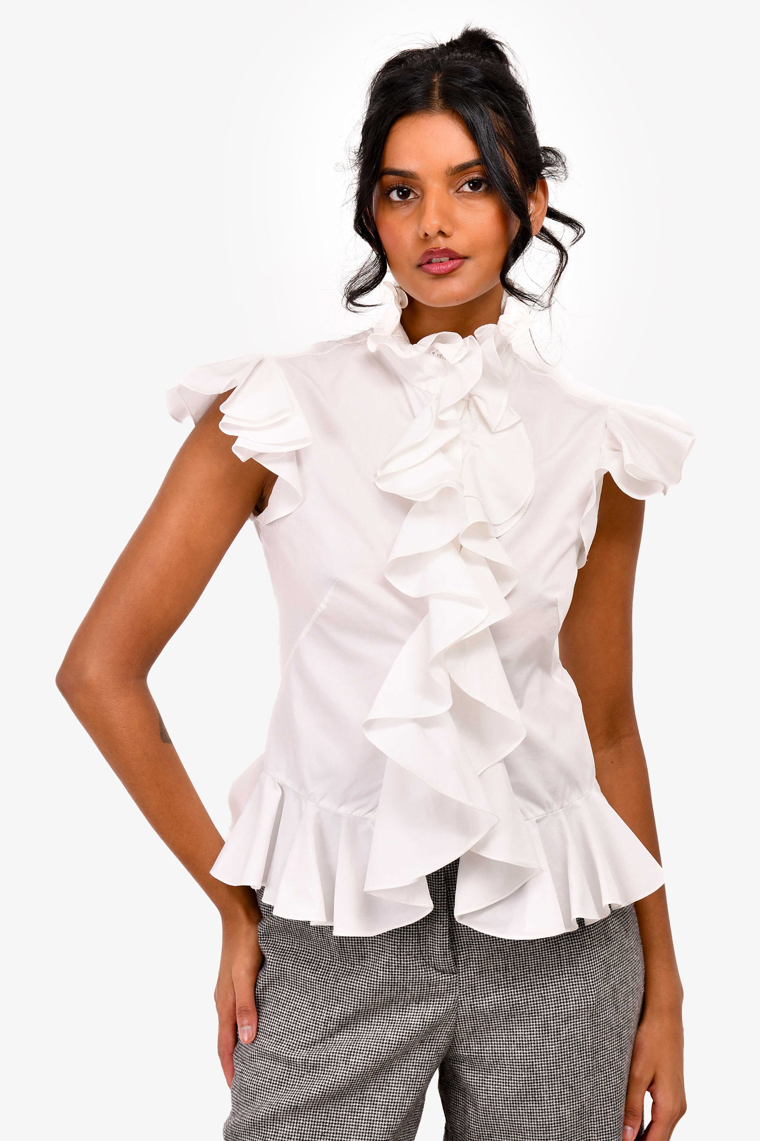 Refresh availabilityAlexander McQueen White Ruffle Detail Top. Front button-up closure. Tonal hardware. Ruffles around the hem, shoulder and collar. Tonal stitching.
