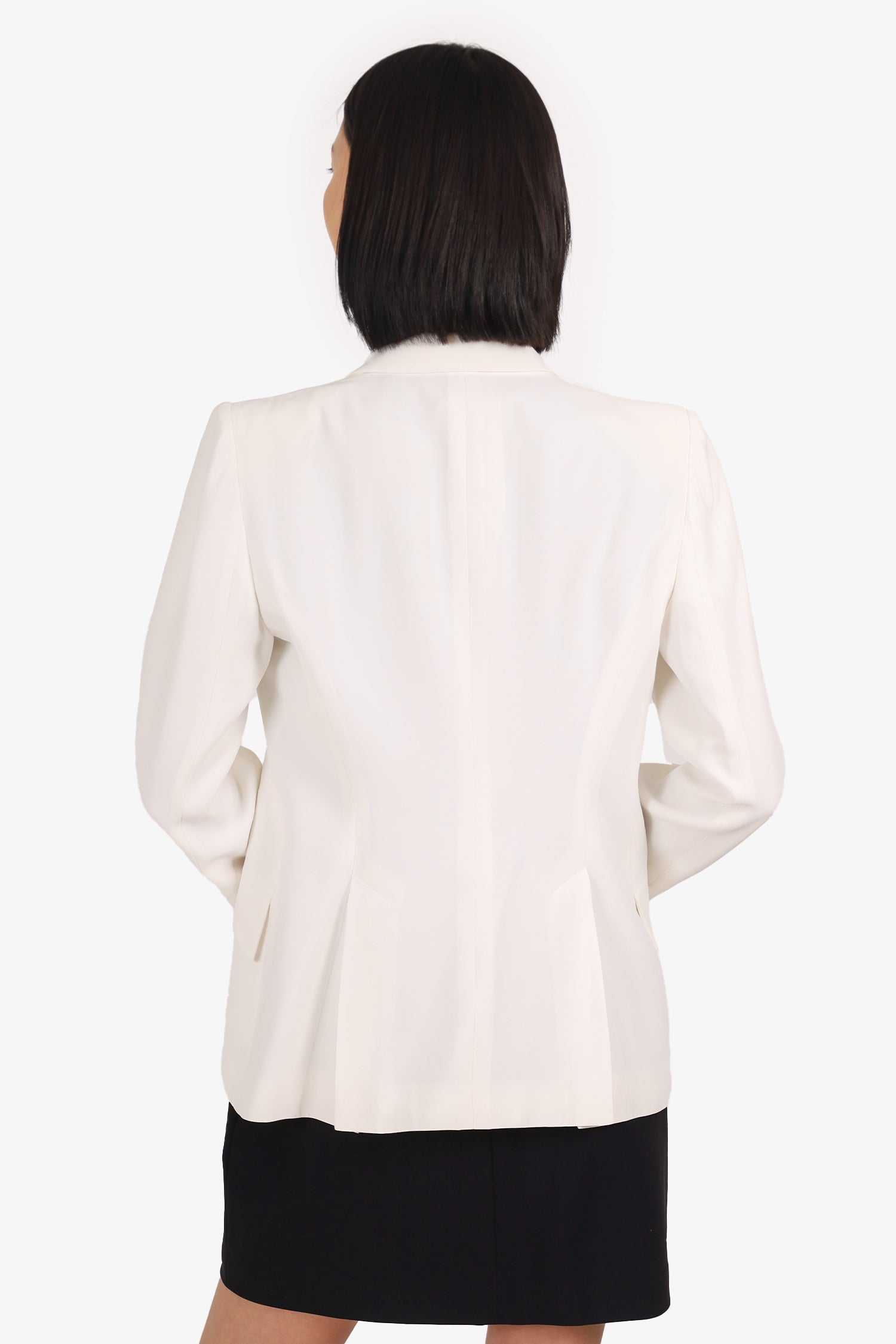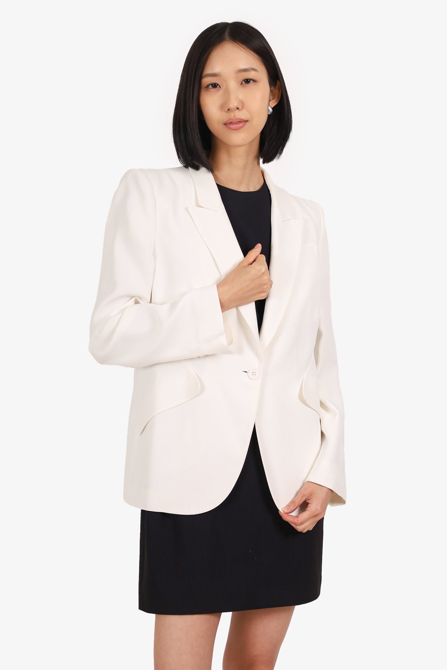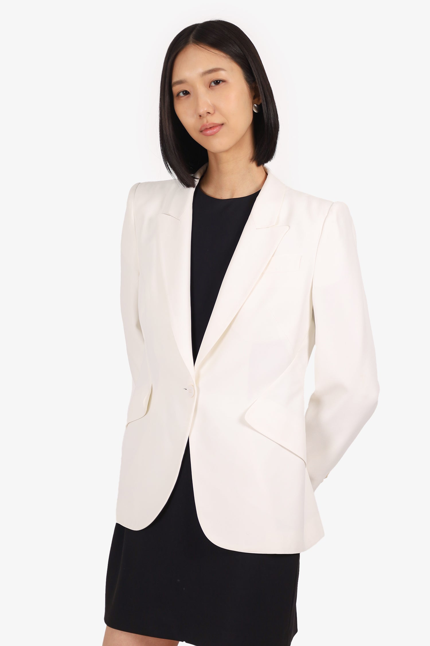 Refresh availabilityAlexander McQueen White Single Breasted Blazer. Peak lapel. Front button-up closure. 3 front exterior pockets; 2 flap and 1 slip. Sleeve cuffs with button-up closure. Double rear vents. Lined interior. Built-in shoulder pads. Tonal stitching.