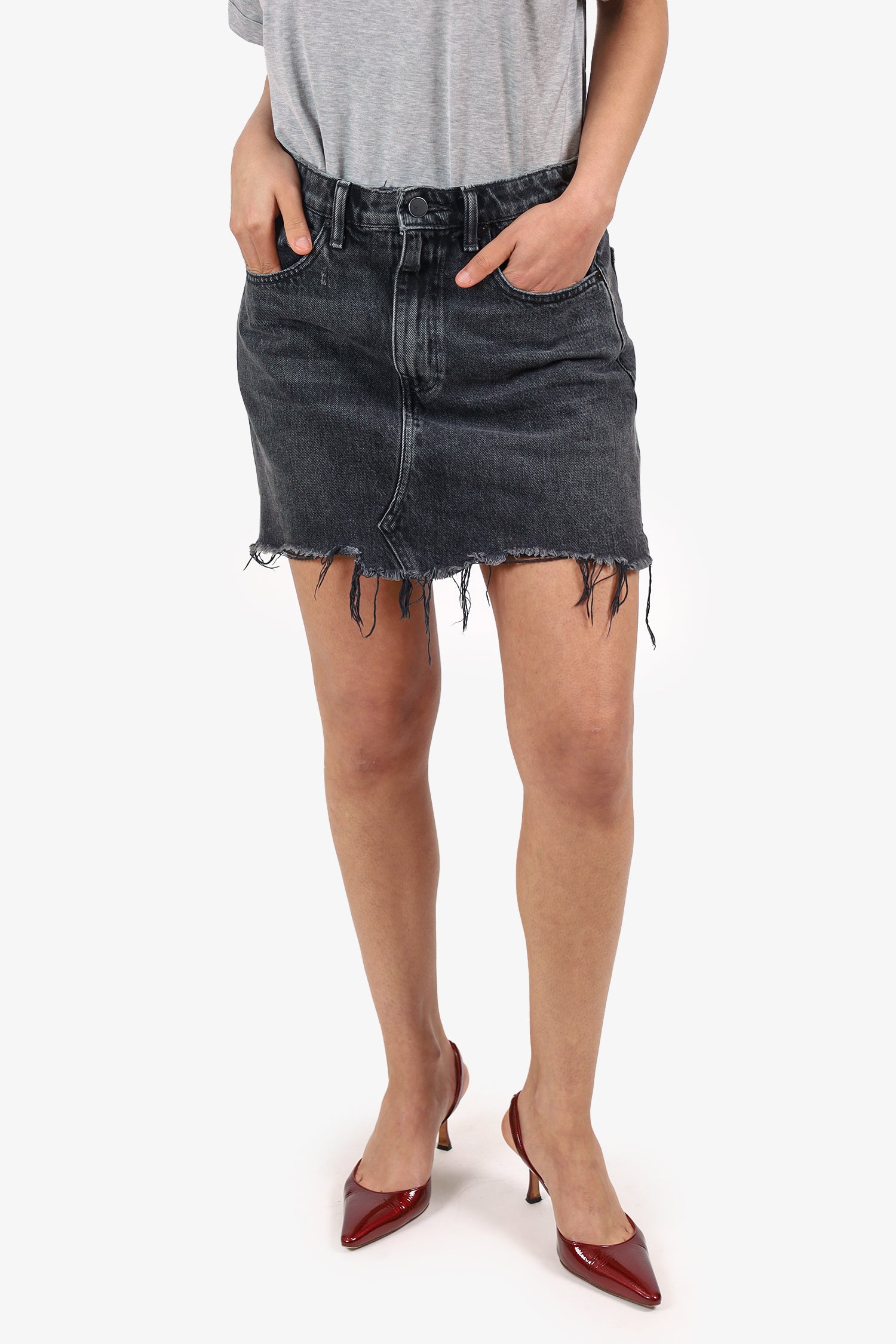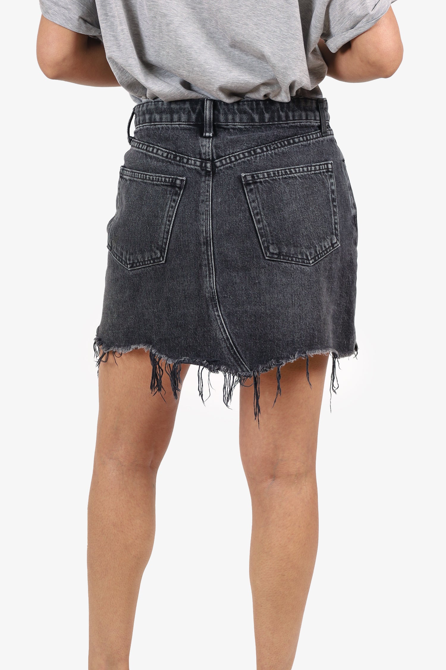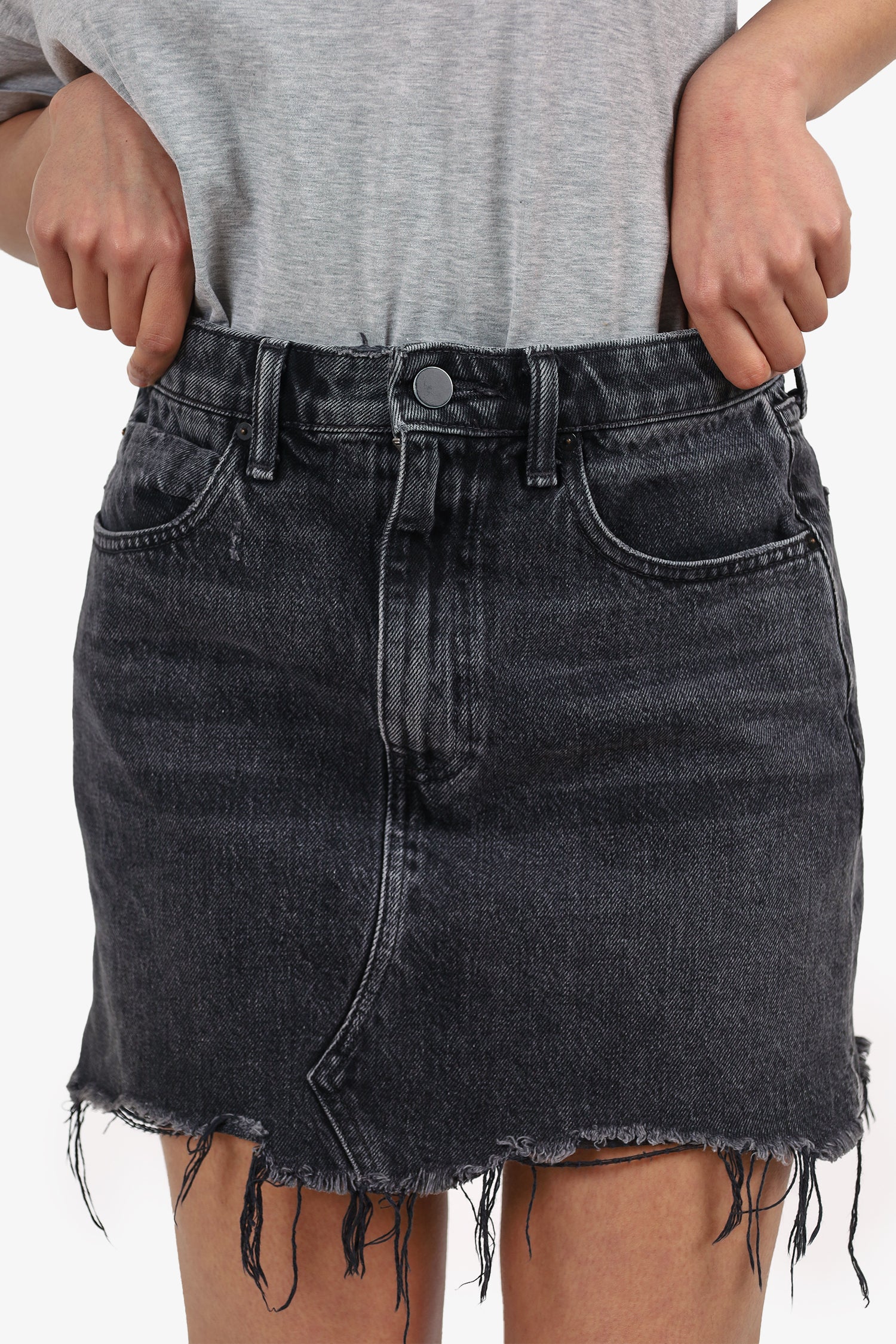 Refresh availabilityAlexander Wang Black Denim Distressed Mini Skirt. Pull-on. Front zip with button closure. Waistband belt loops. 5 exterior pockets; 2 front side slip and 1 mini compartment, 2 rear slip. Raw frayed bottom hem. Tonal stitching.
