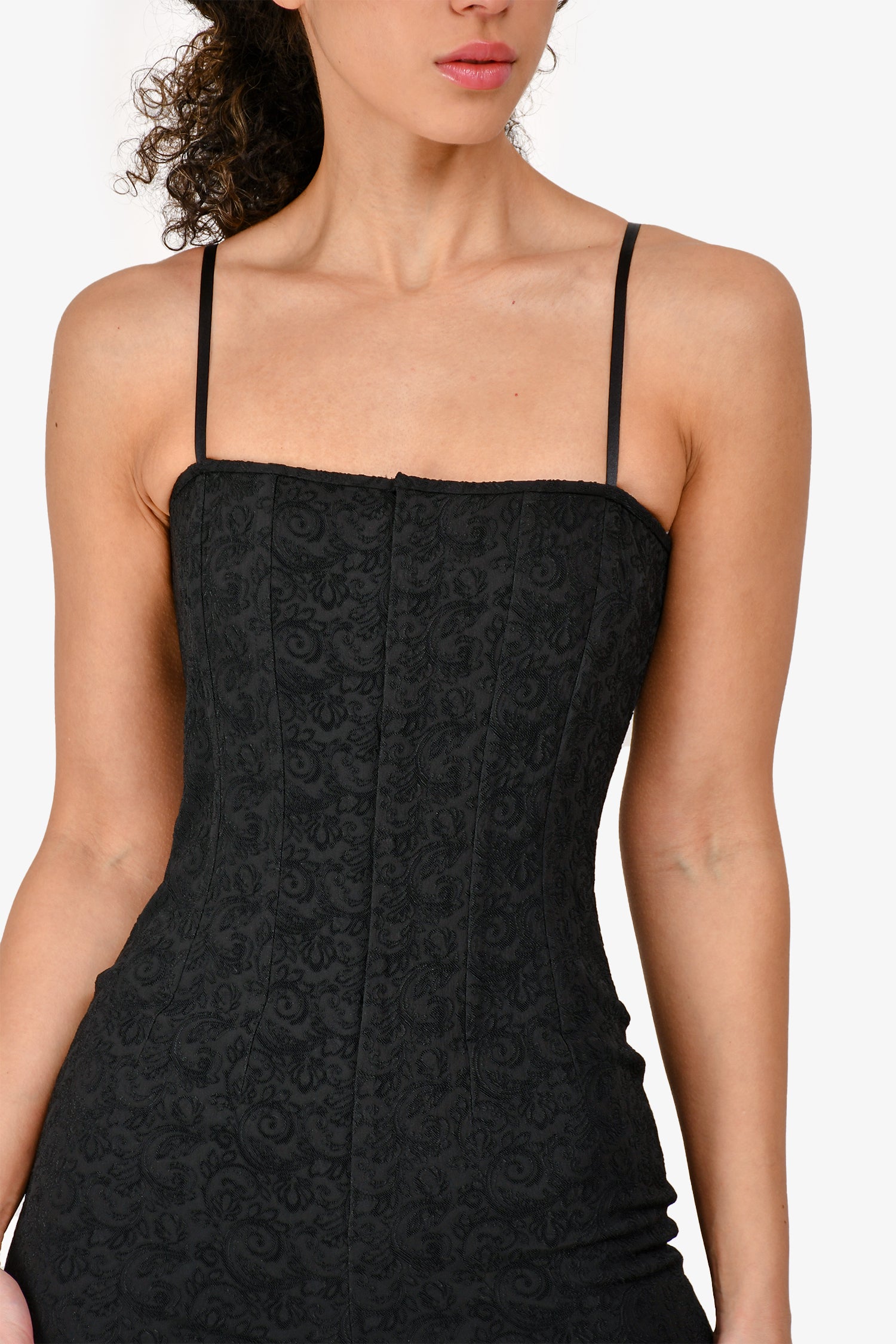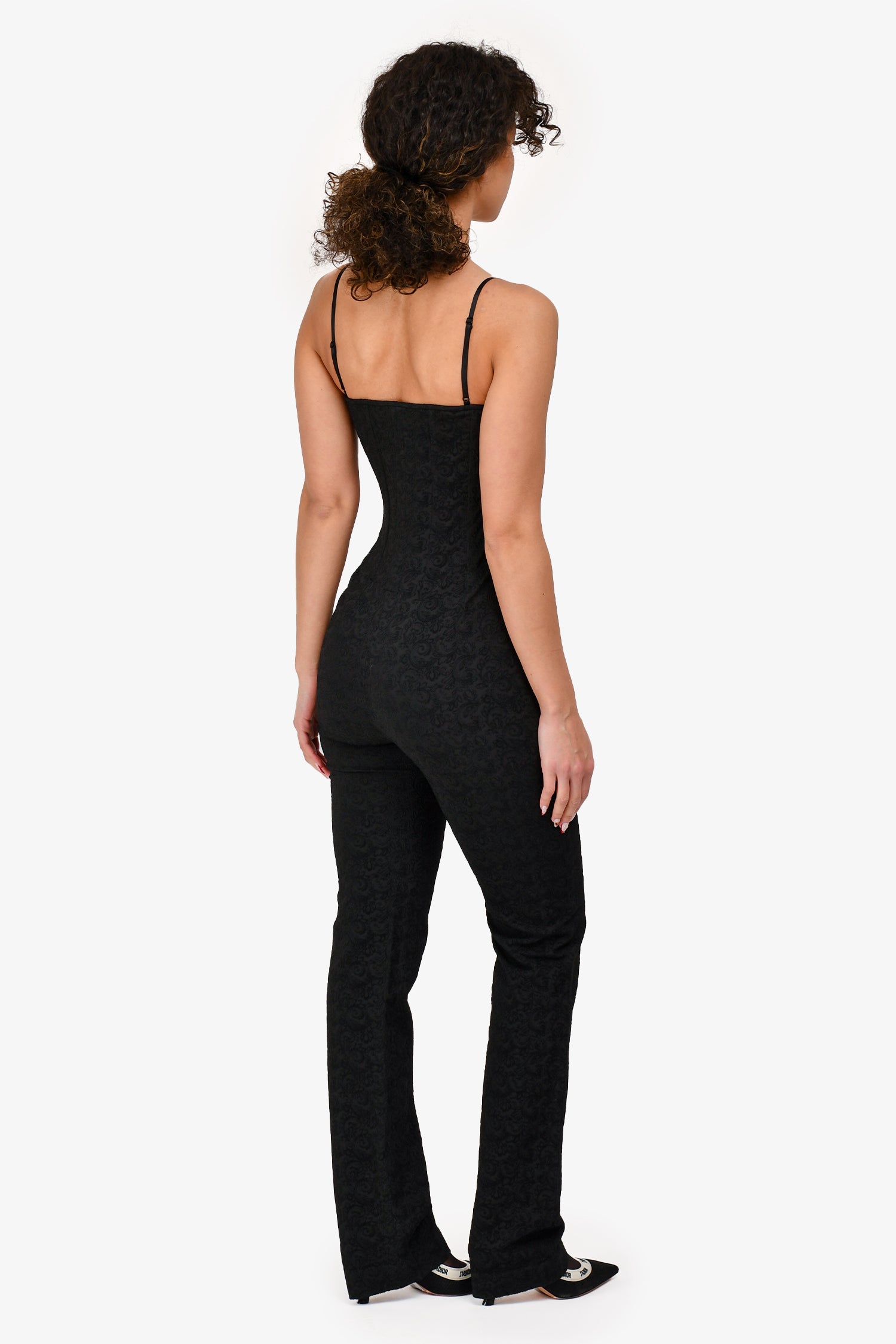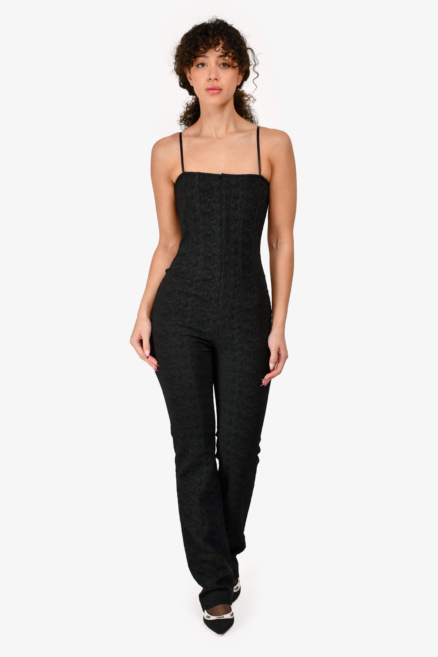 Refresh availabilityAlexander Wang Black Embroidered Jumpsuit. Square neckline. Front zipper closure. Adjustable straps. Corset boning. Silver-tone hardware. Tonal stitching.
