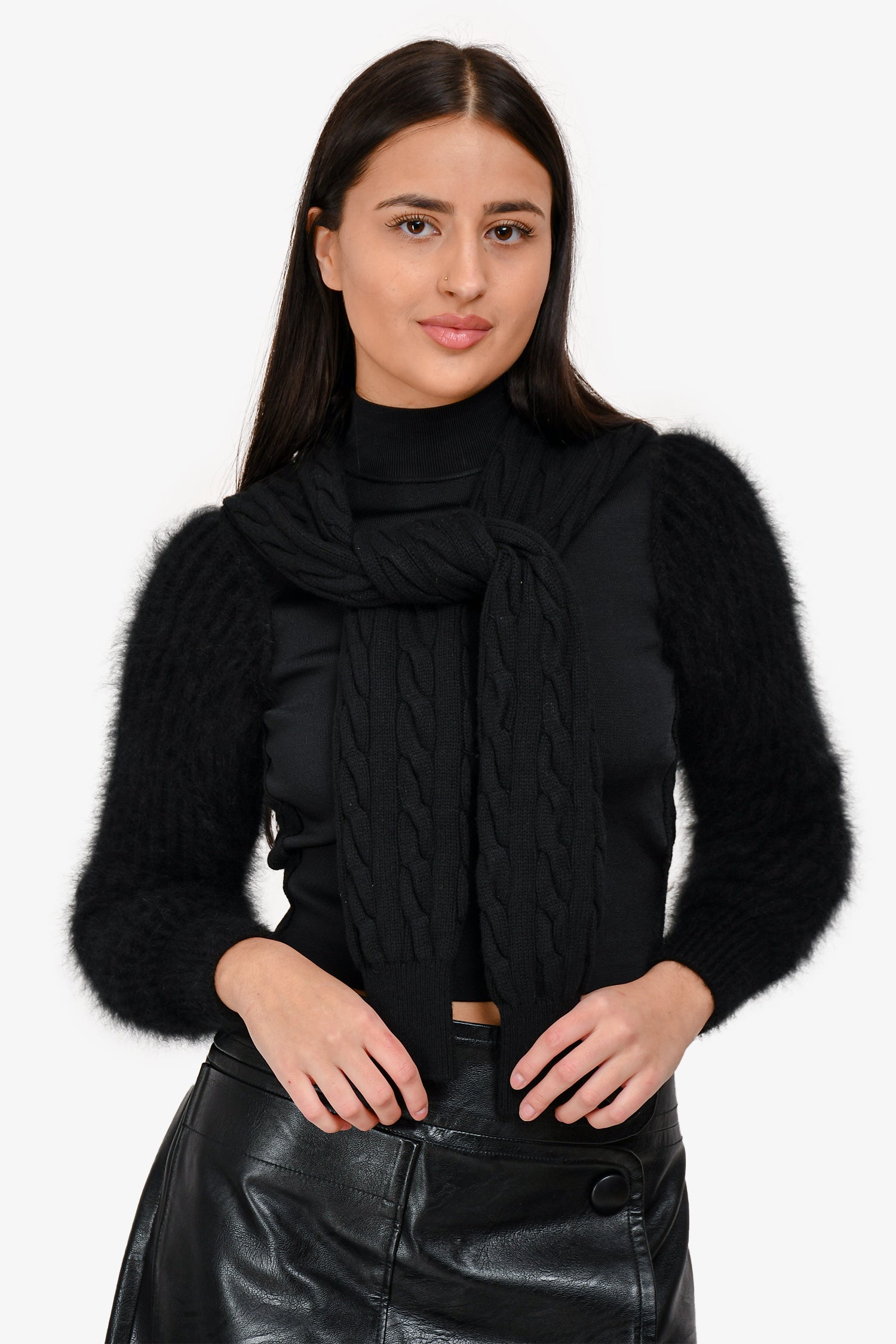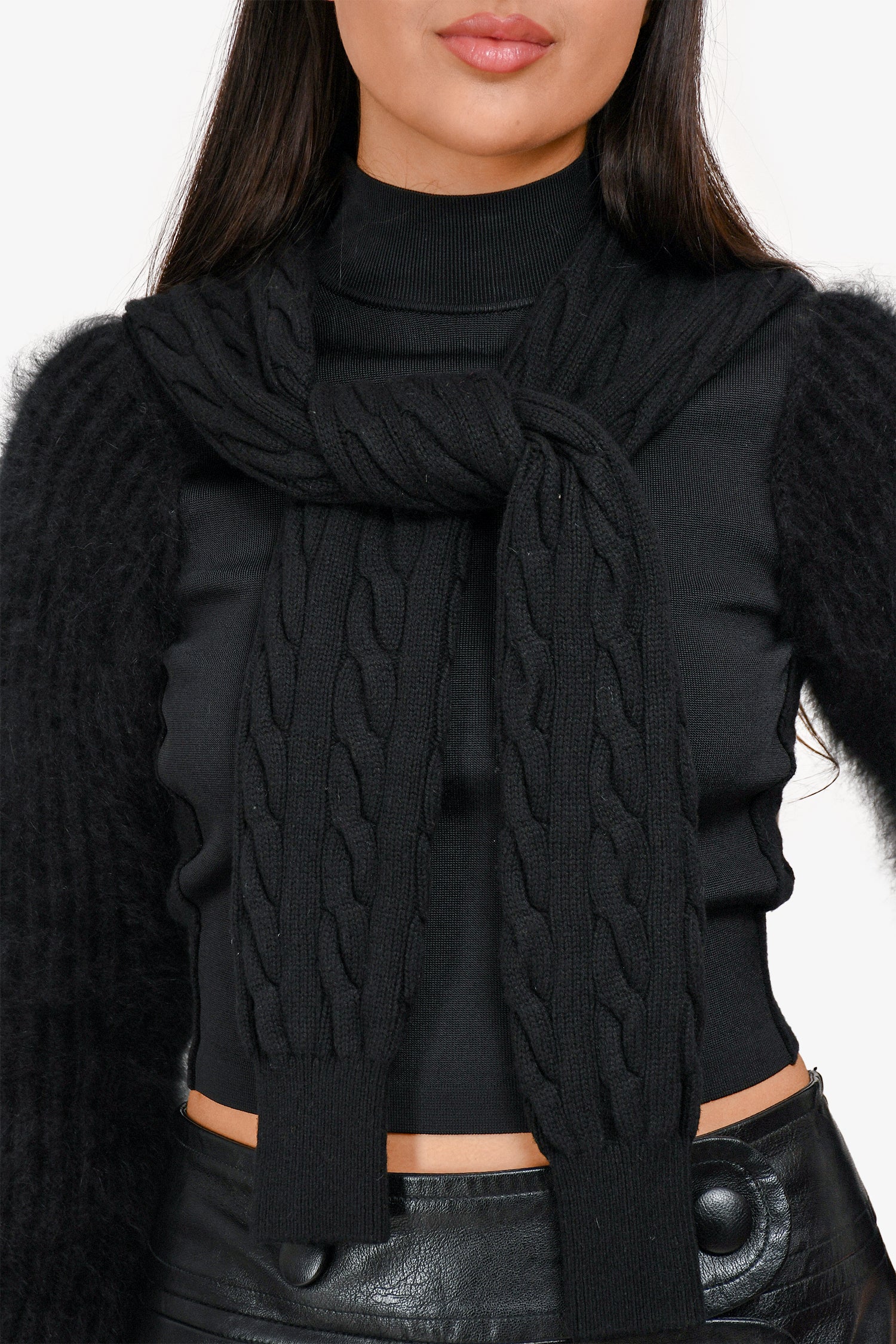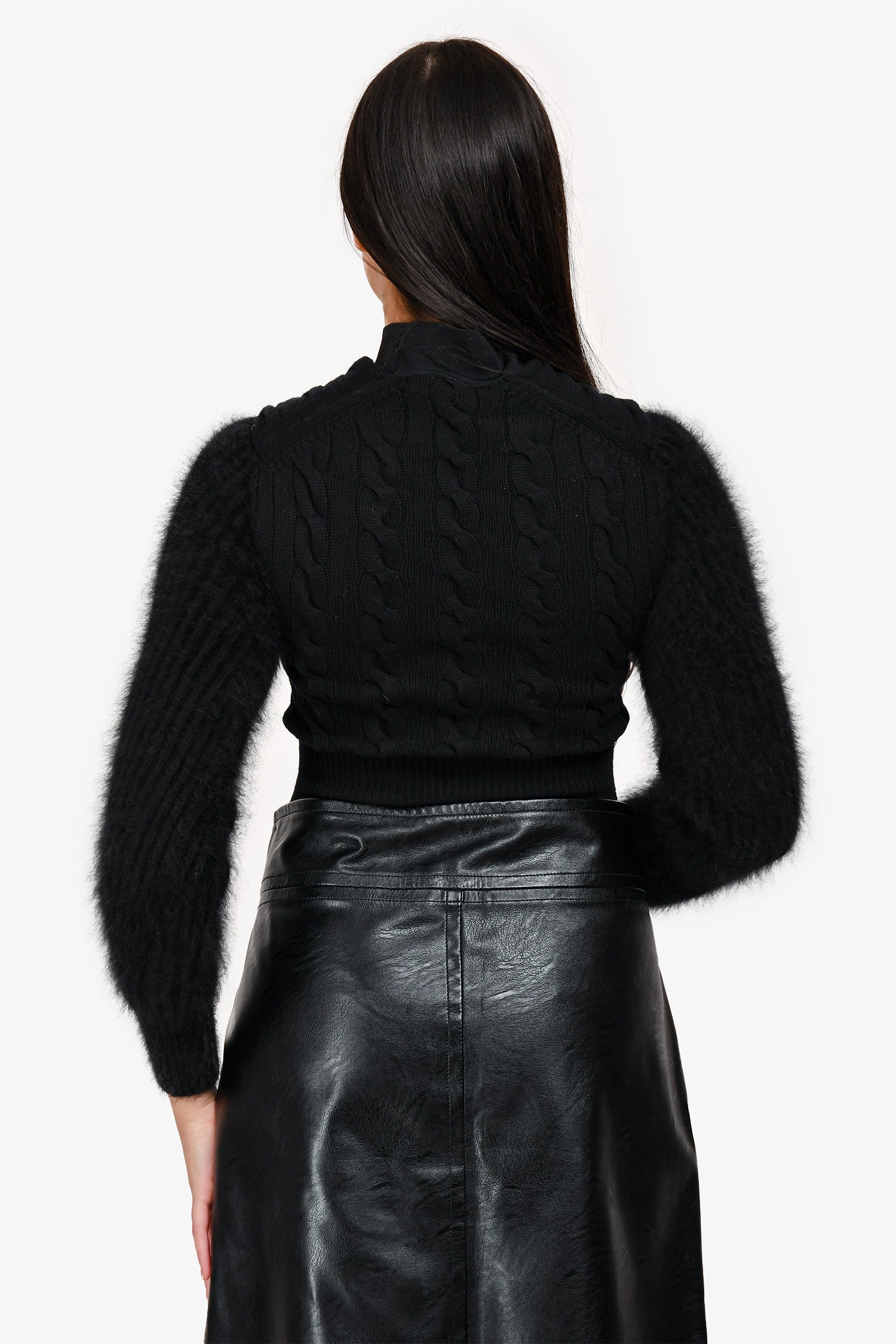 Refresh availabilityAlexander Wang Black Knit Double Faux Sleeve Sweater. Long-sleeved front tie. Cable-knit sleeves and exterior back. Mock neckline. Wool and angora fur. Tonal stitching.