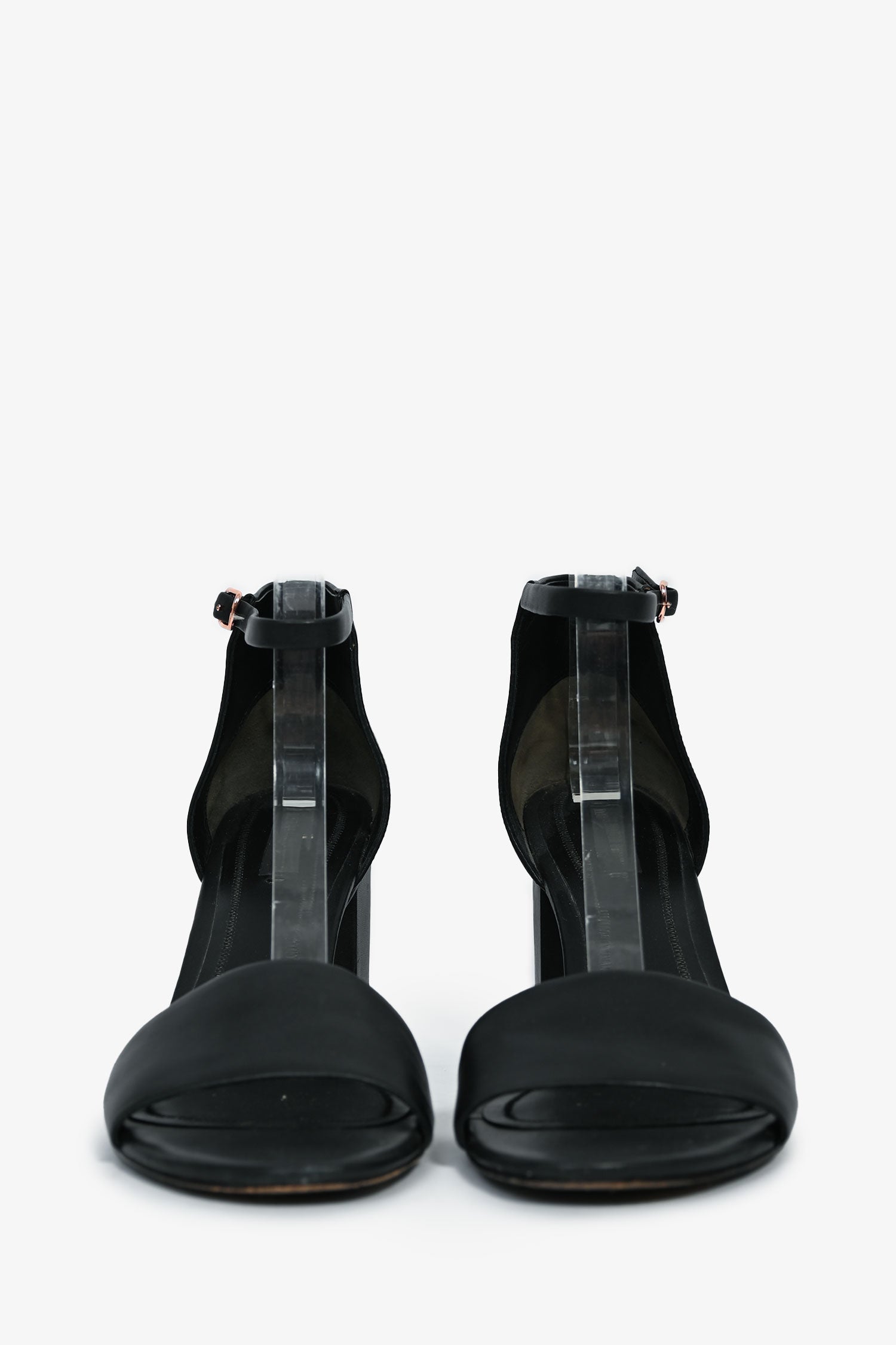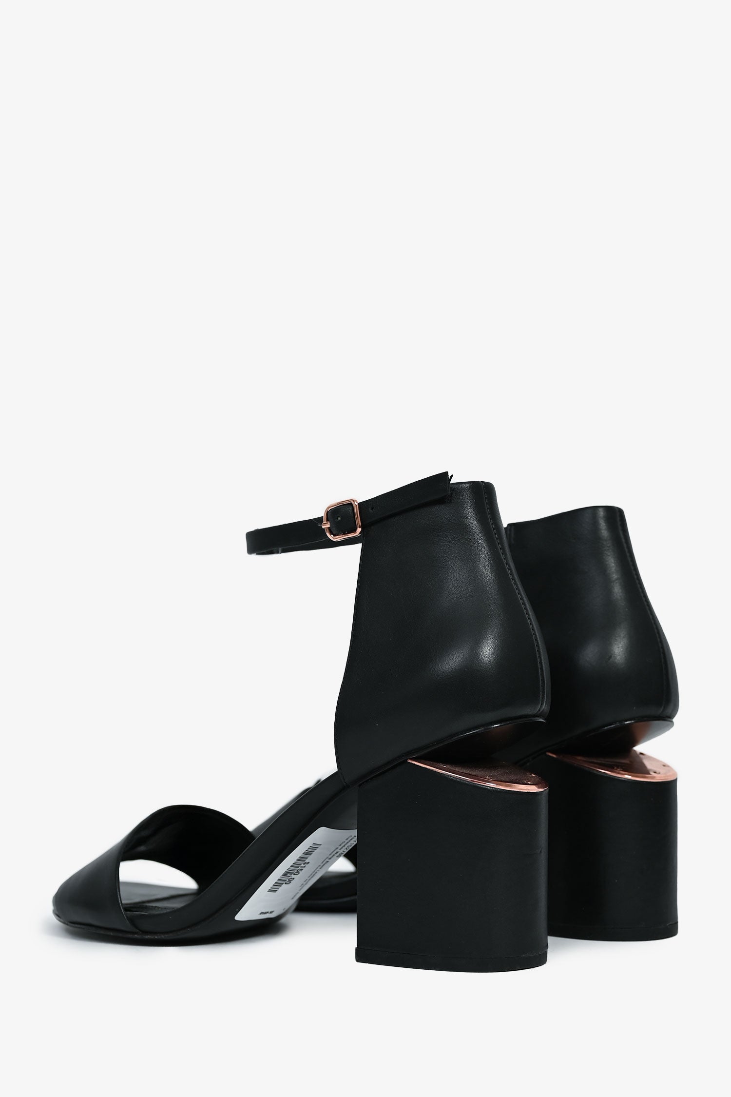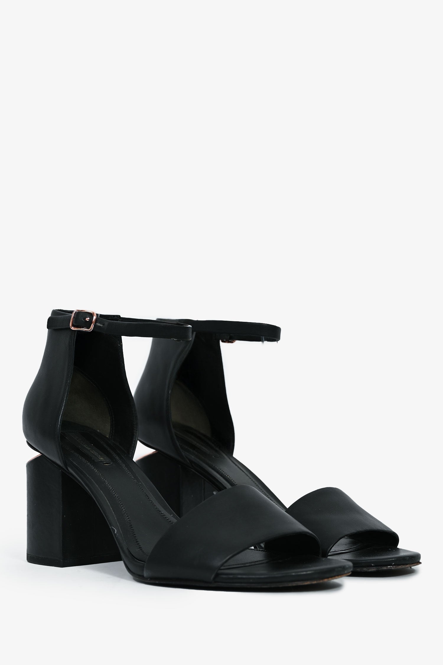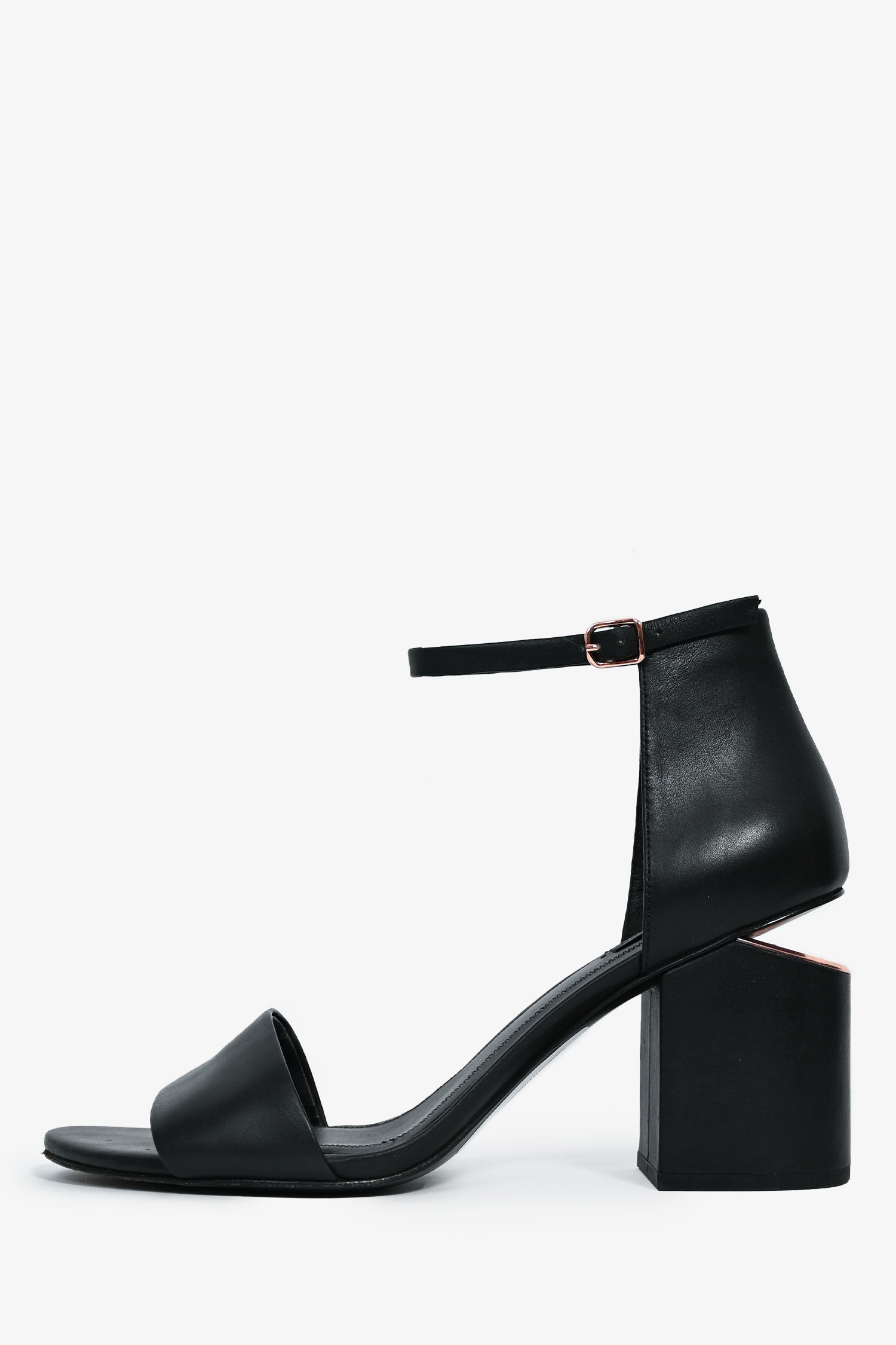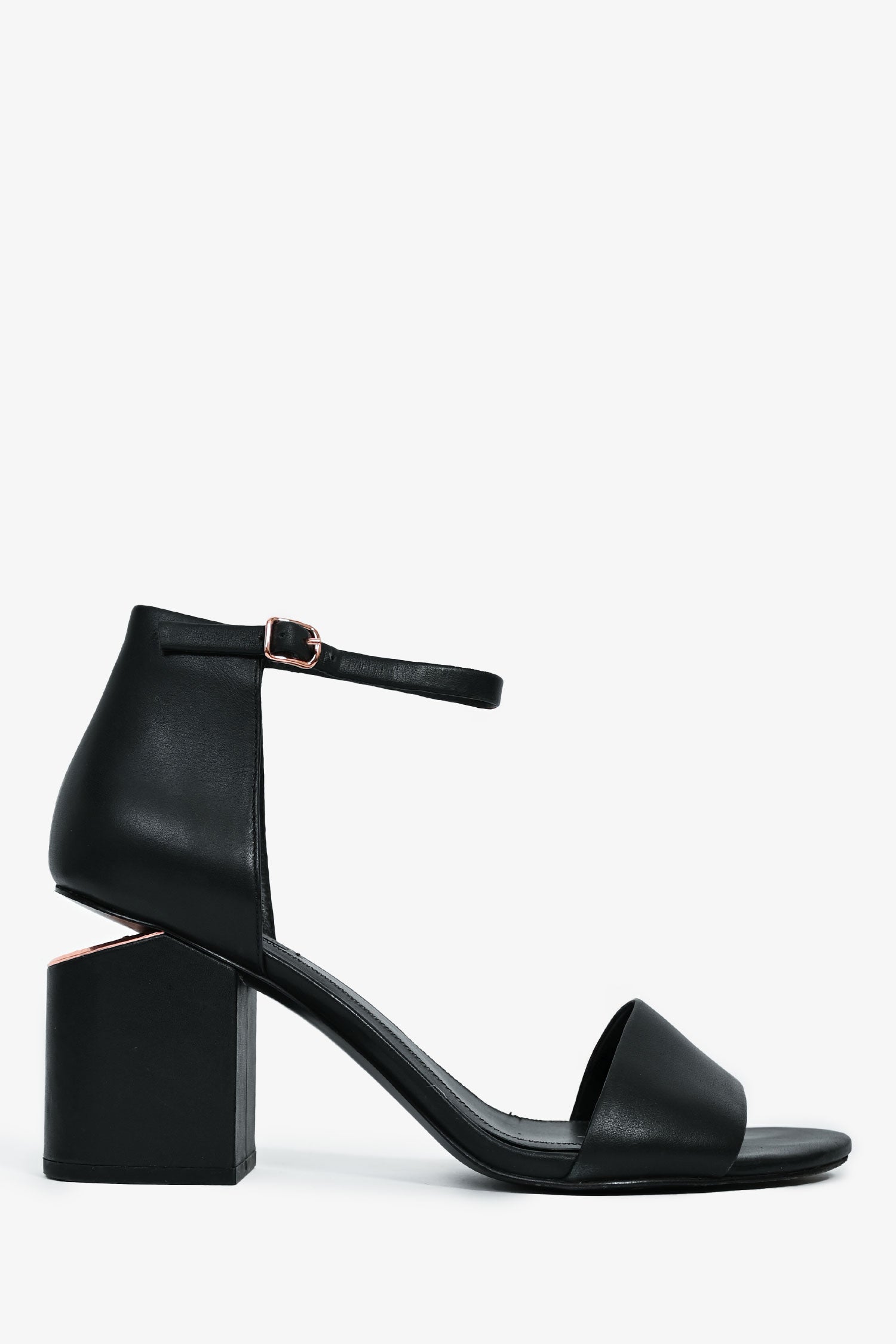 Refresh availabilityAlexander Wang Black Leather/Rose Gold Cut Out Block Heel Sandals. Leather ankle strap. Rose-gold tone hardware. Thick toe strap. Leather insoles. Tonal stitching.