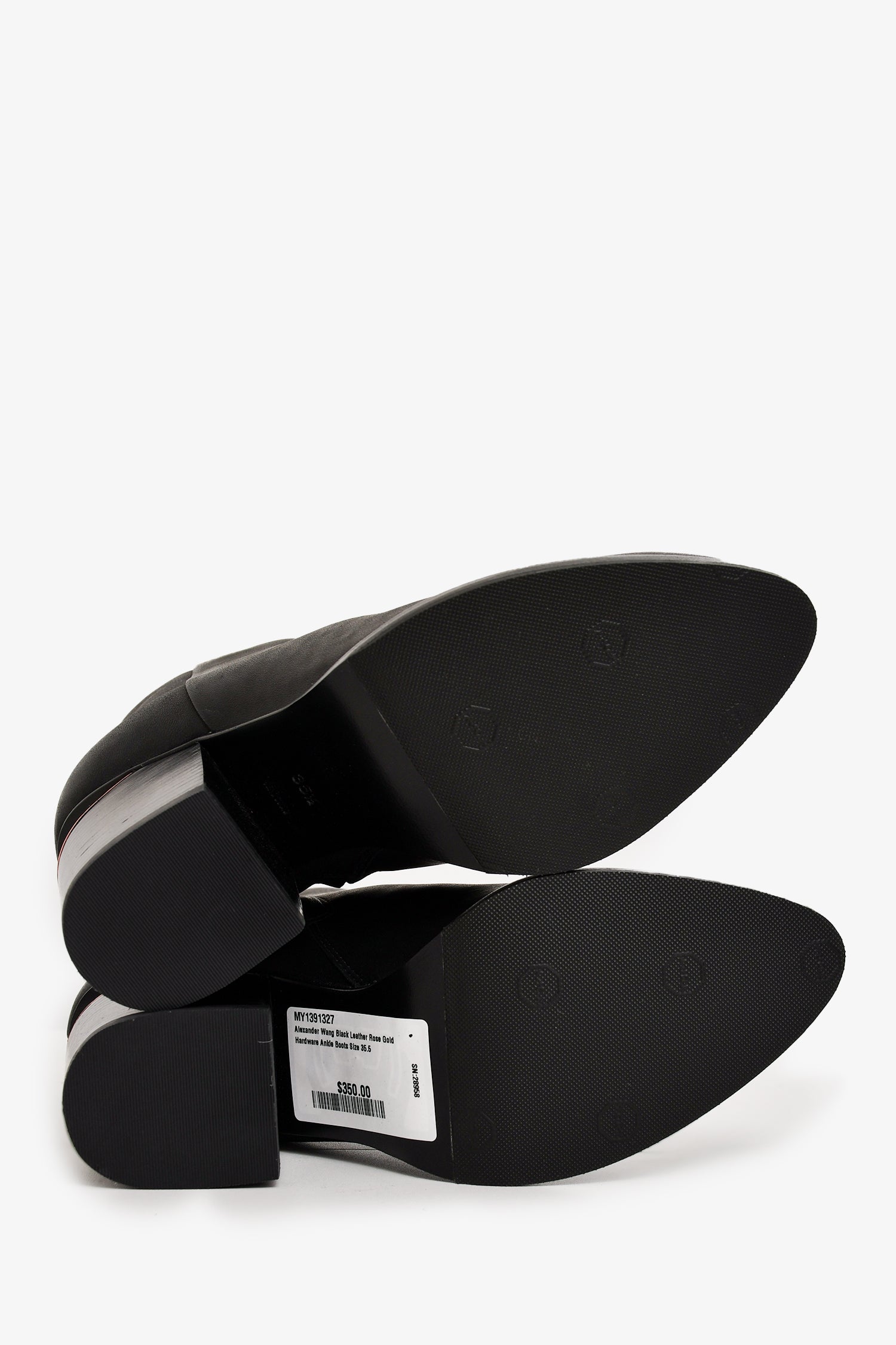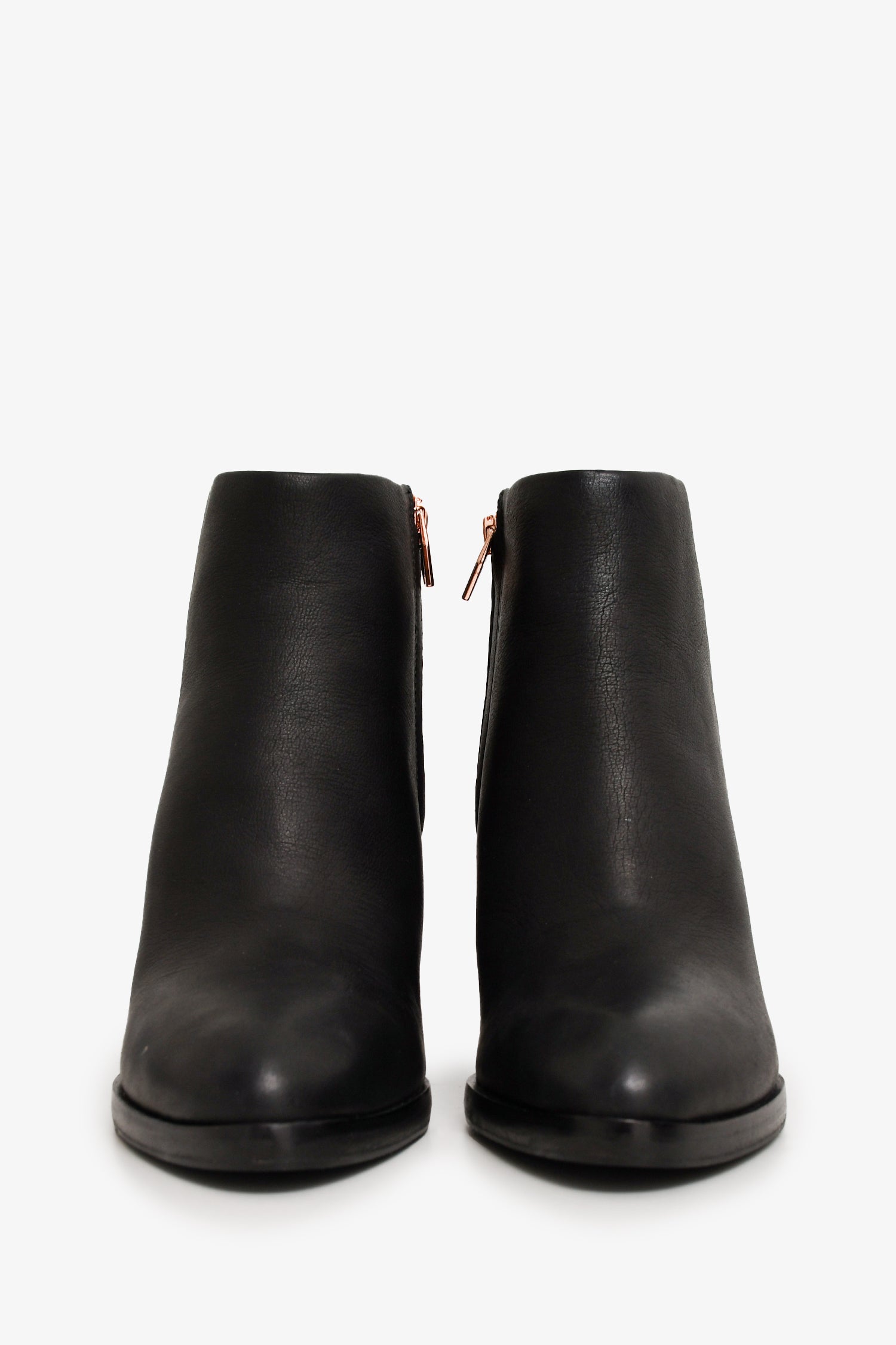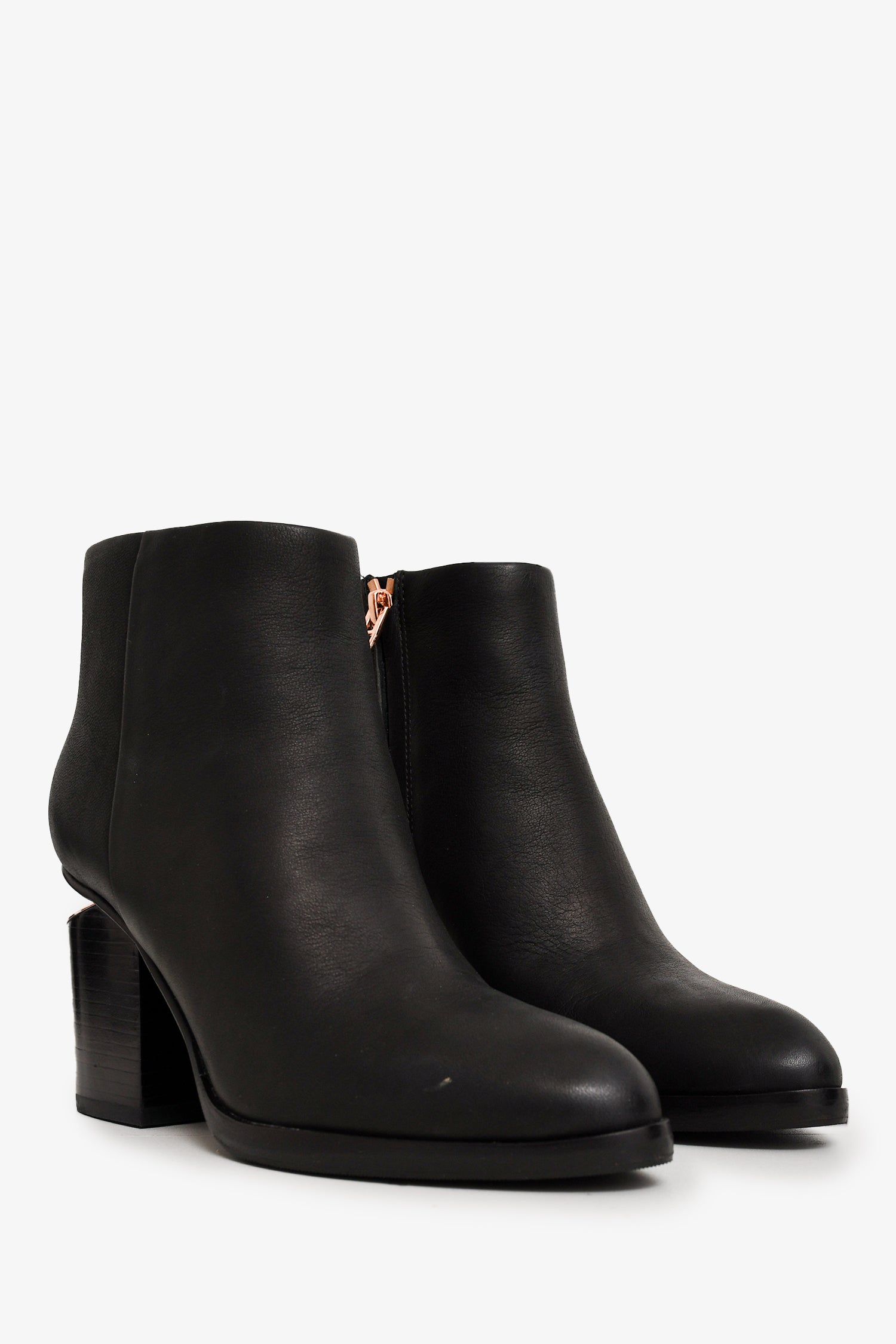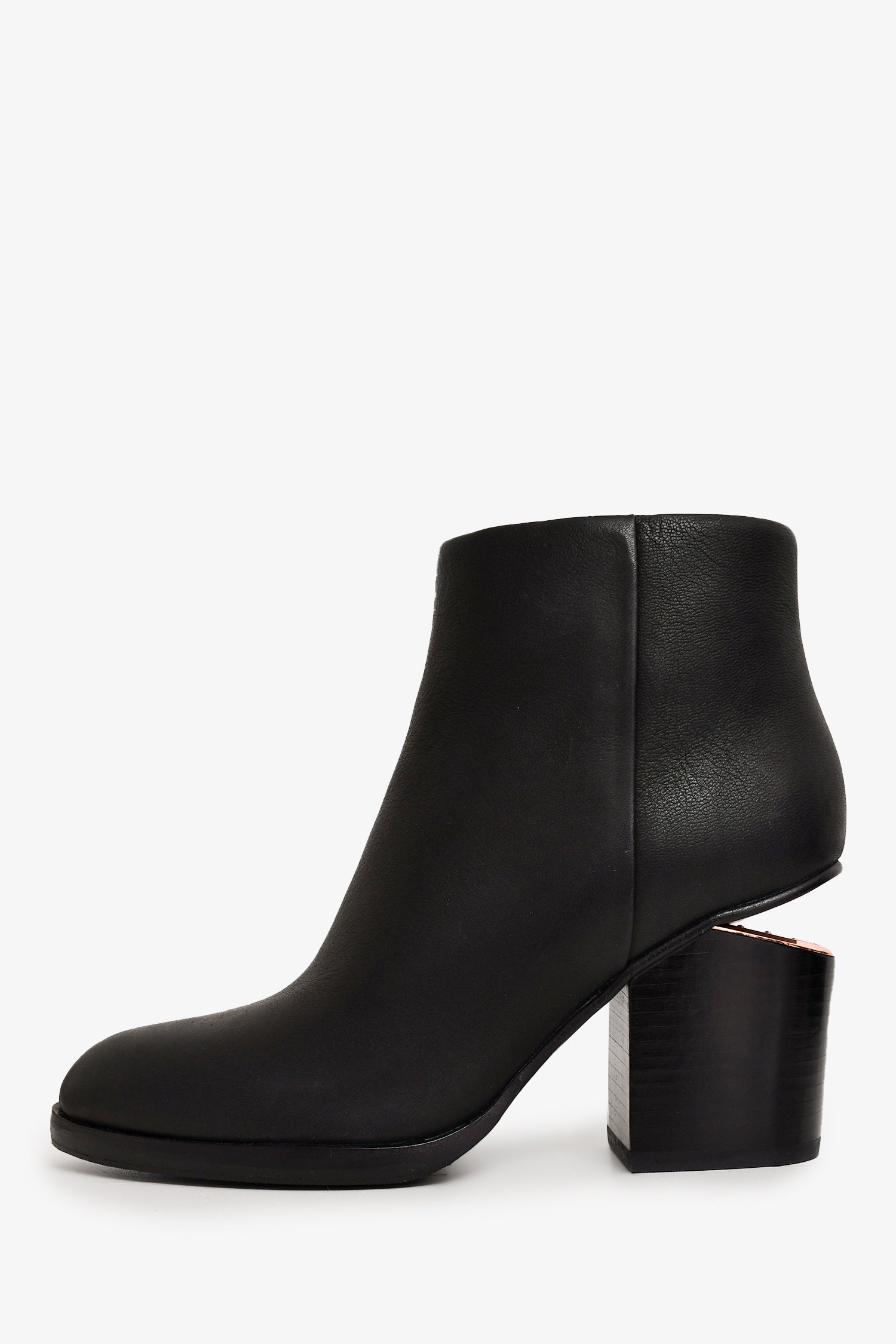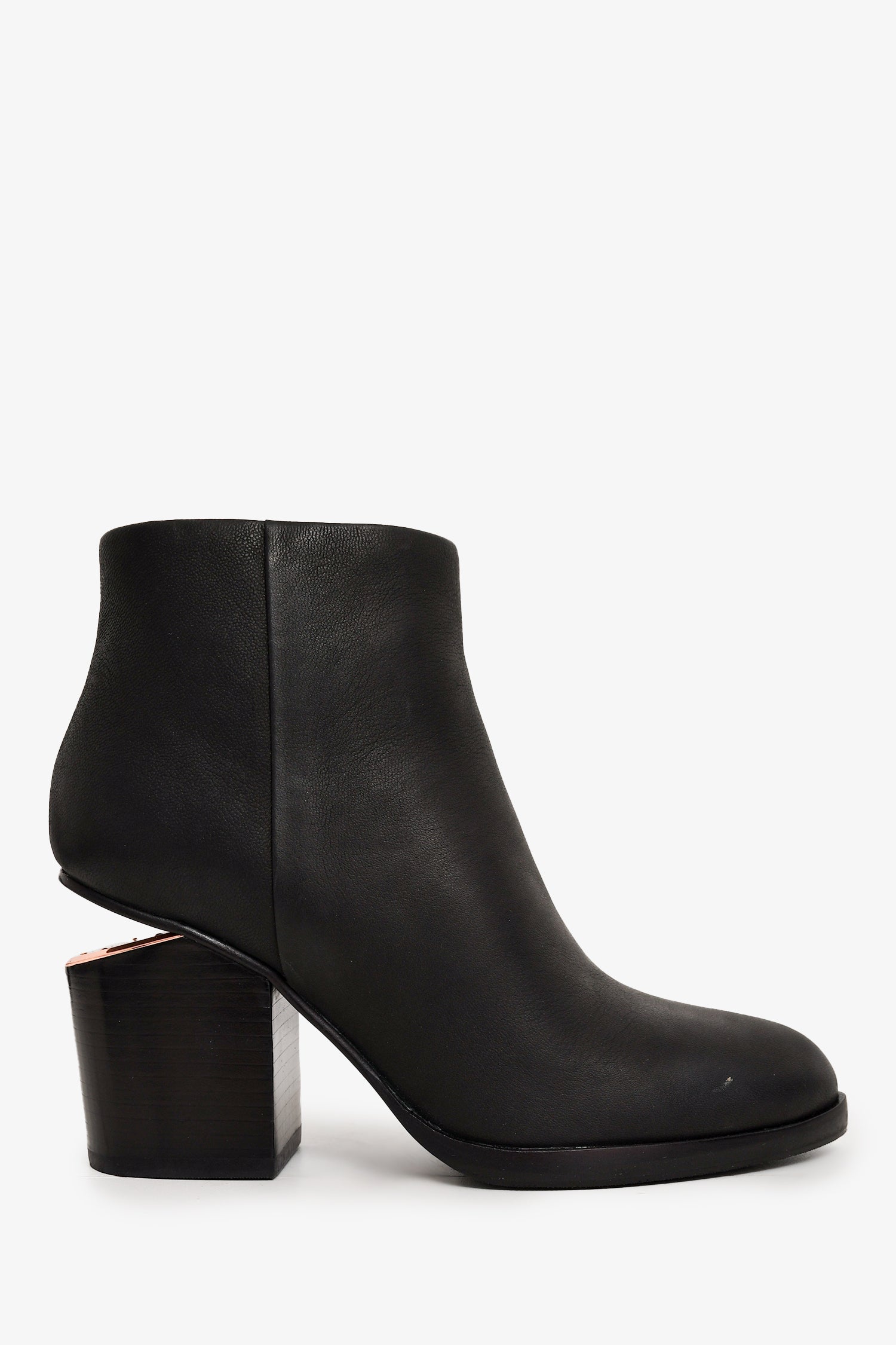 Refresh availabilityAlexander Wang Black Leather Rose Gold Hardware Ankle Boots. Almond toe. Side zip closure. Sliced heel. Topy soles.