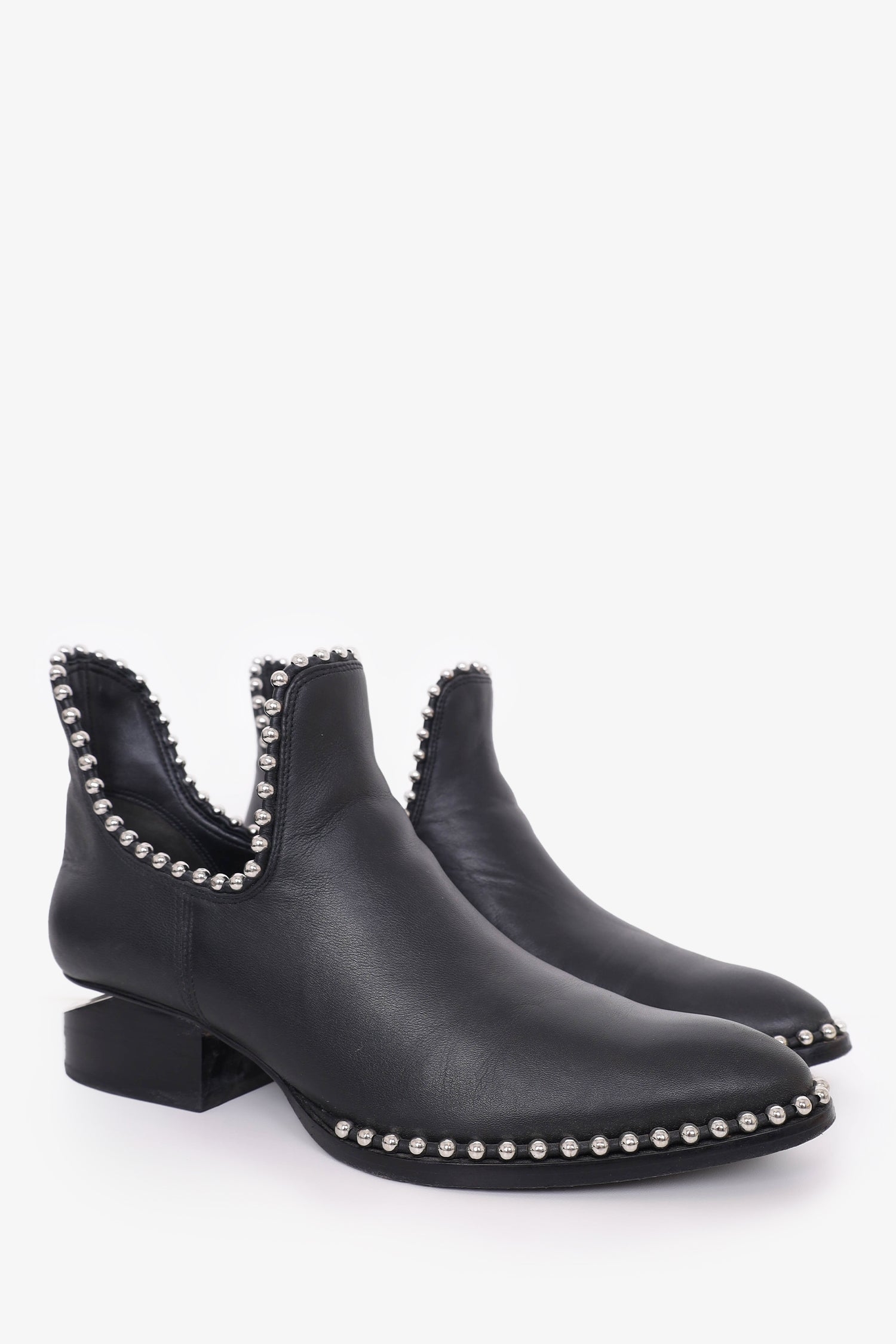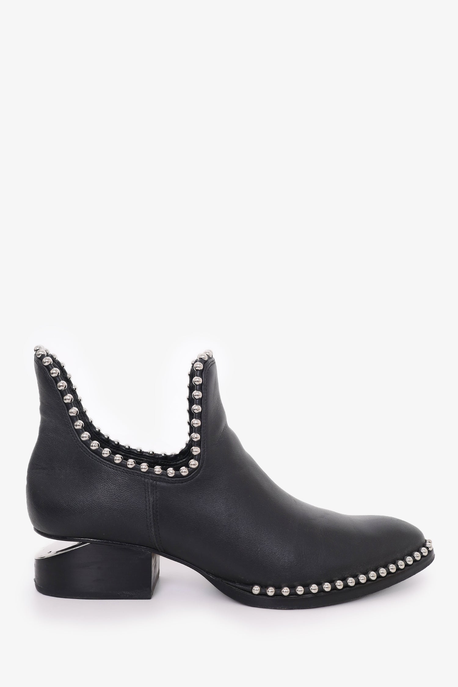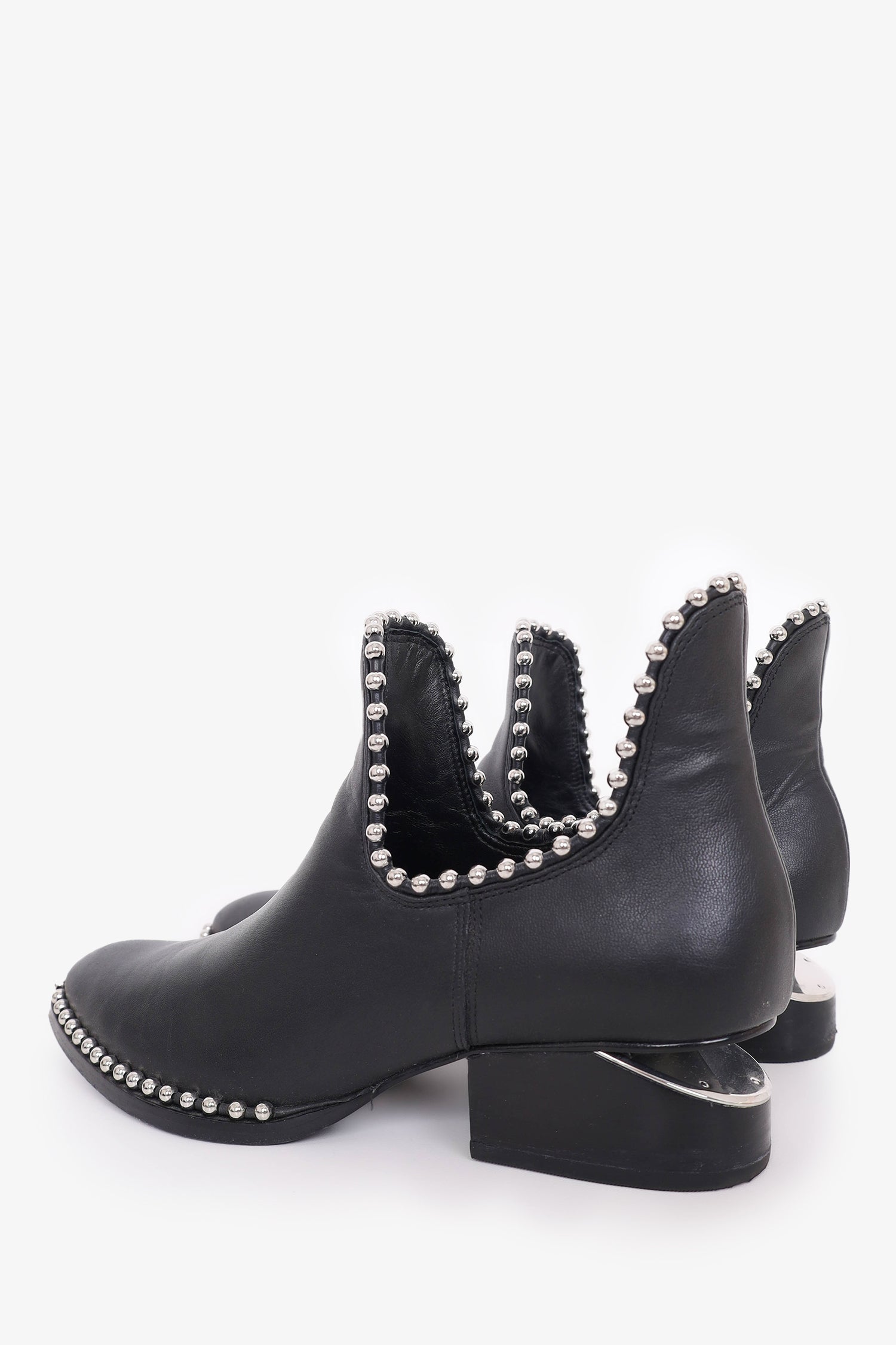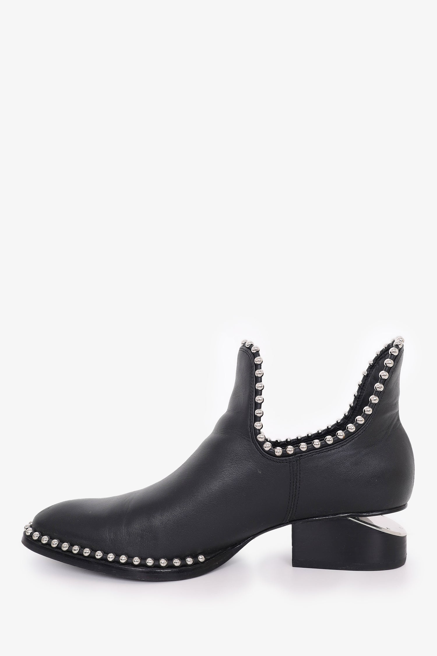 Refresh availabilityAlexander Wang Black Leather Studded Heeled Boots. Pull-on. Cut-out detailing on ankles and heel. Silver-tone hardware. Tonal stitching.