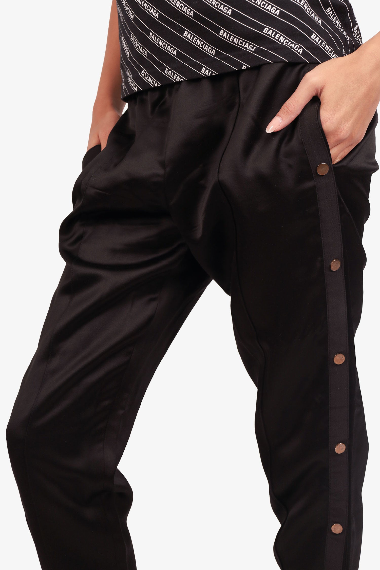Refresh availabilityAlexander Wang Black Satin Popper Detail Jogger. Pull-on. Elasticated waistband with button-up closure. Tear-away pant design with snap-button closure down each side. 2 exterior side slip pockets. Silver-tone hardware. Tonal stitching.