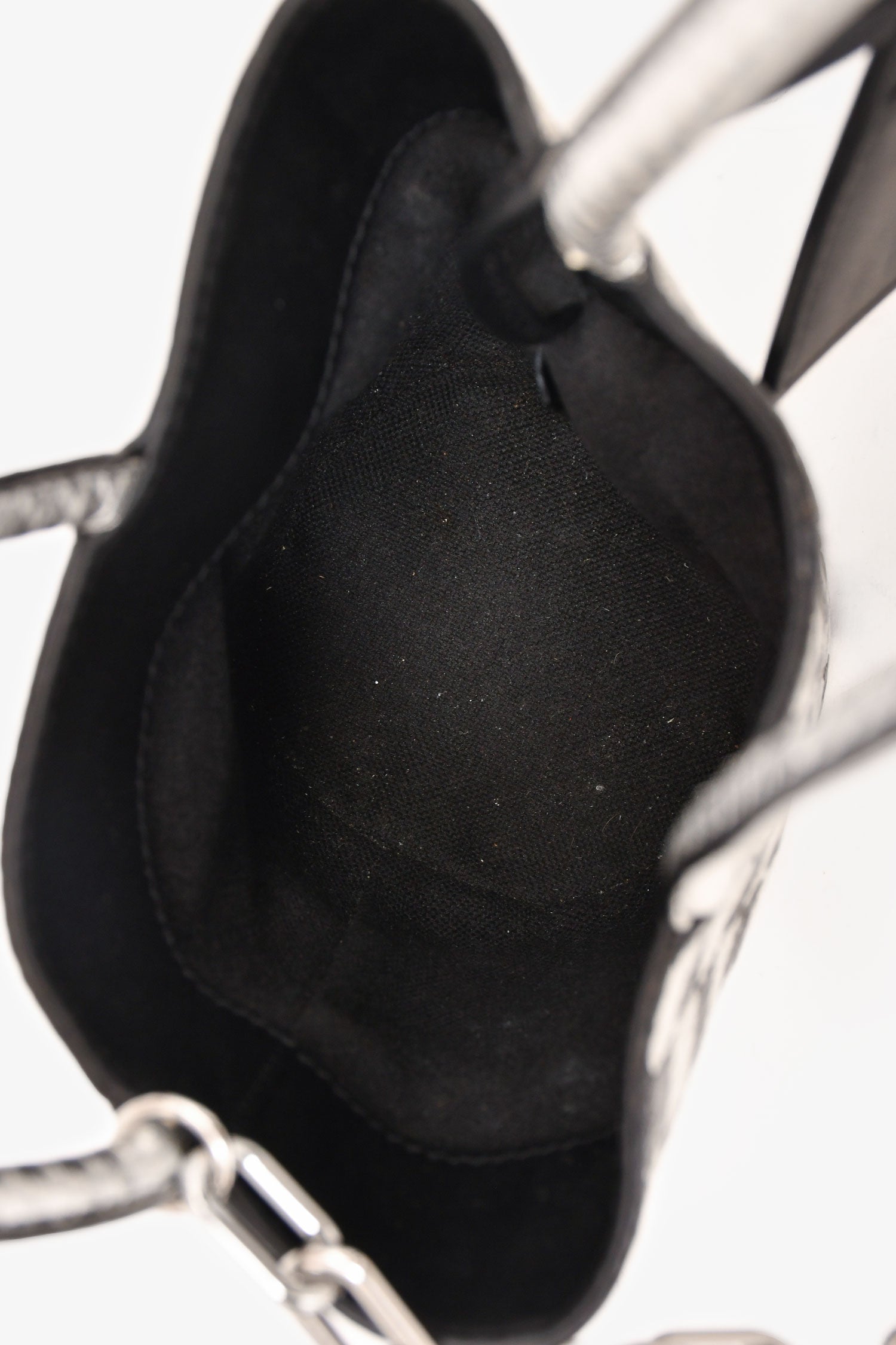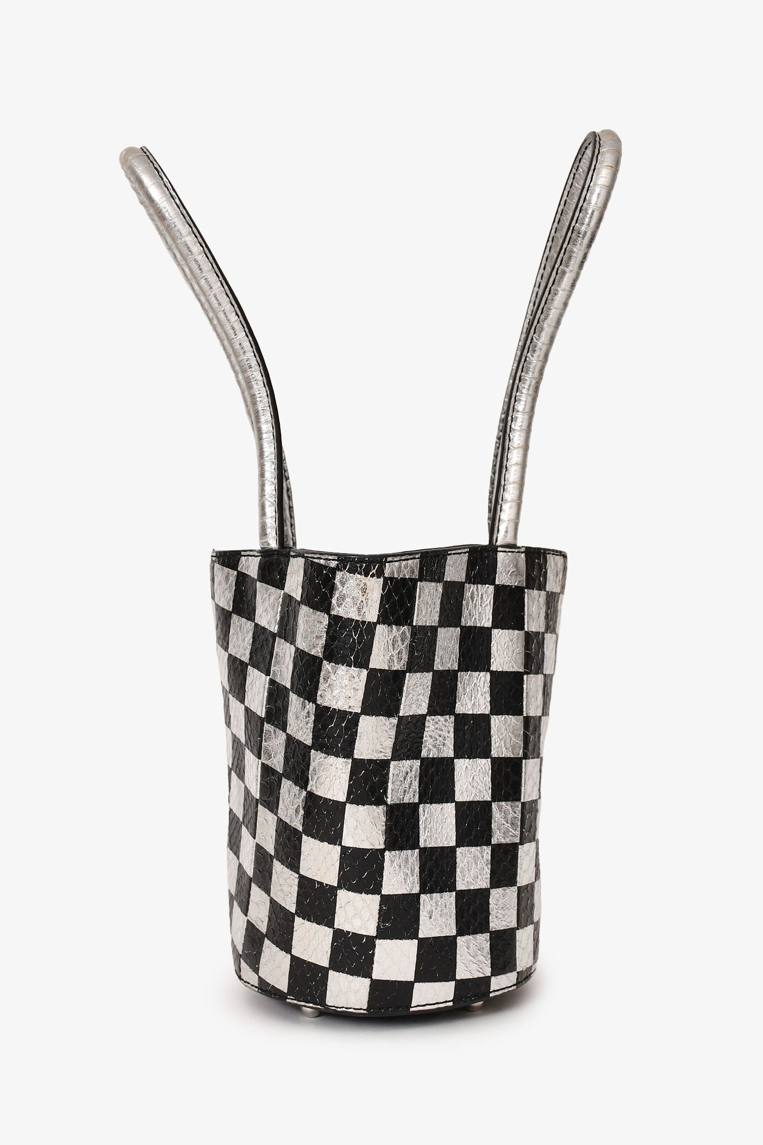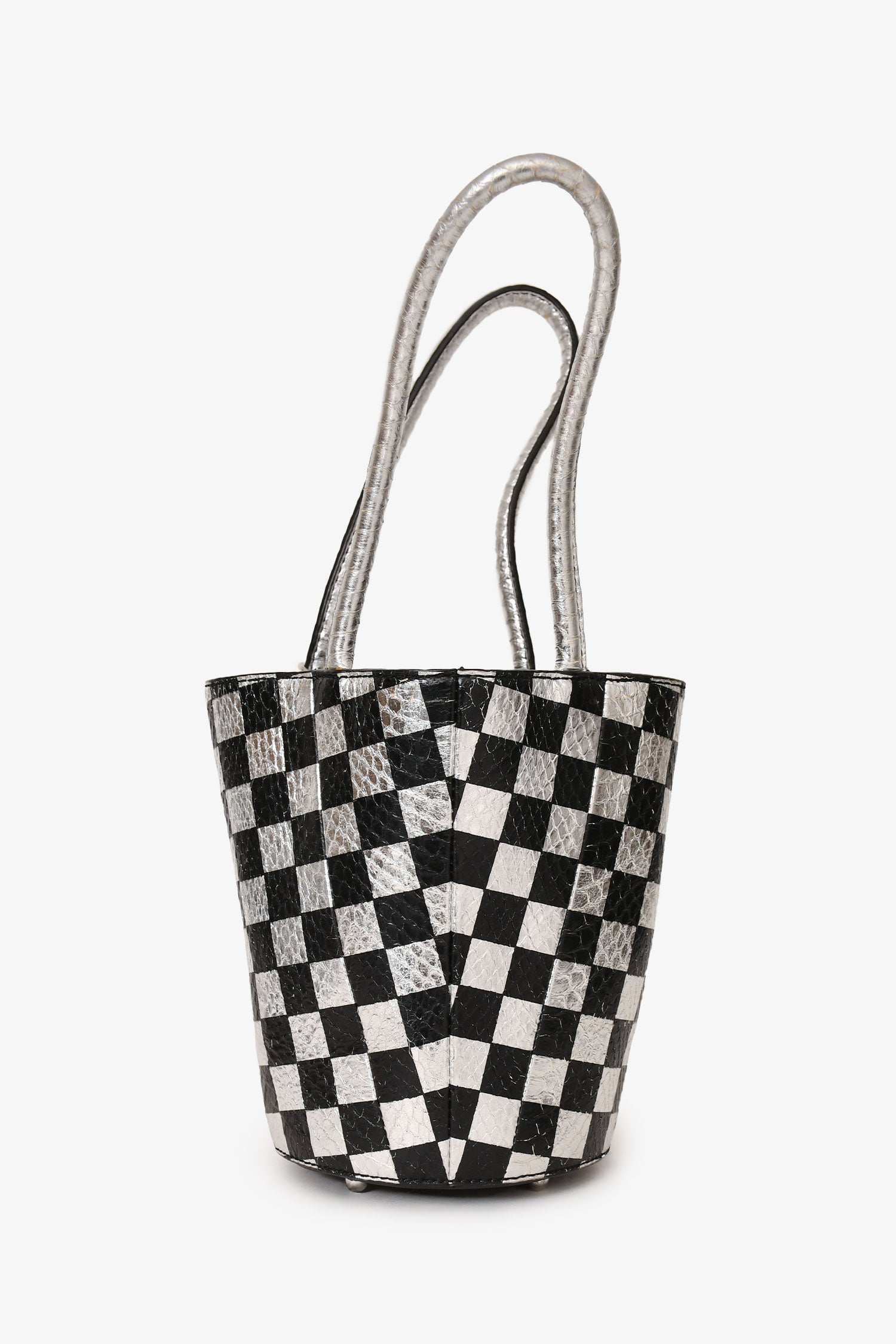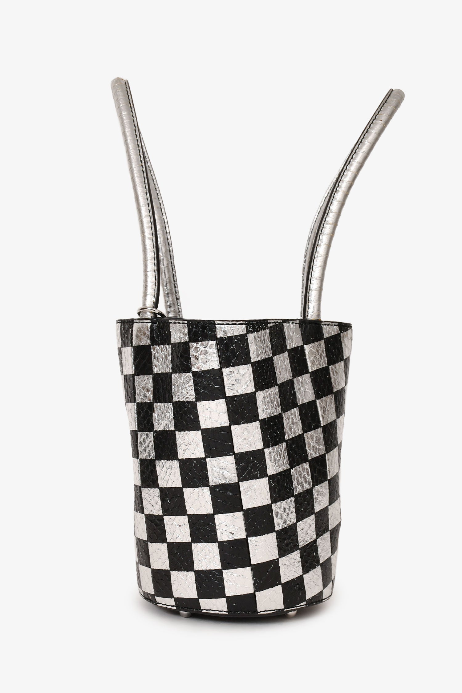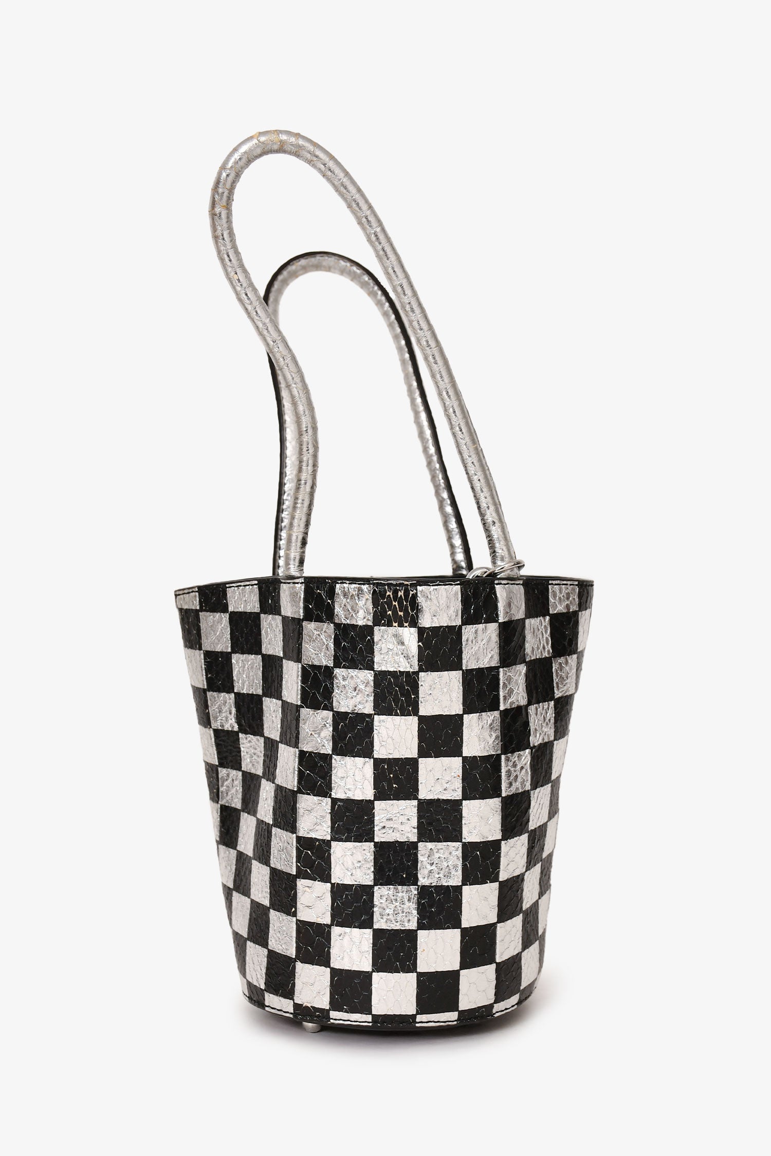 Refresh availabilityAlexander Wang Black/Silver Checkered Top Handle Bucket Bag. Structured silhouette. Top rolled dual handles. Open top. Lined interior. Bottom protective metal studs. Interior attached card holder and chain. Silver-tone hardware. Tonal stitching.