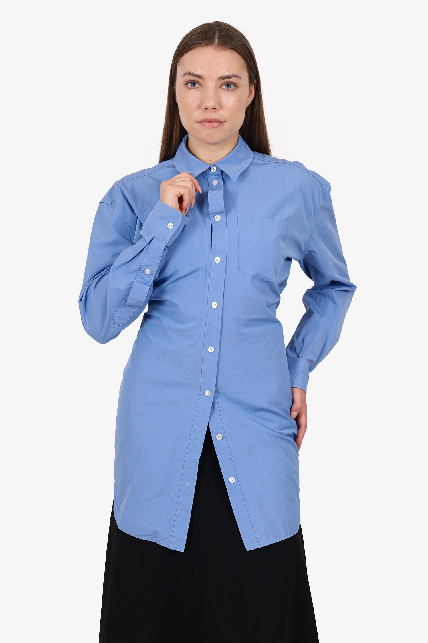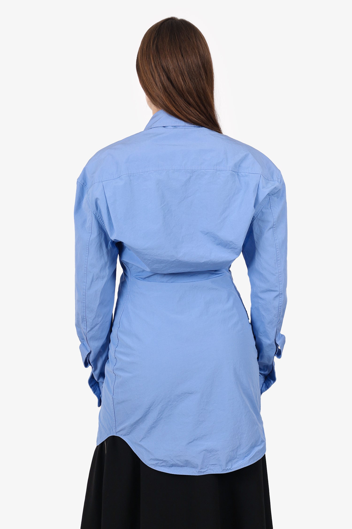 Refresh availabilityAlexander Wang Blue Shirt Dress. Collared neckline. Front button-up closure. Slit on front right side of buttons. Loop design in between top buttons. Single front exterior chest slip pocket. Sleeve cuffs with button-up closure. Tonal stitching.