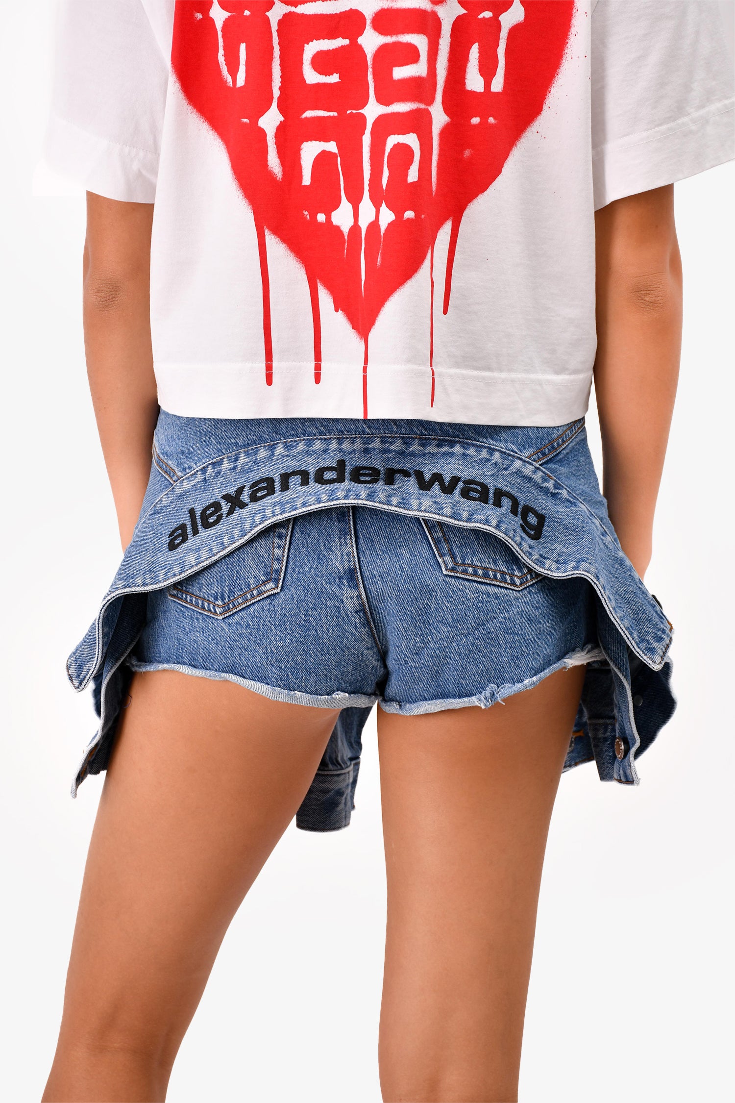 Refresh availabilityAlexander Wang Dark Wash Denim Shorts With Tied Jacket Detailing. Silver-tone hardware. Cuffed at the hem with some distressing. Fly hook closure with zipper. Tonal stitching.