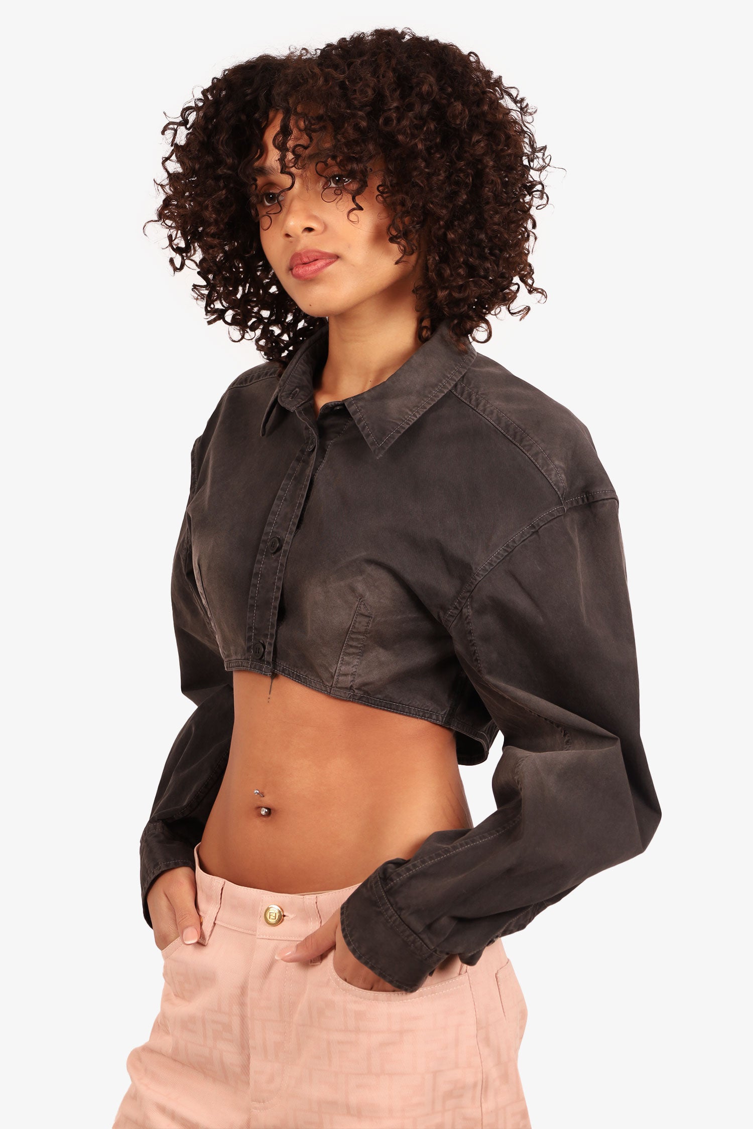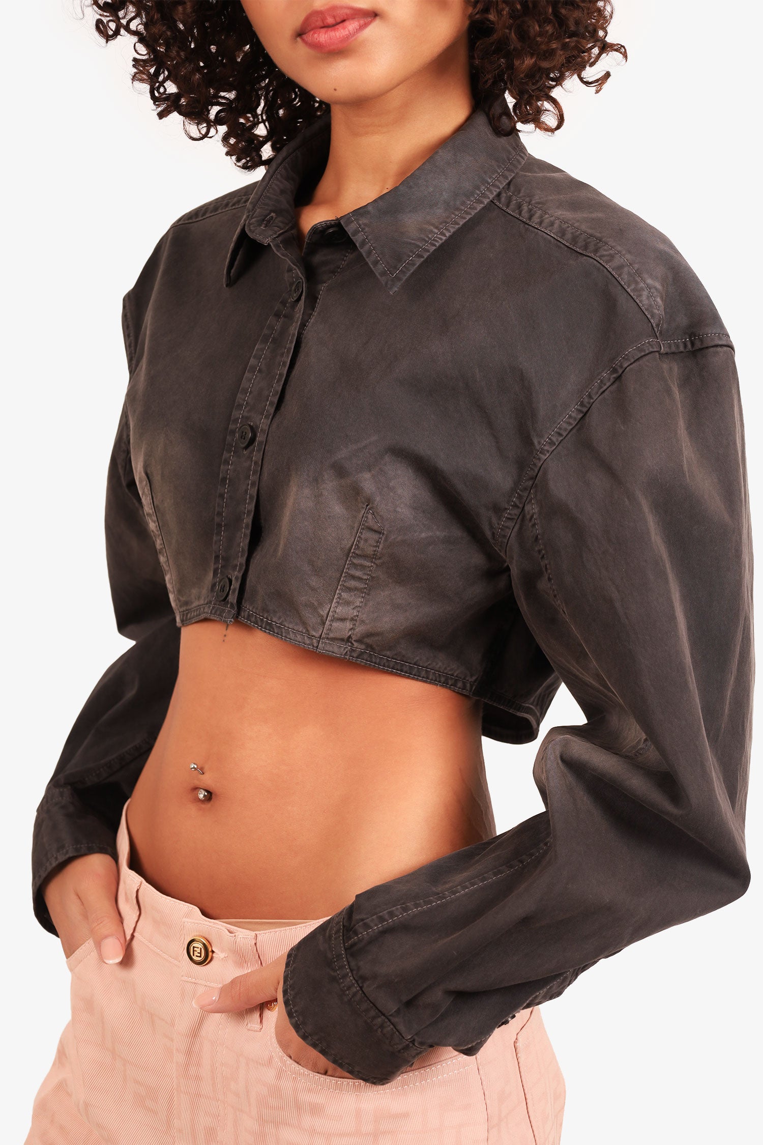 Refresh availabilityAlexander Wang Grey Cropped Button Down Shirt. Collared neckline. Front button-up closure. Button-up sleeve cuff closure. Tonal stitching.