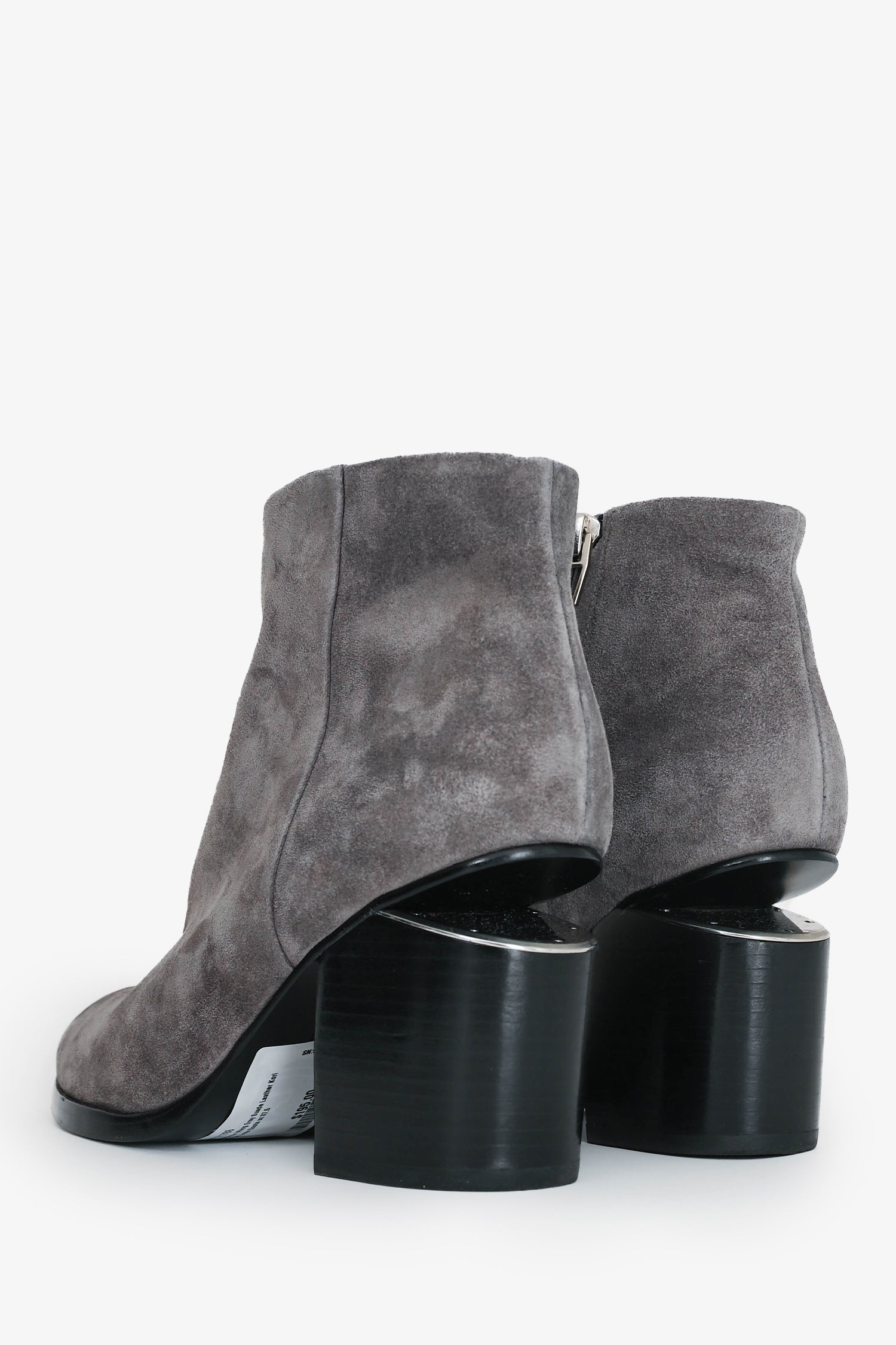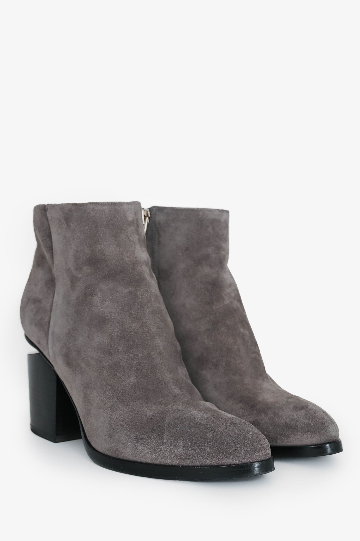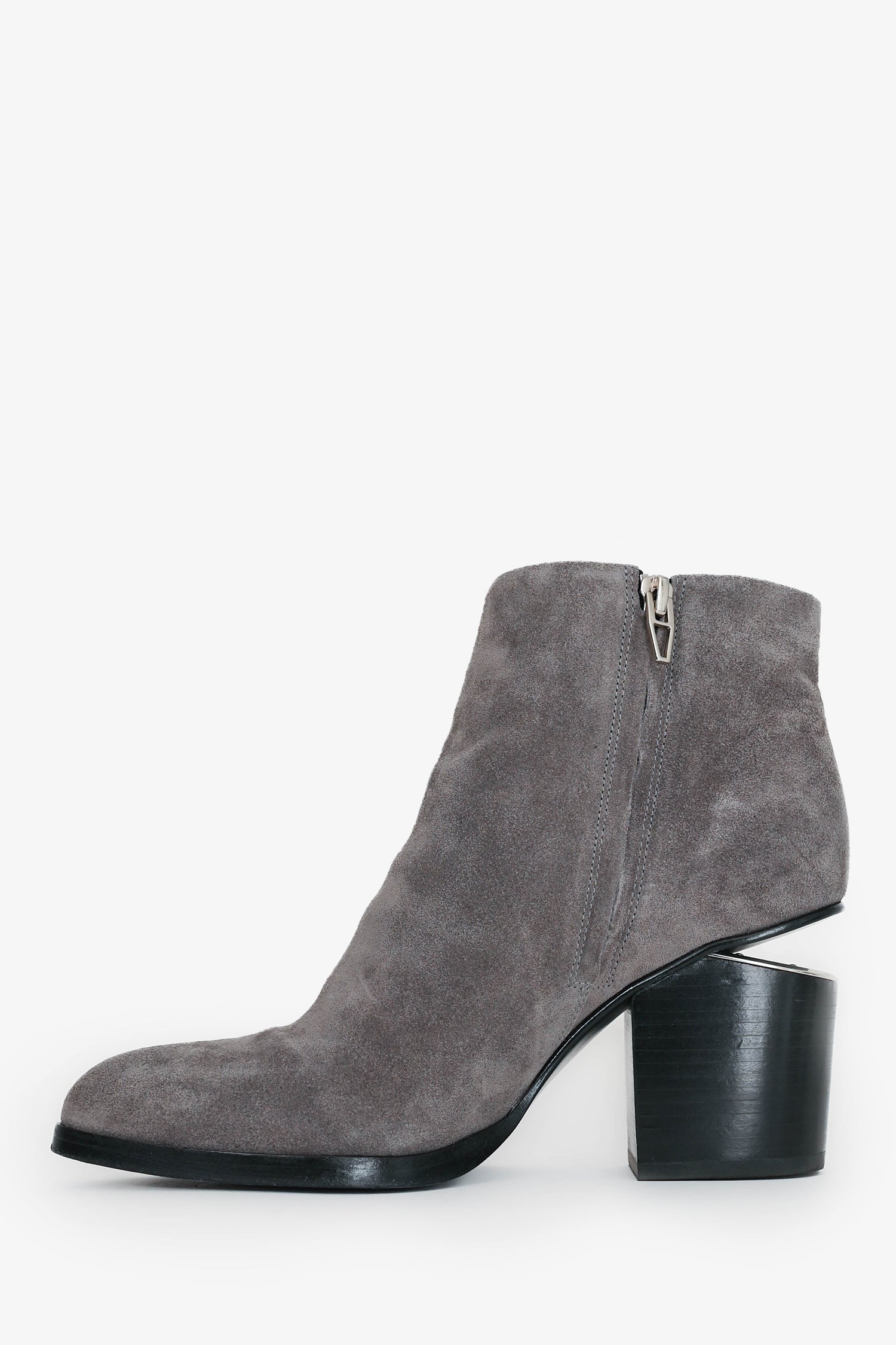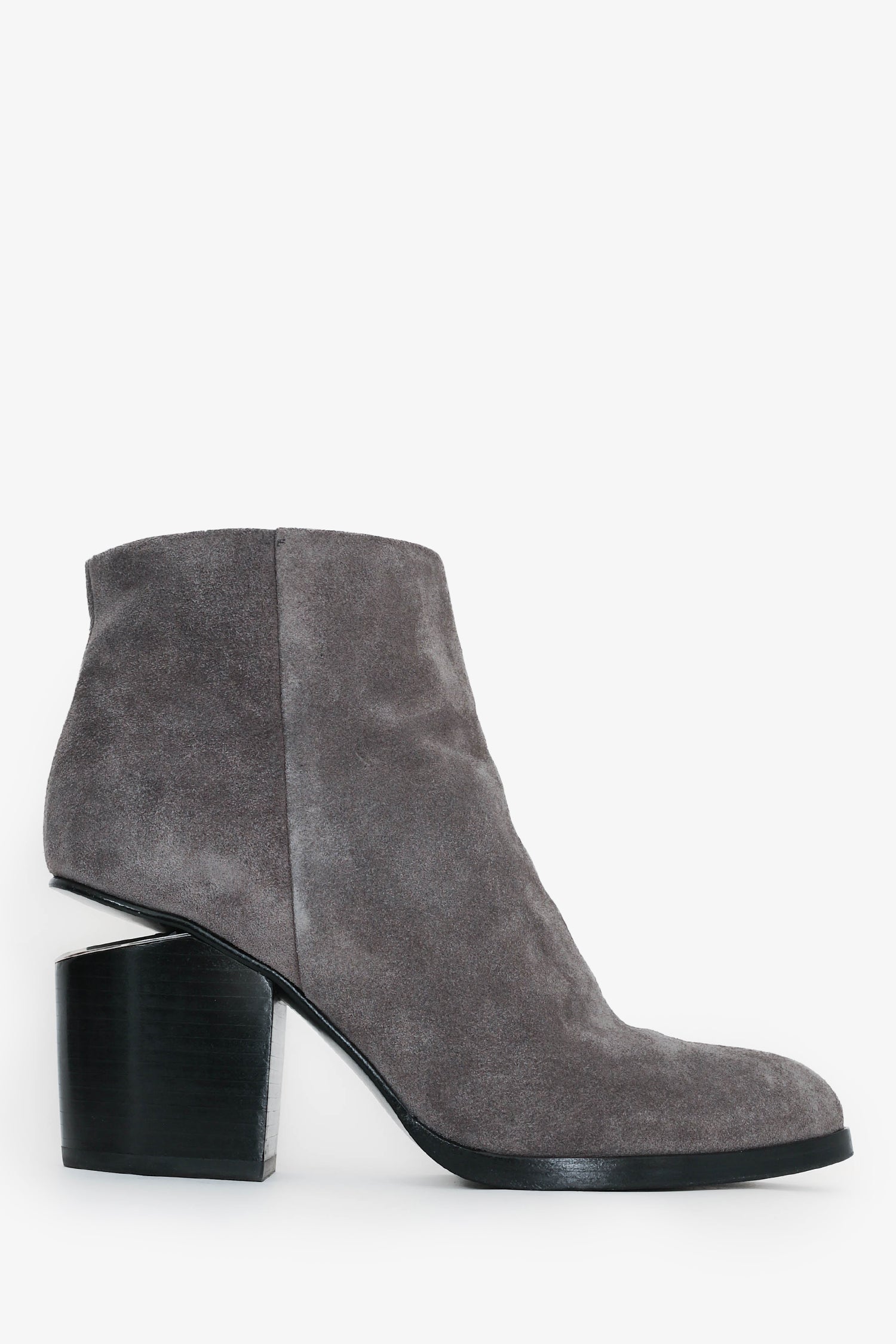 Refresh availabilityAlexander Wang Grey Suede Leather Kori Short Ankle Boots. Round toe. Side zip closure. Sliced detail on the heel.