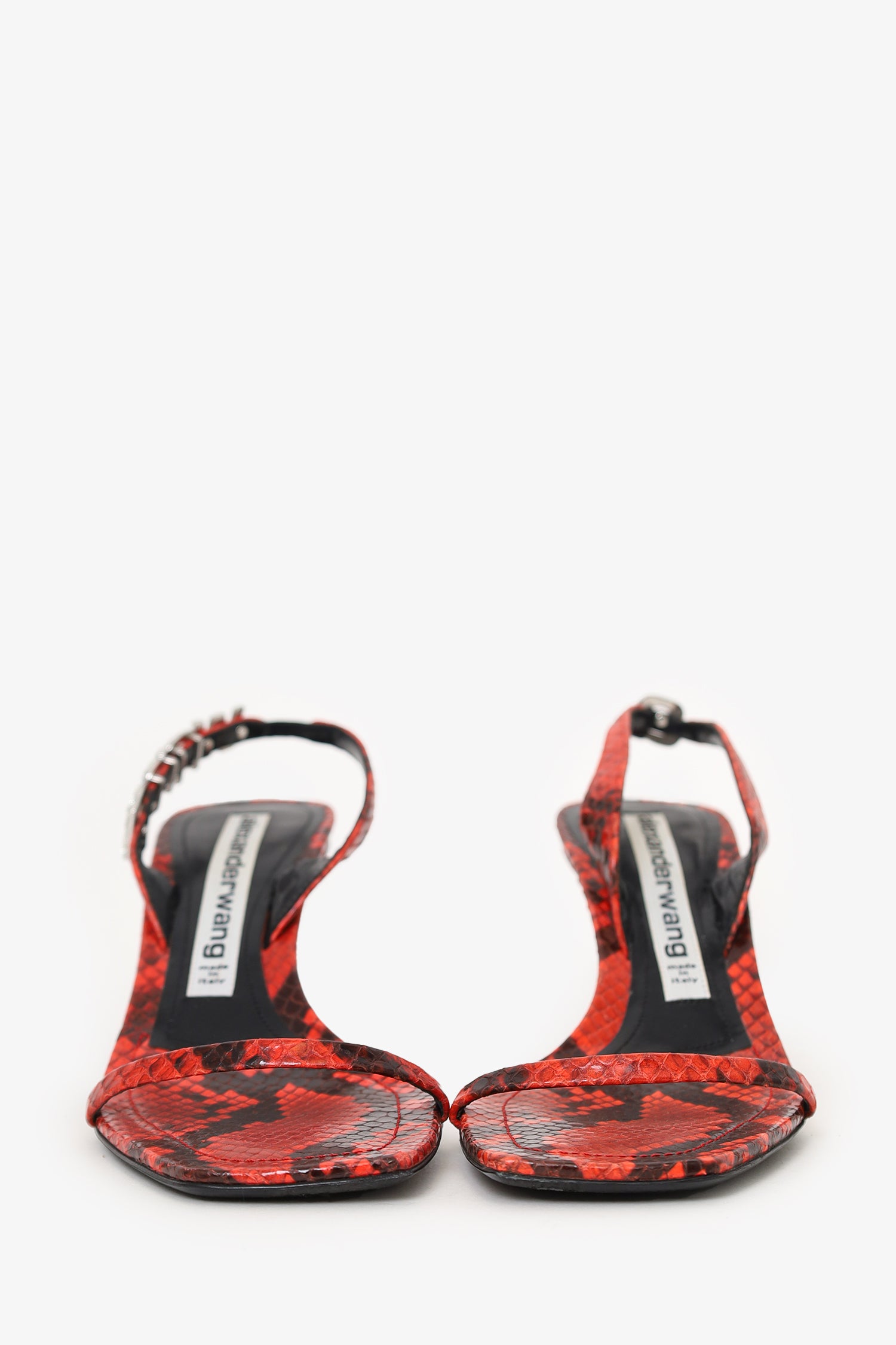 Refresh availabilityAlexander Wang Red/Black Snakeskin 'Wang' Embellished Strappy Heels. Pull-on. Square-open toe. Silver-tone hardware. Tonal stitching.