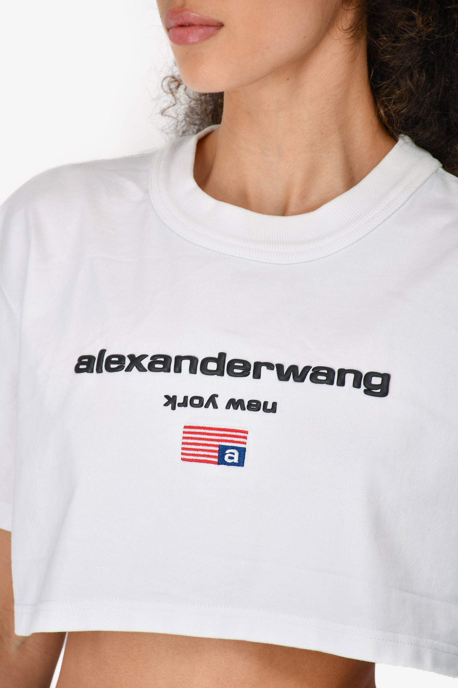 Refresh availabilityAlexander Wang White Crop Logo Short Sleeve Top. Round neckline. Embroidered logo on the front. Ribbed neckline. Tonal stitching.