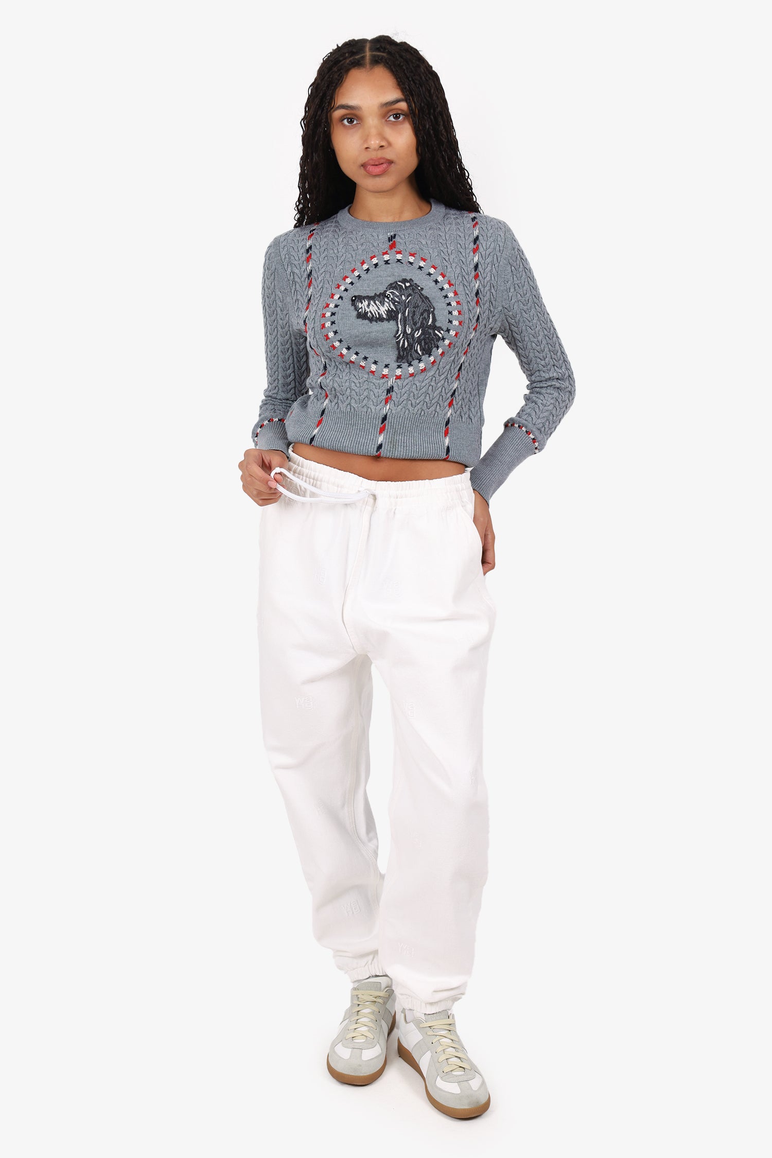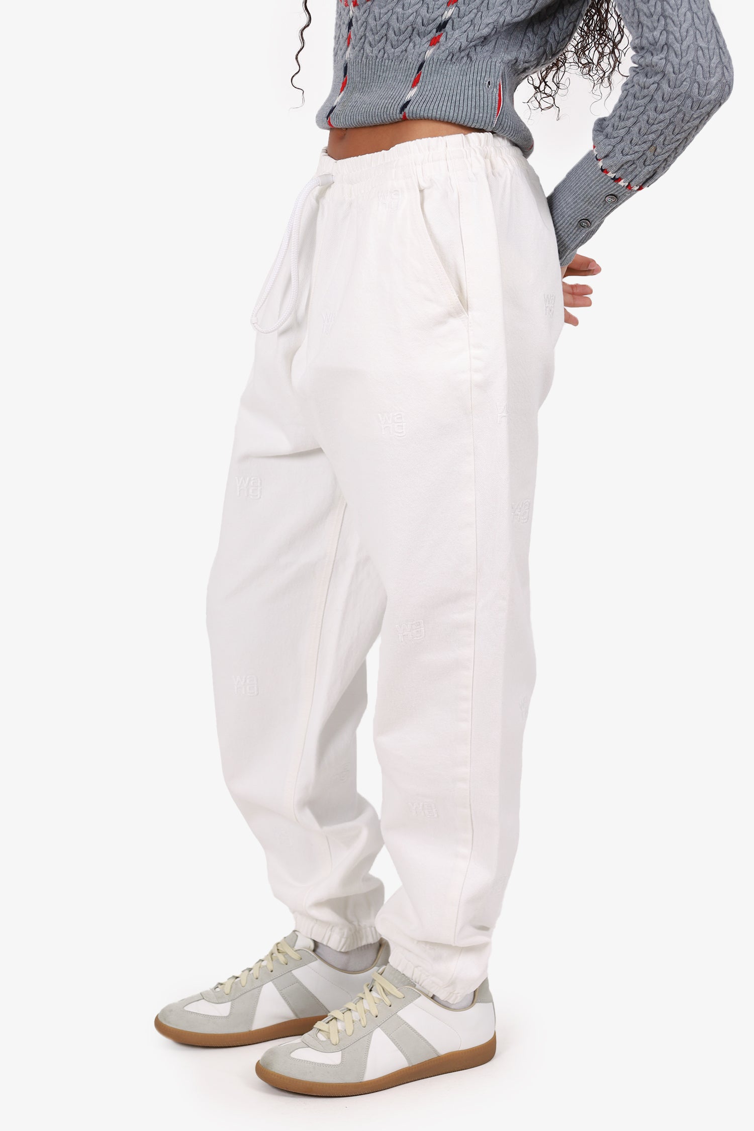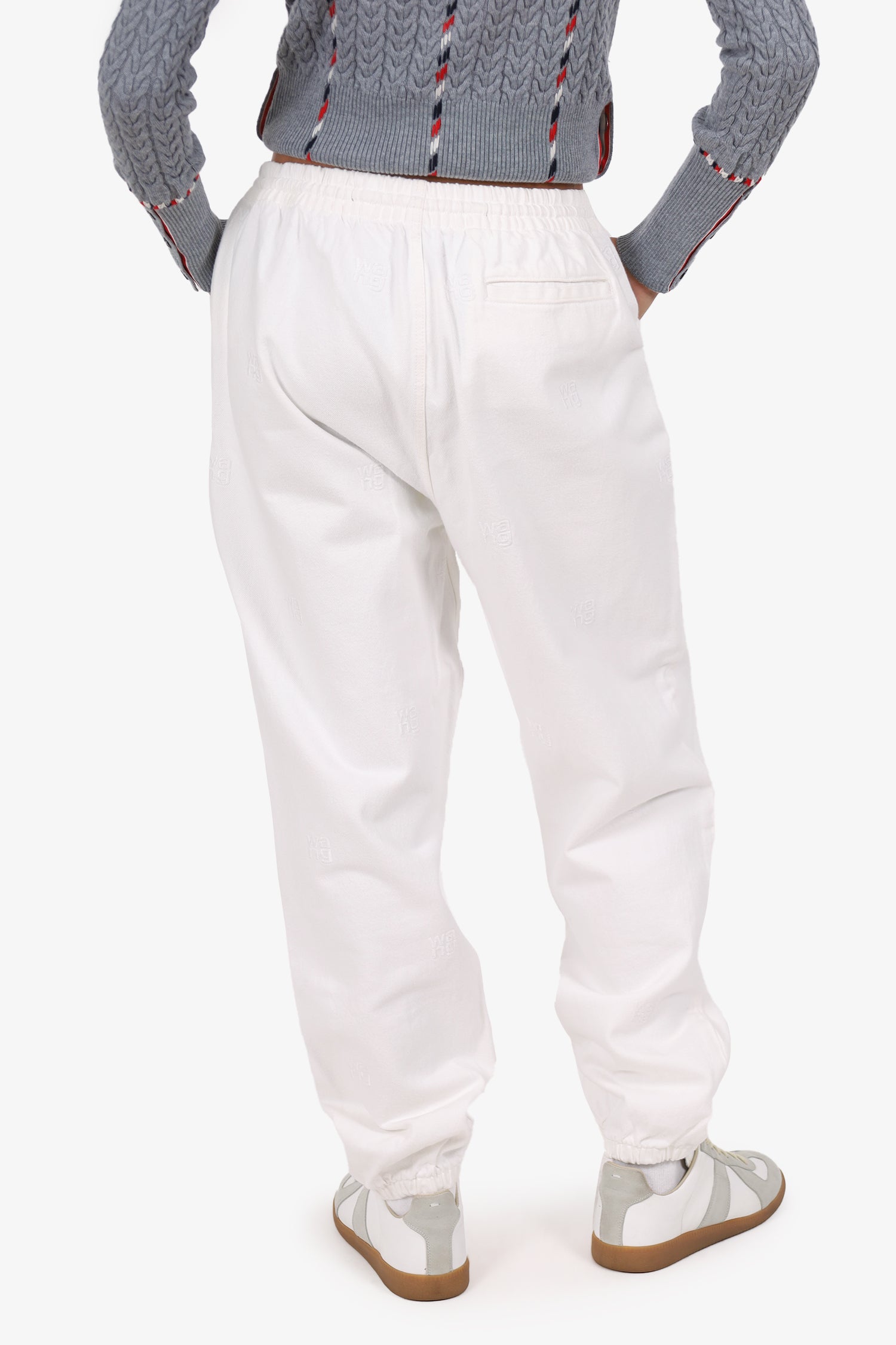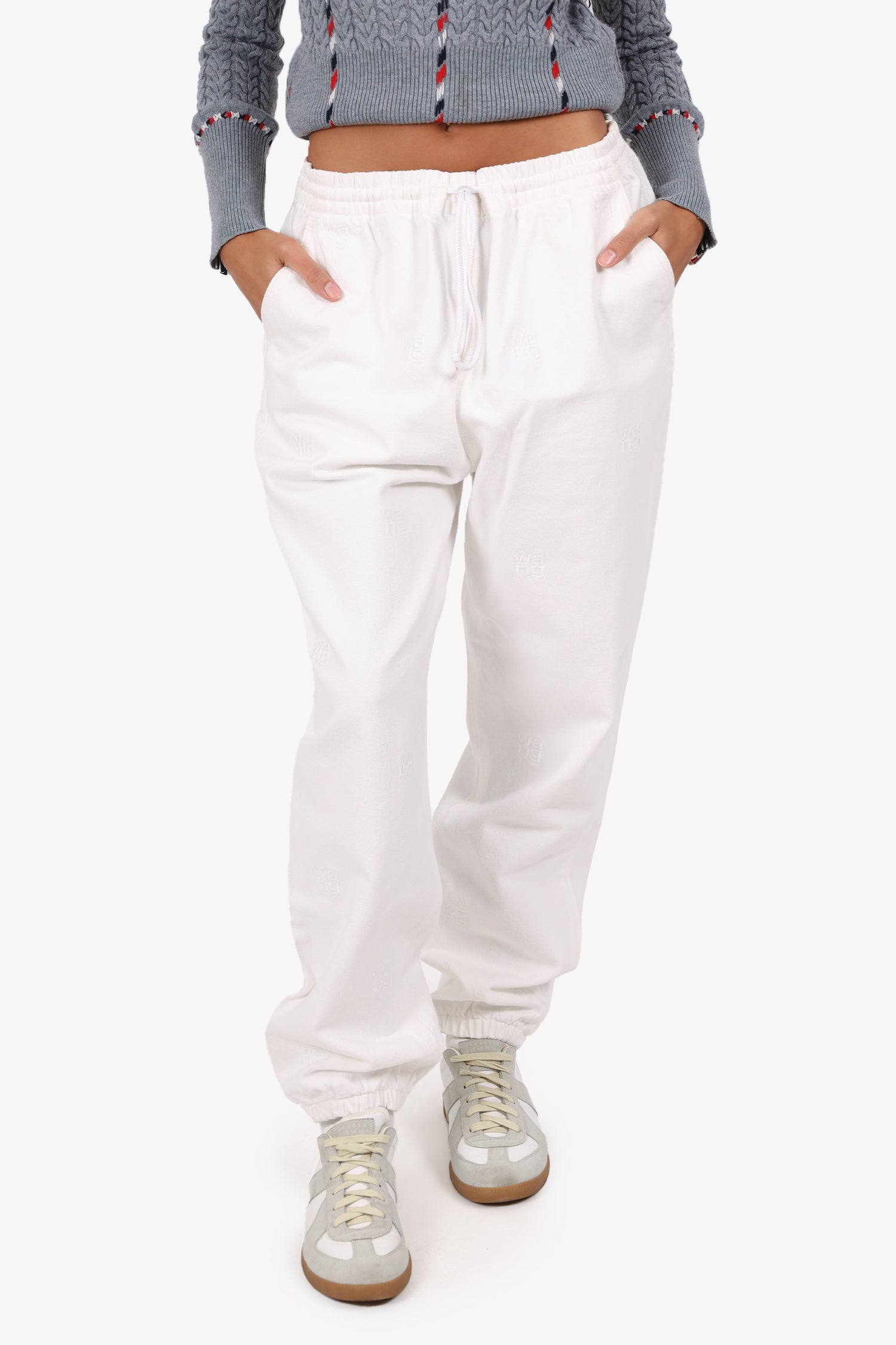 Refresh availabilityAlexander Wang White Elasticated Waist 'WANG' Embroidered Jeans. Slip-on. Elasticated waistband with cinching drawstring. 3 exterior pockets; 2 side slip and 1 slip. Elasticated sleeve cuffs. Tonal stitching.