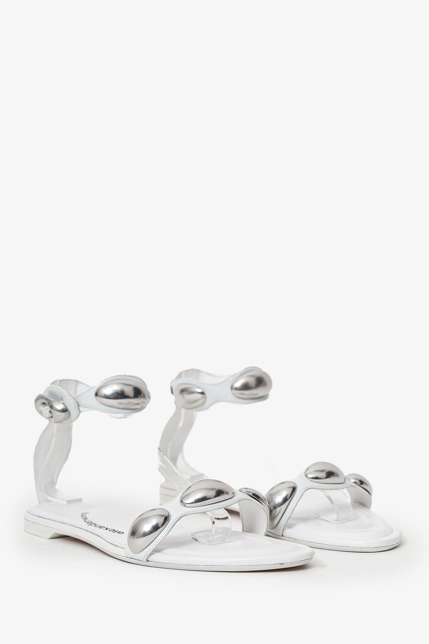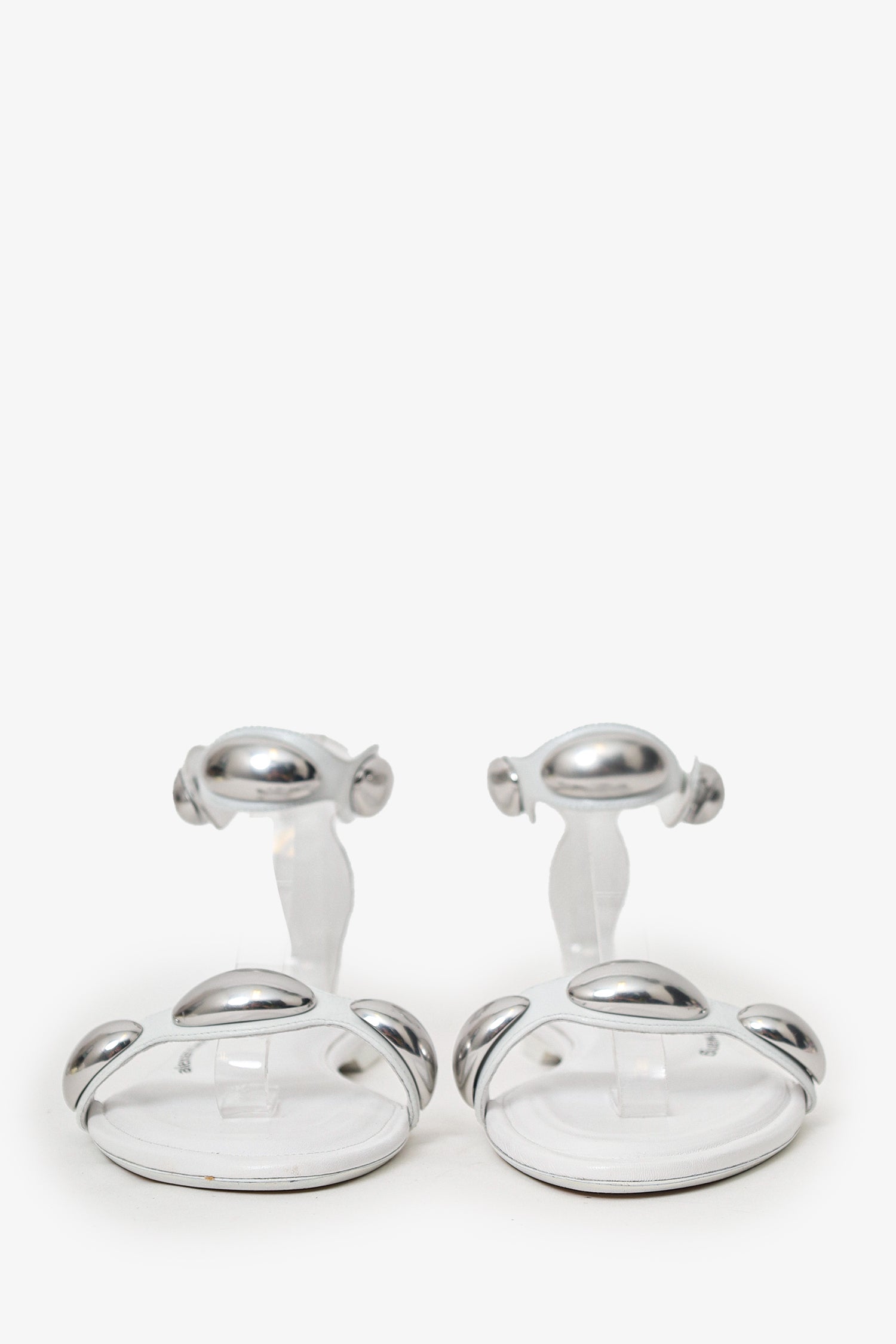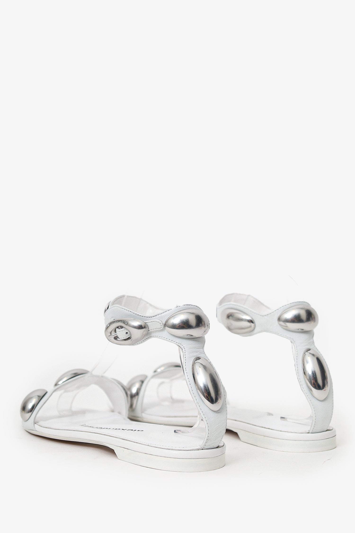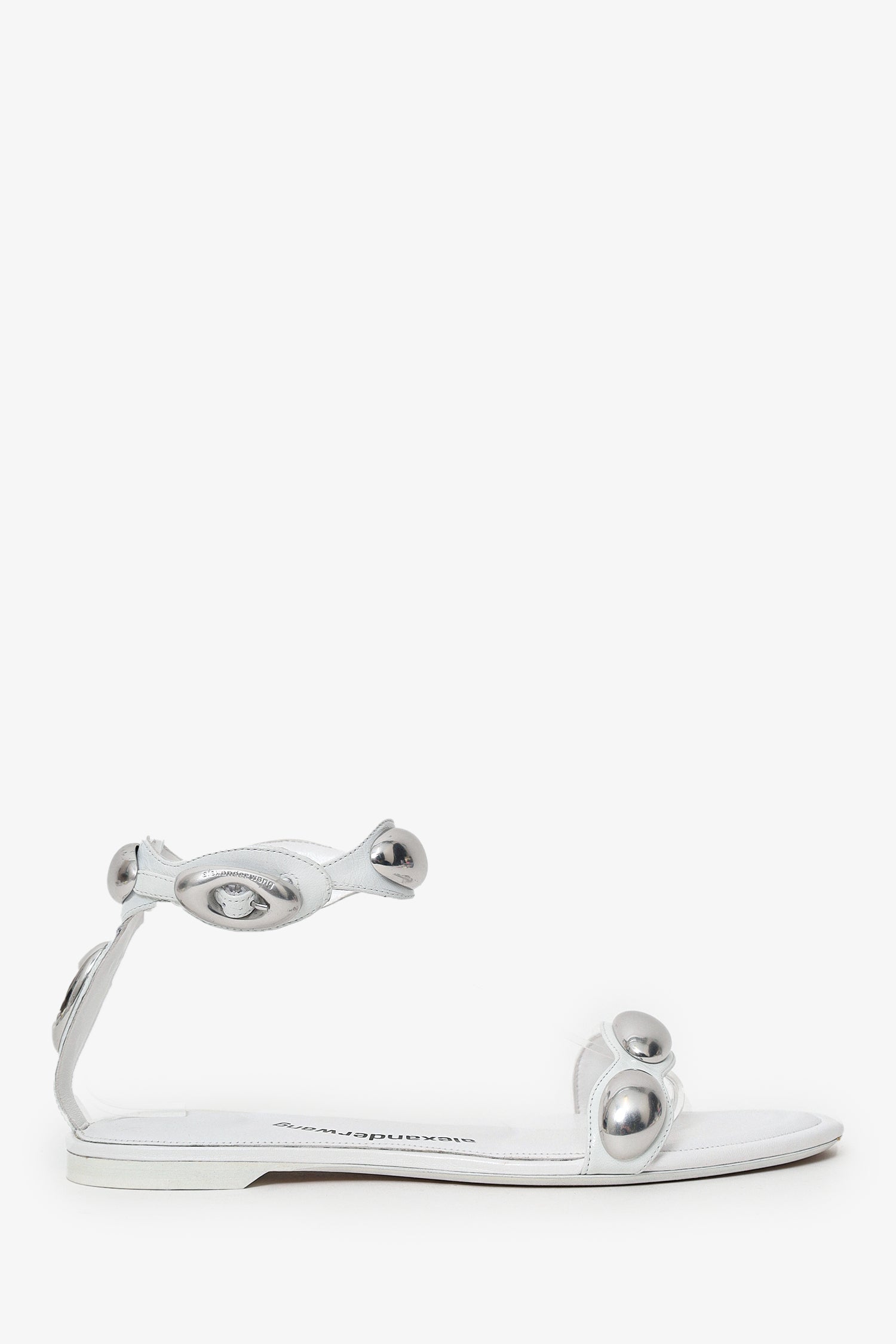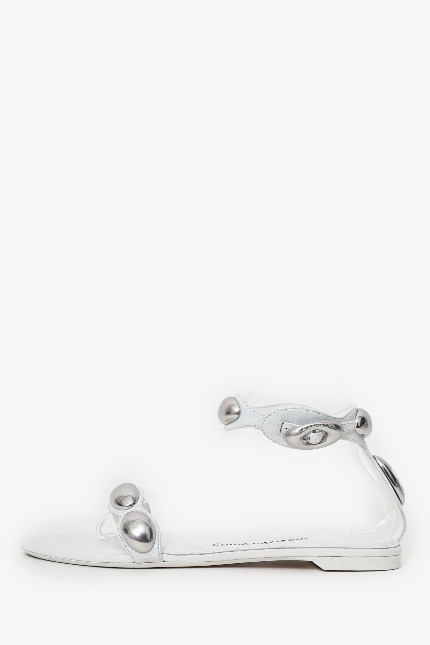 Refresh availabilityAlexander Wang White Leather SHW Sandals. Slip-on. Open-toe. Ankle strap with buckle closure and stud hardware. Leather lining and insole. Silver-tone hardware. Tonal stitching.