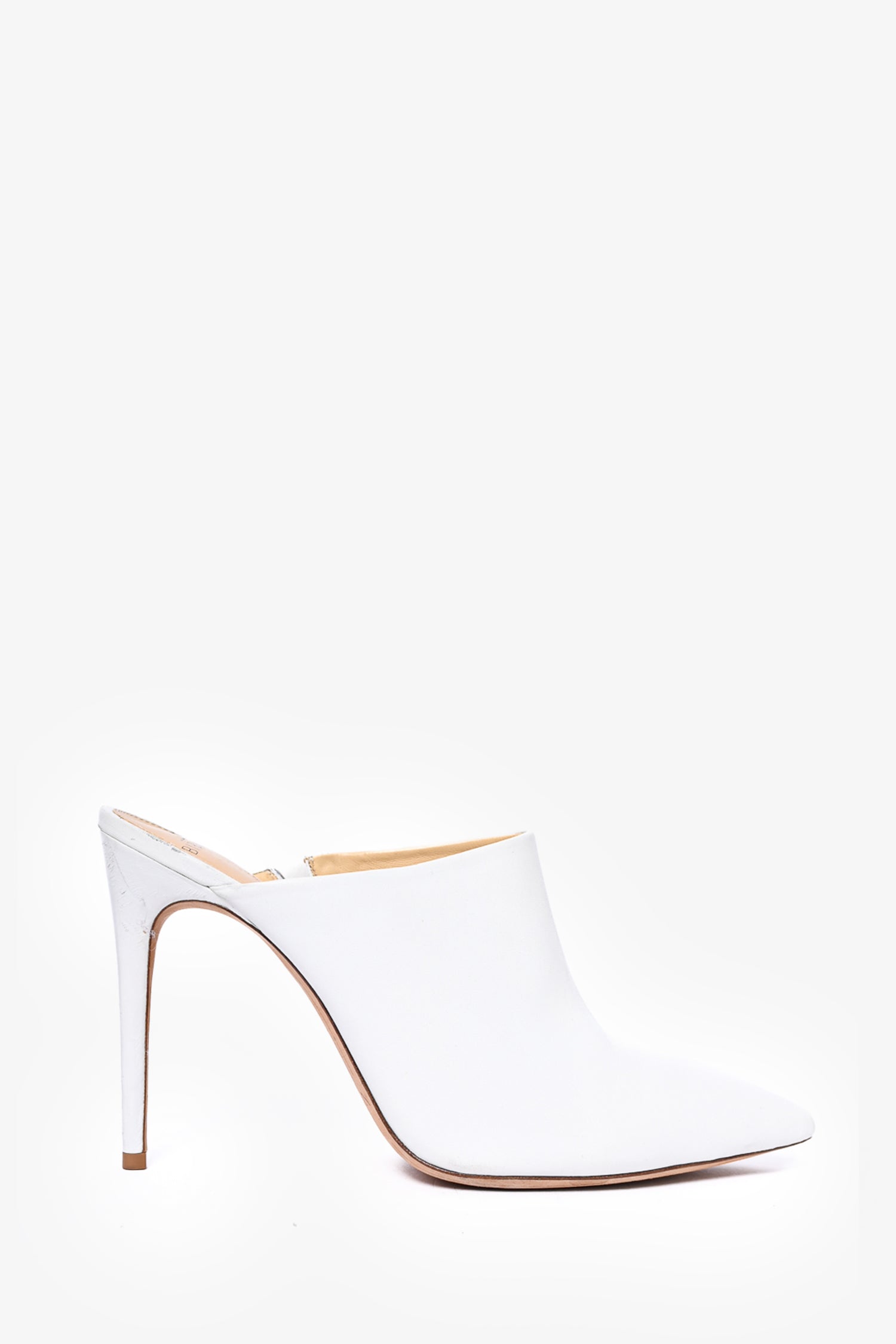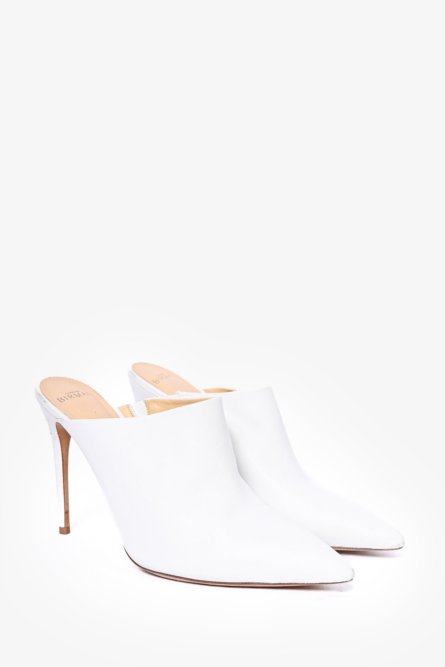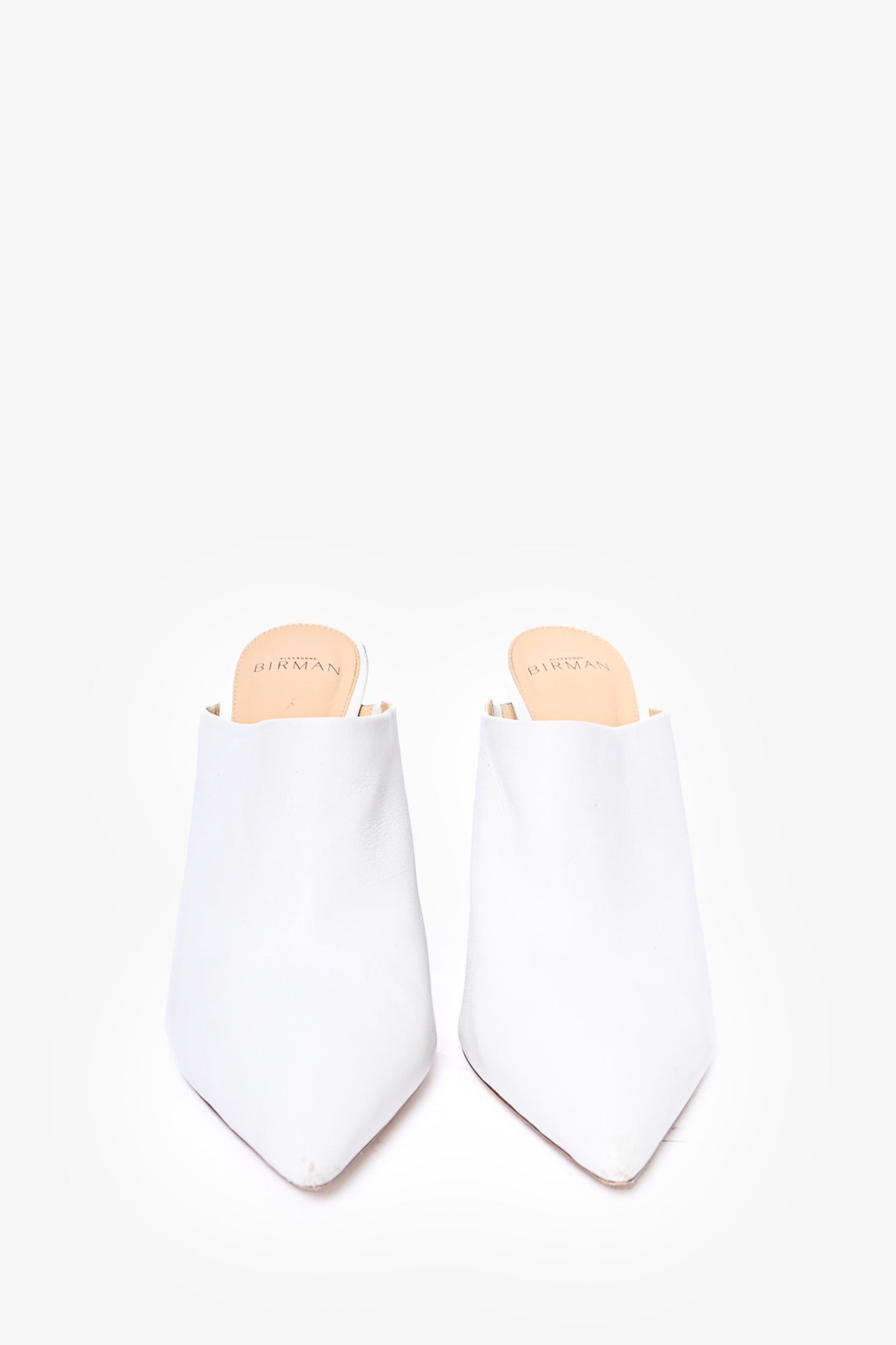 Refresh availabilityAlexandre Birman White Leather Heeled Mules. Pointed-toe front. Leather interior. Tonal stitching.