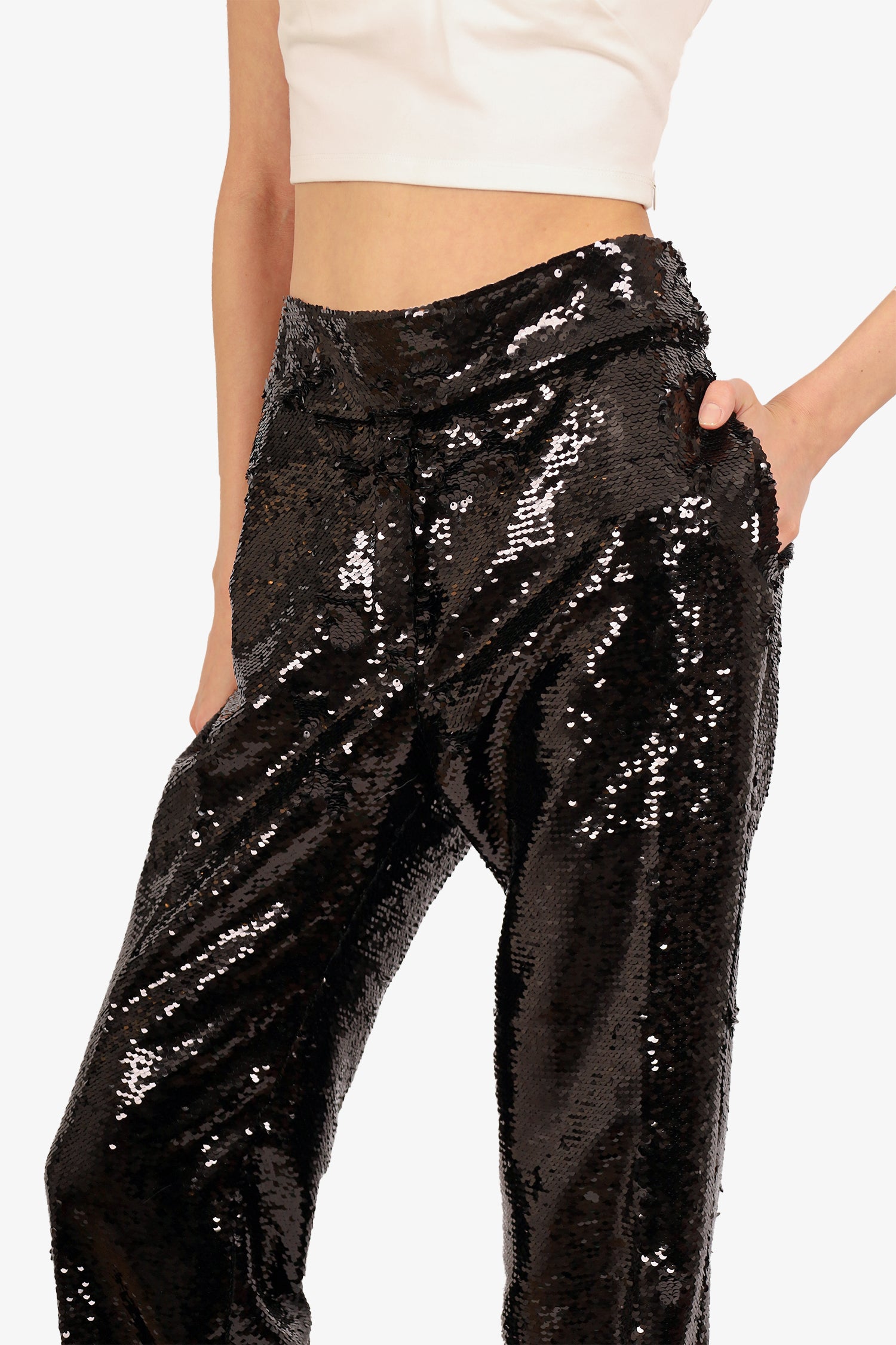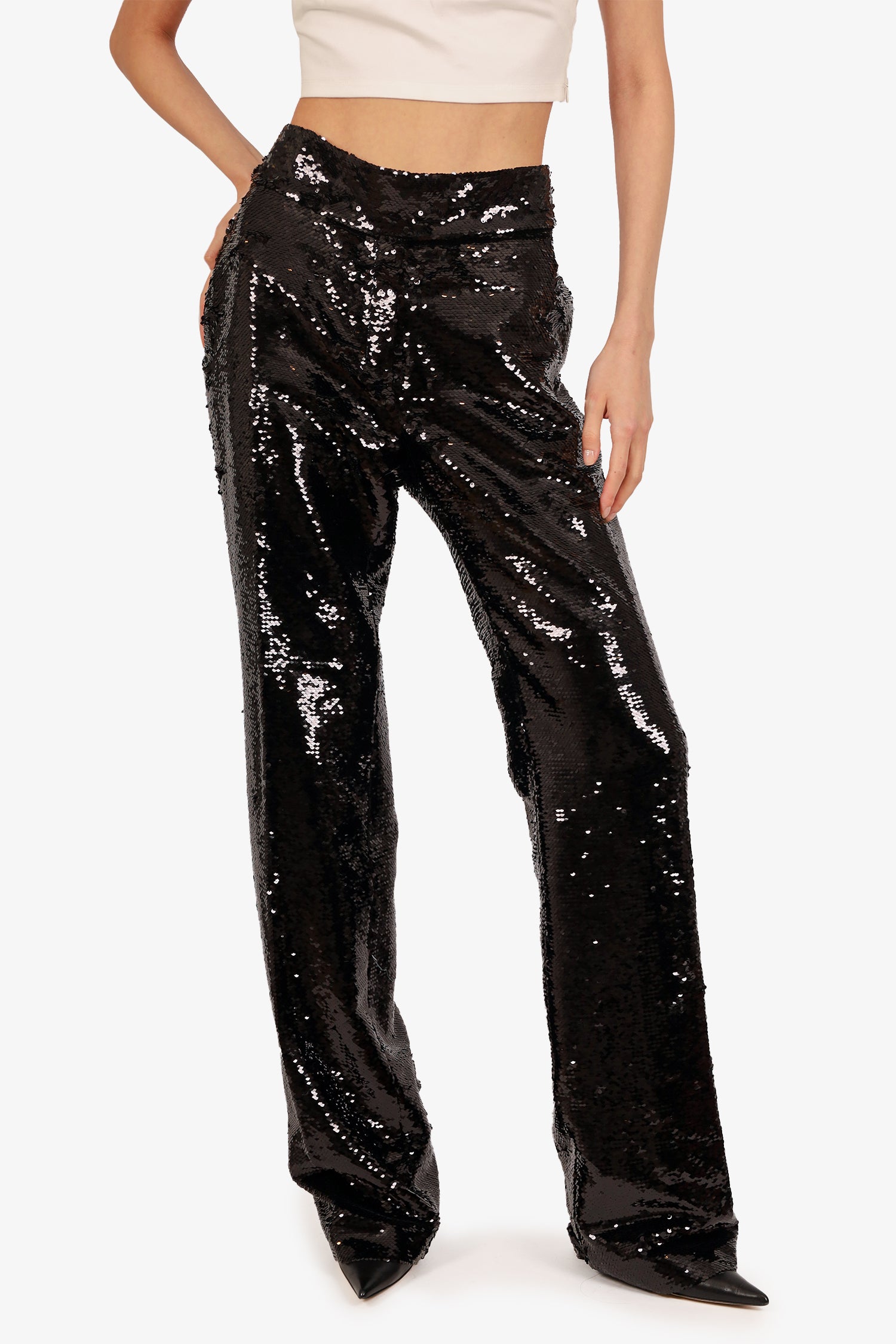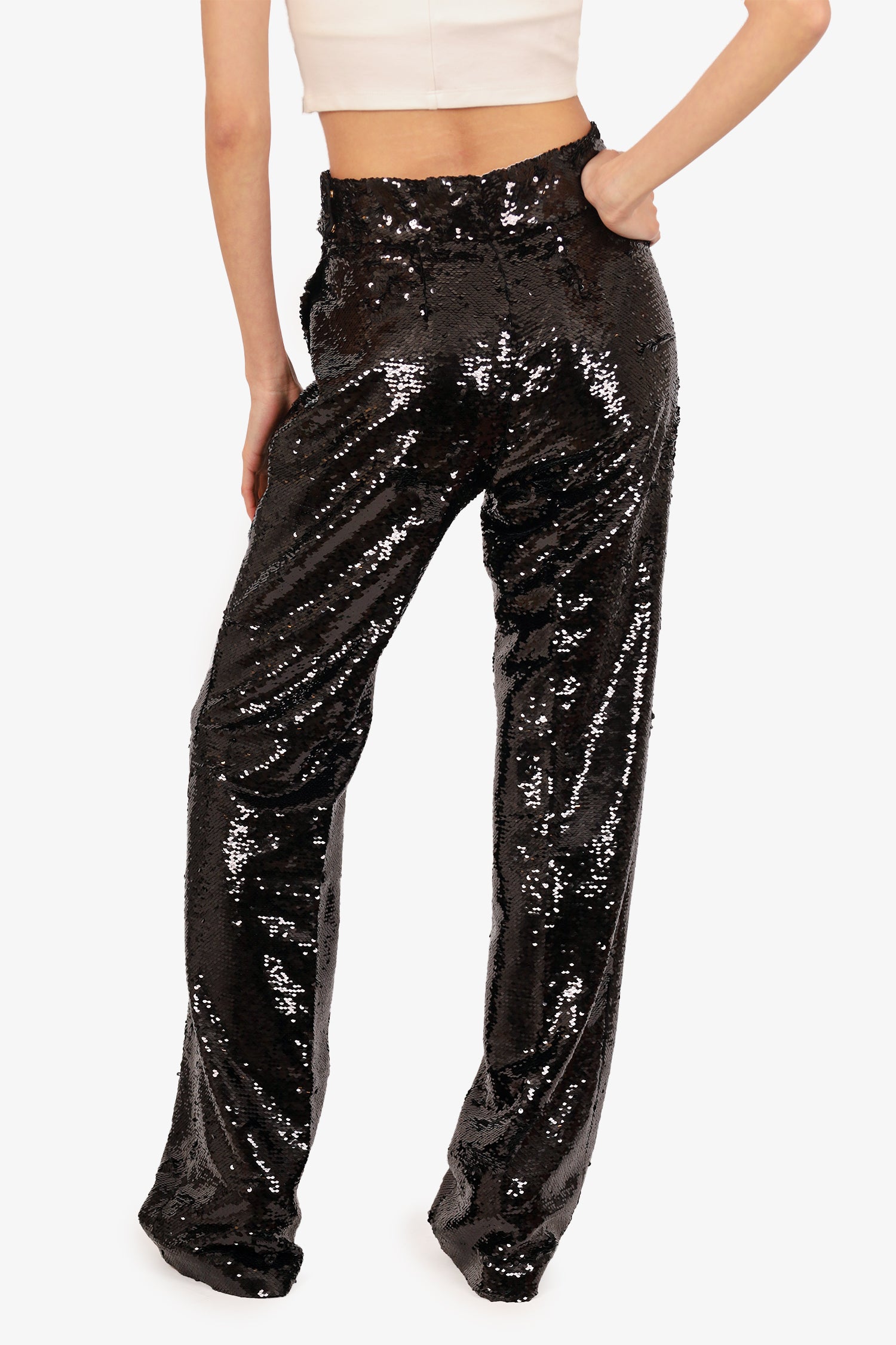 Refresh availabilityAlexandre Vauthier Black Sequin High Waisted Pants. Front zip with dual hook closure. Gold-tone hardware. Lined. Tonal stitching.