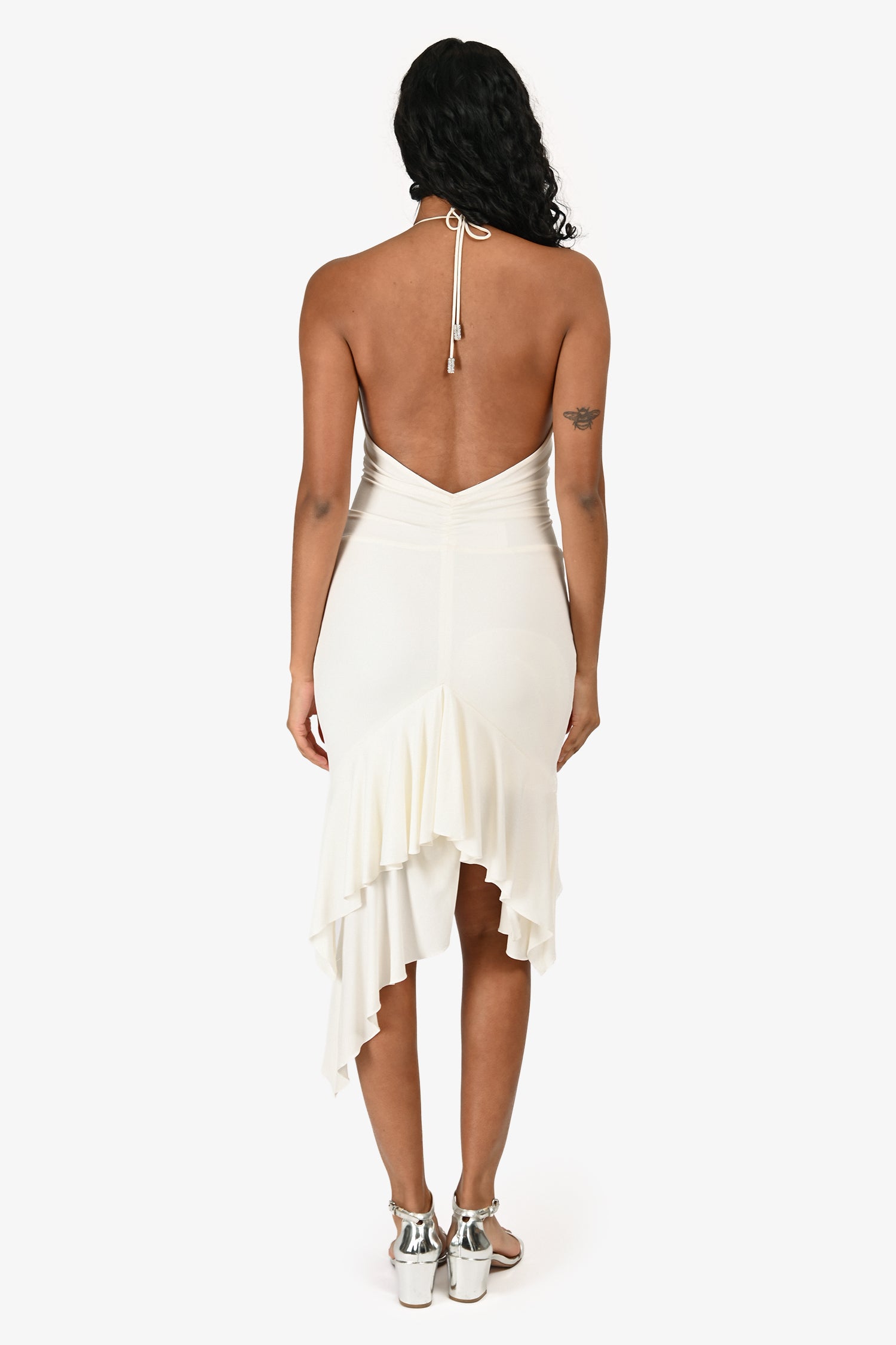 Refresh availabilityAlexandre Vauthier White Tiered Halterneck Midi Dress. Slip-on. Halter V-neck with tie closure. Fully lined. Silver-tone hardware. Tonal stitching.