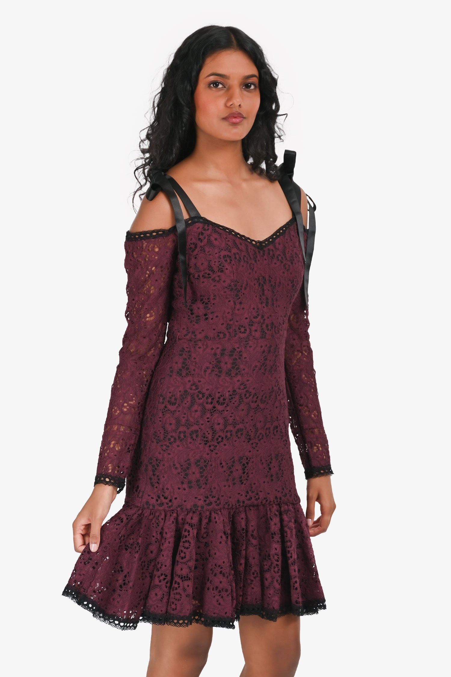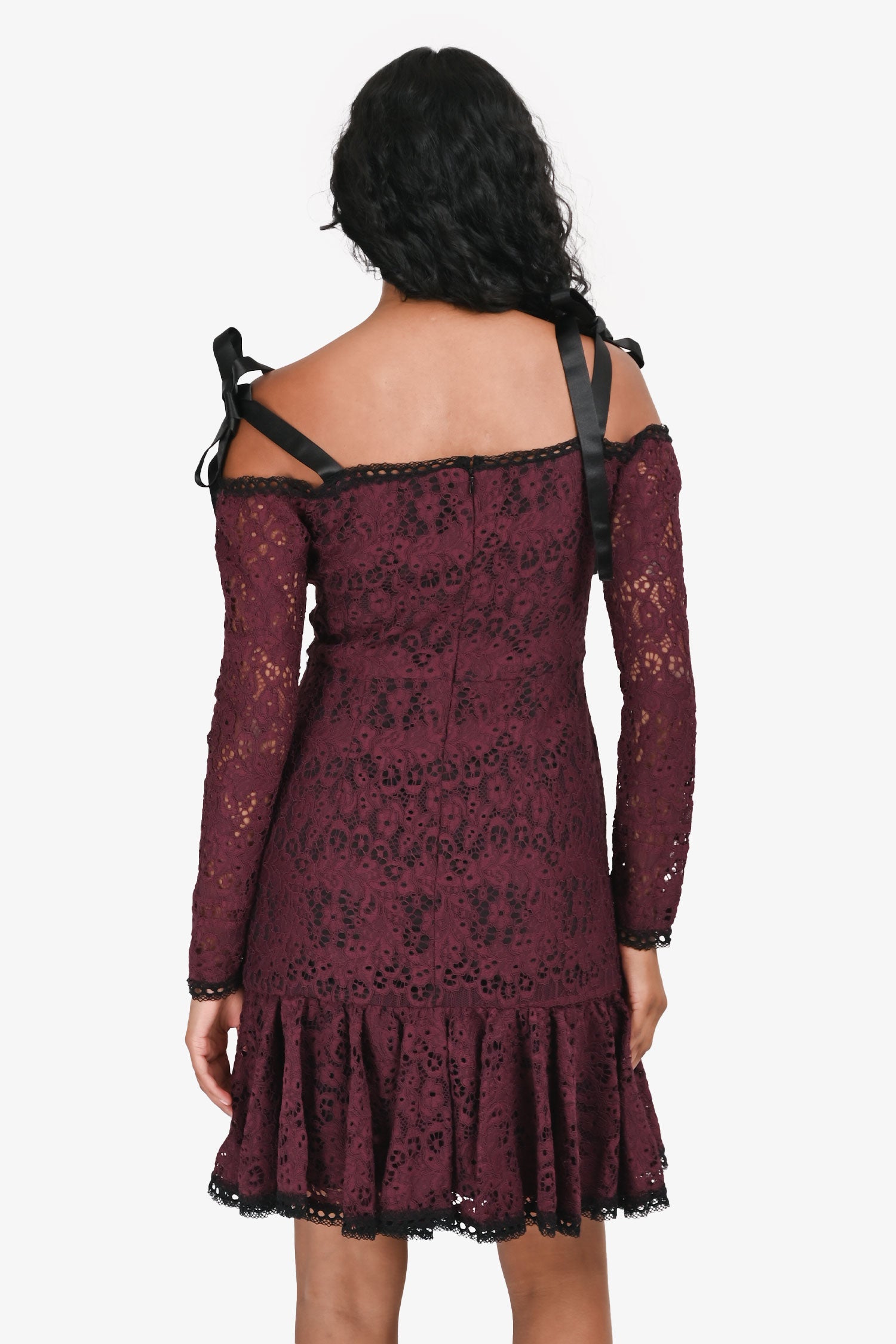 Refresh availabilityAlexis Dark Purple Lace Black Satin Bow Detail Long Sleeves Mini Dress. Square neckline. Sheer lace long sleeves. Shoulder adjustable tie straps. Fully lined. Tonal stitching.