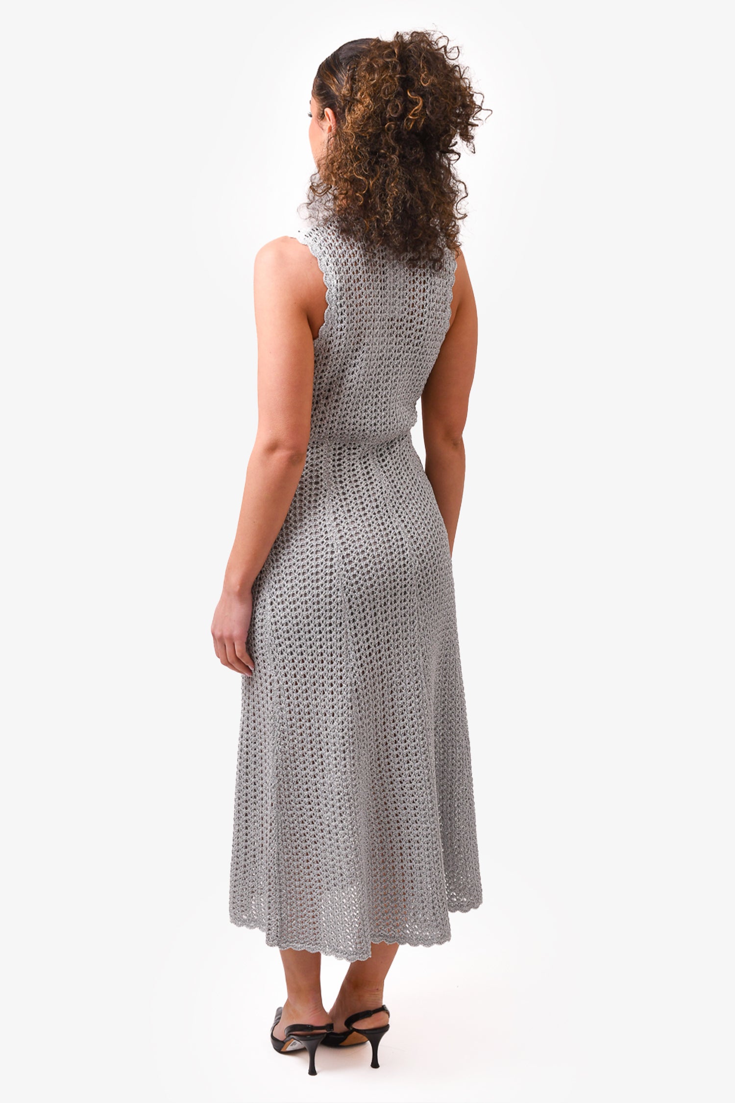 Refresh availabilityAlice McCall Silver Metallic Knit Button-up Dress with Slip. V-neckline. Front button detail. Lined with slip. Tonal stitching.