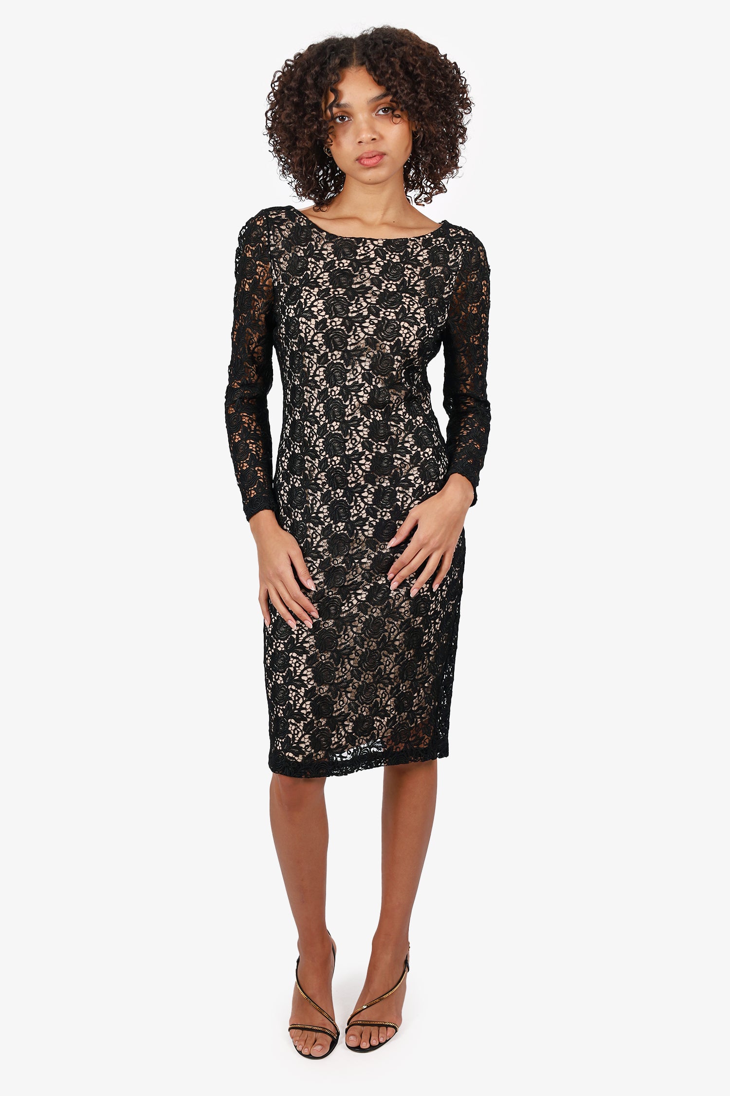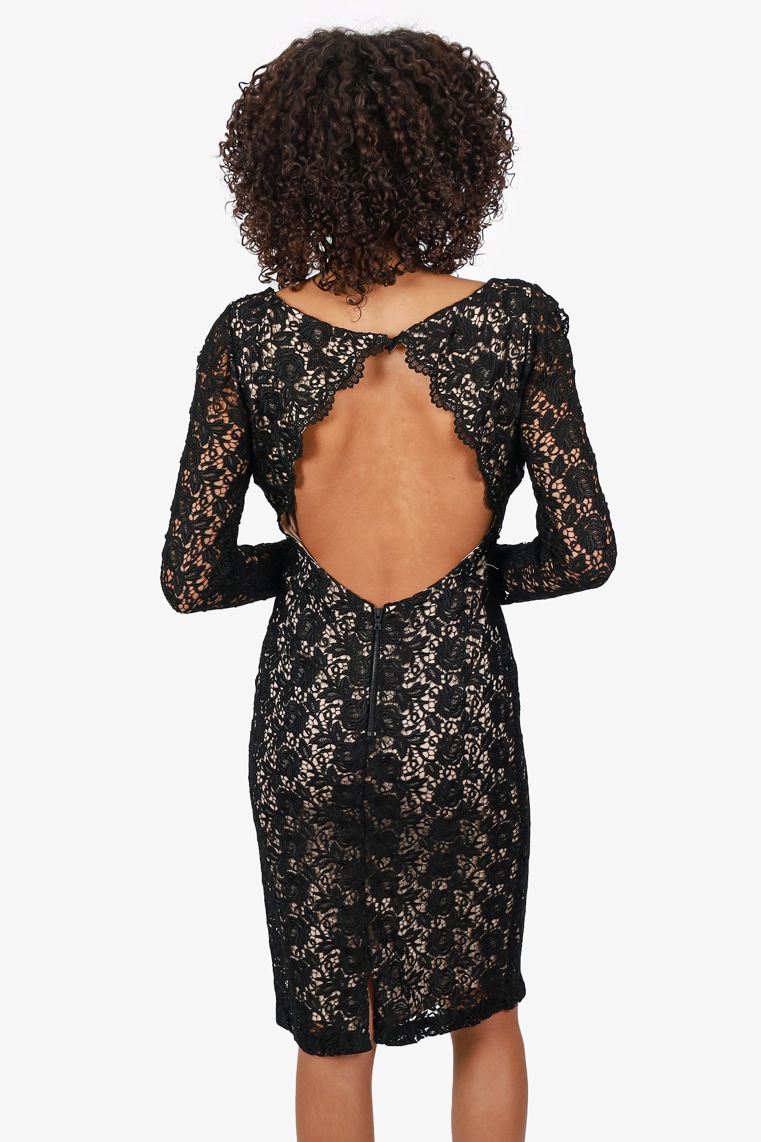 Refresh availabilityAlice & Olivia Black Lace Long Sleeve Dress. Slip-on. Open back with zip closure and button closure at rear neckline. Sleeve cuffs with zip pockets. Partially lined.