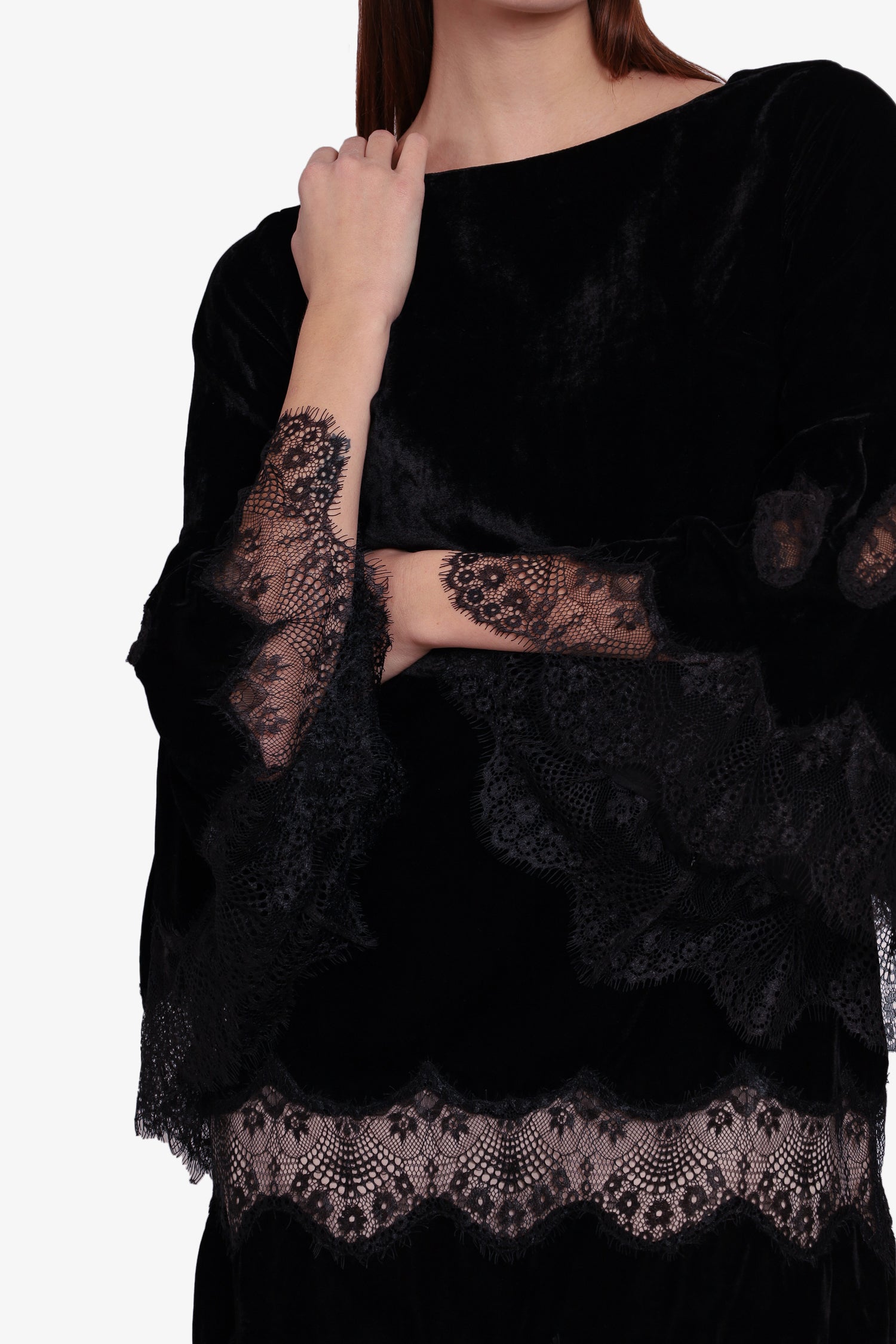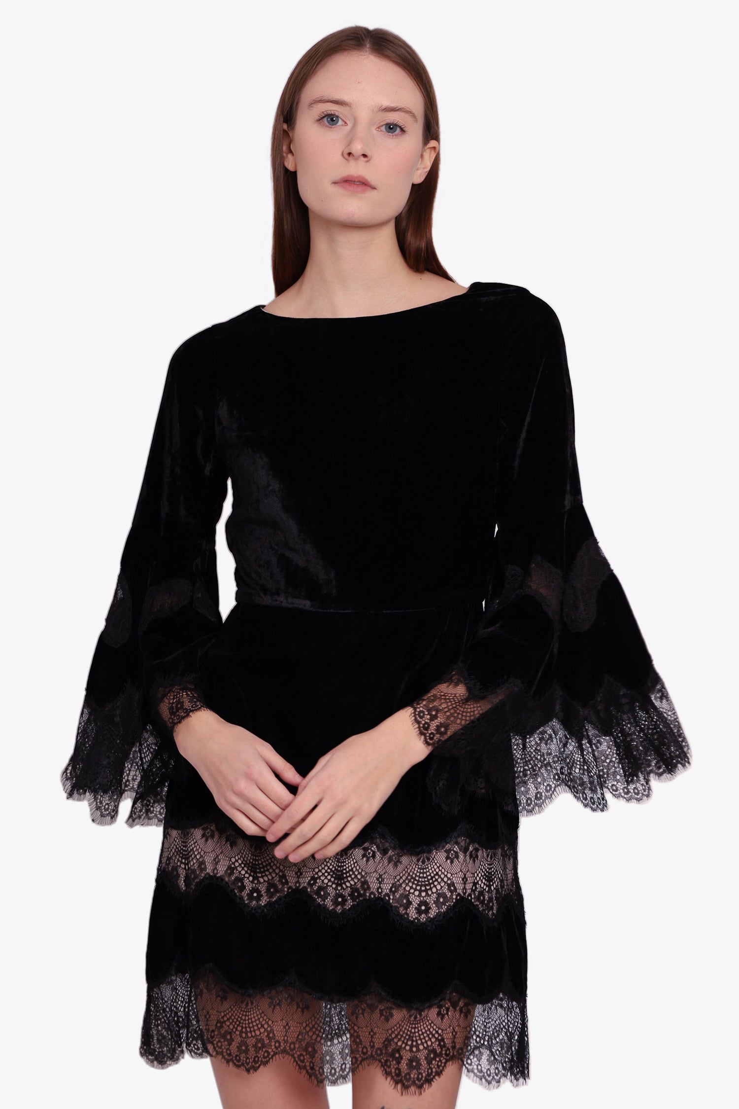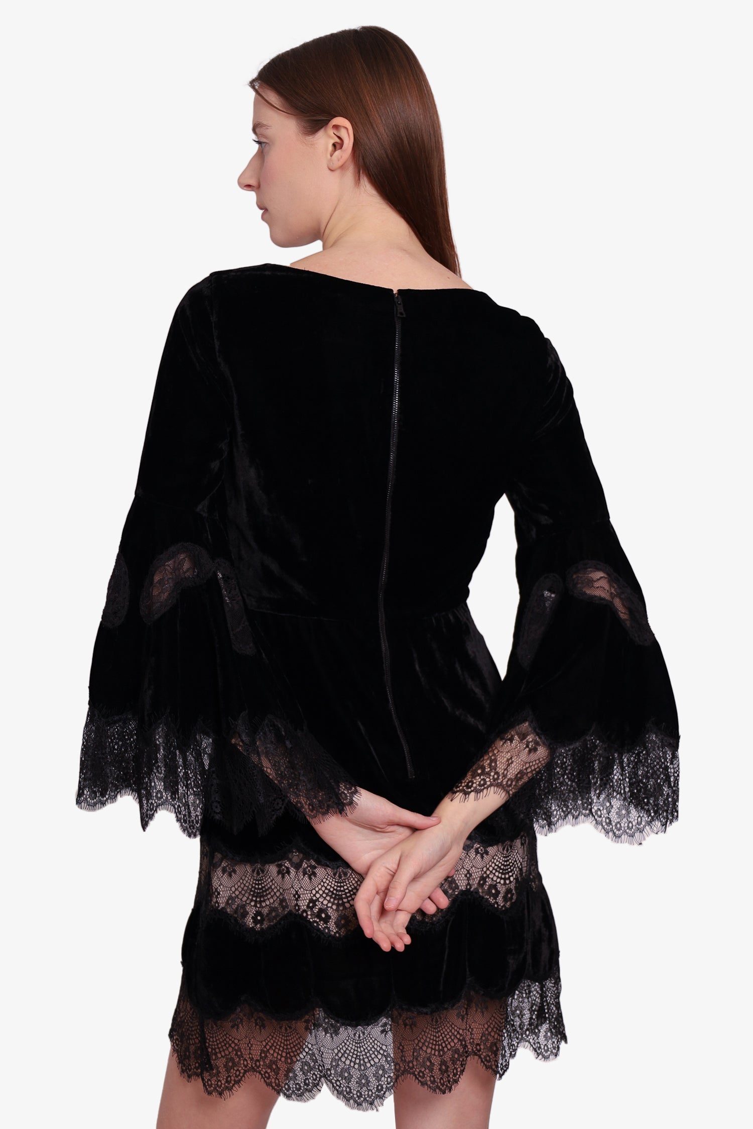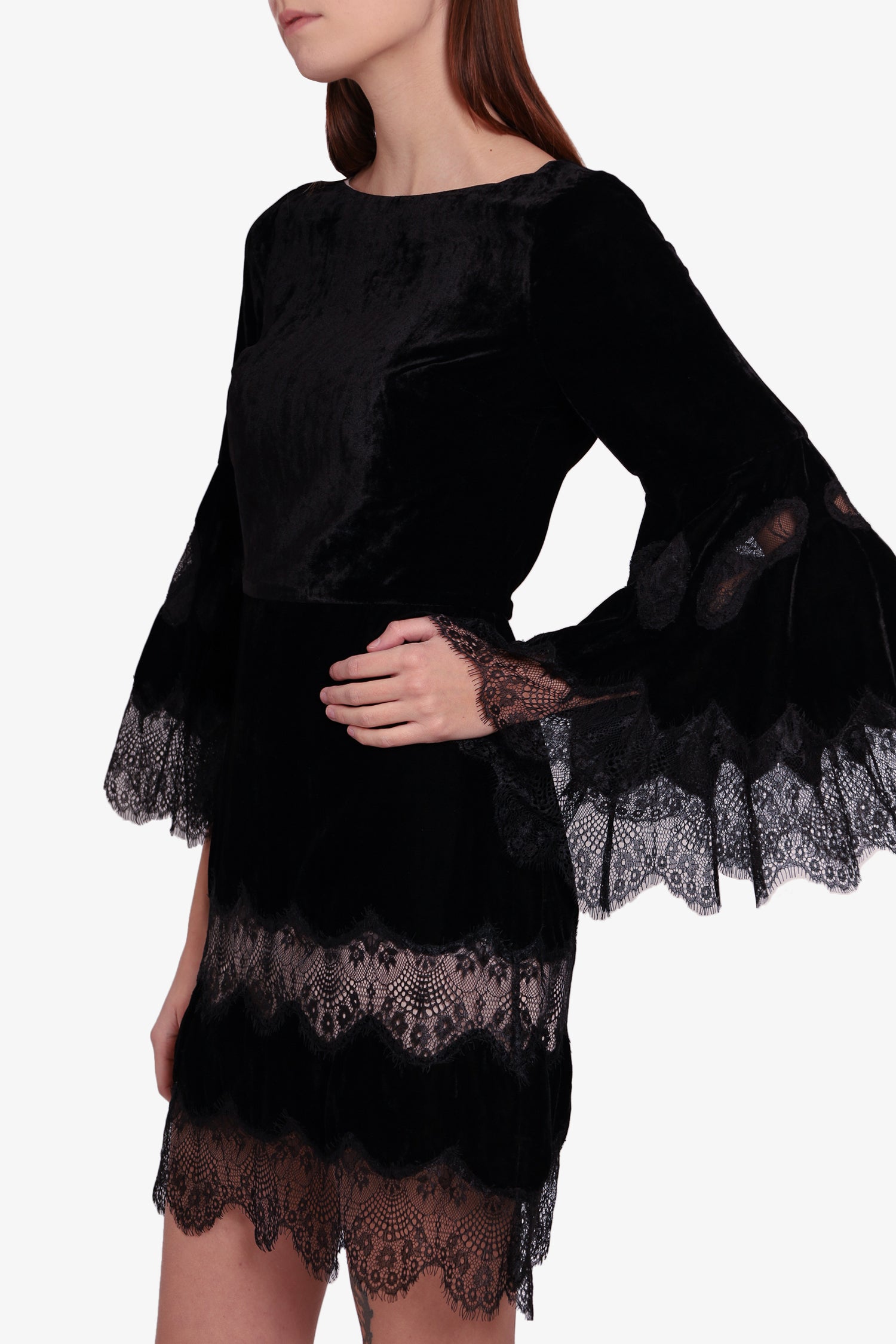 Refresh availabilityAlice + Olivia Black Velvet Lace Mini Dress. Round neckline. Back zipper closure. Flared sleeves. Laced sleeve & hem. Inner lining. Tonal stitching.