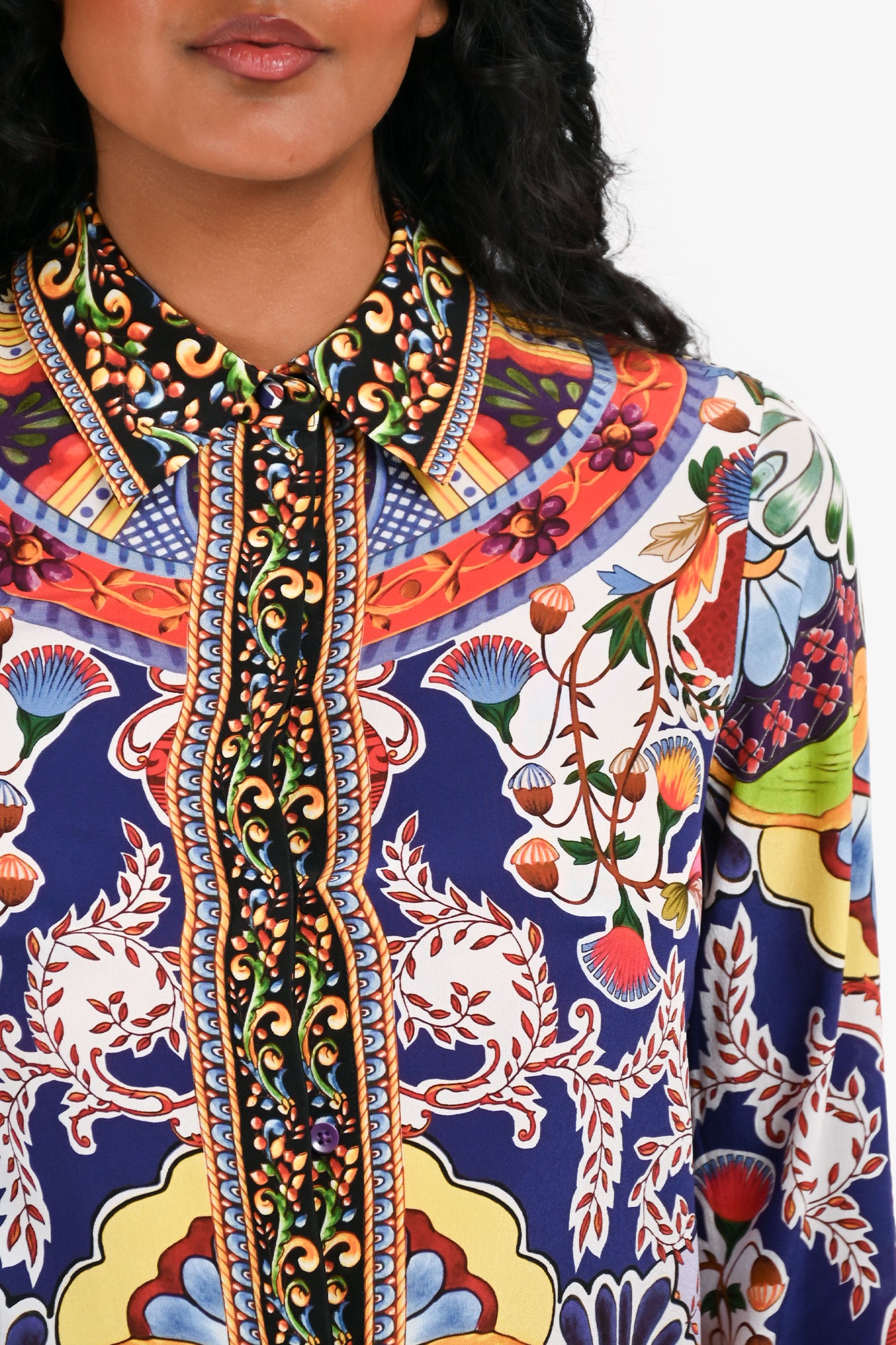 Alice + Olivia Blue Multicolour Printed Silk Button-Up Blouse Size S