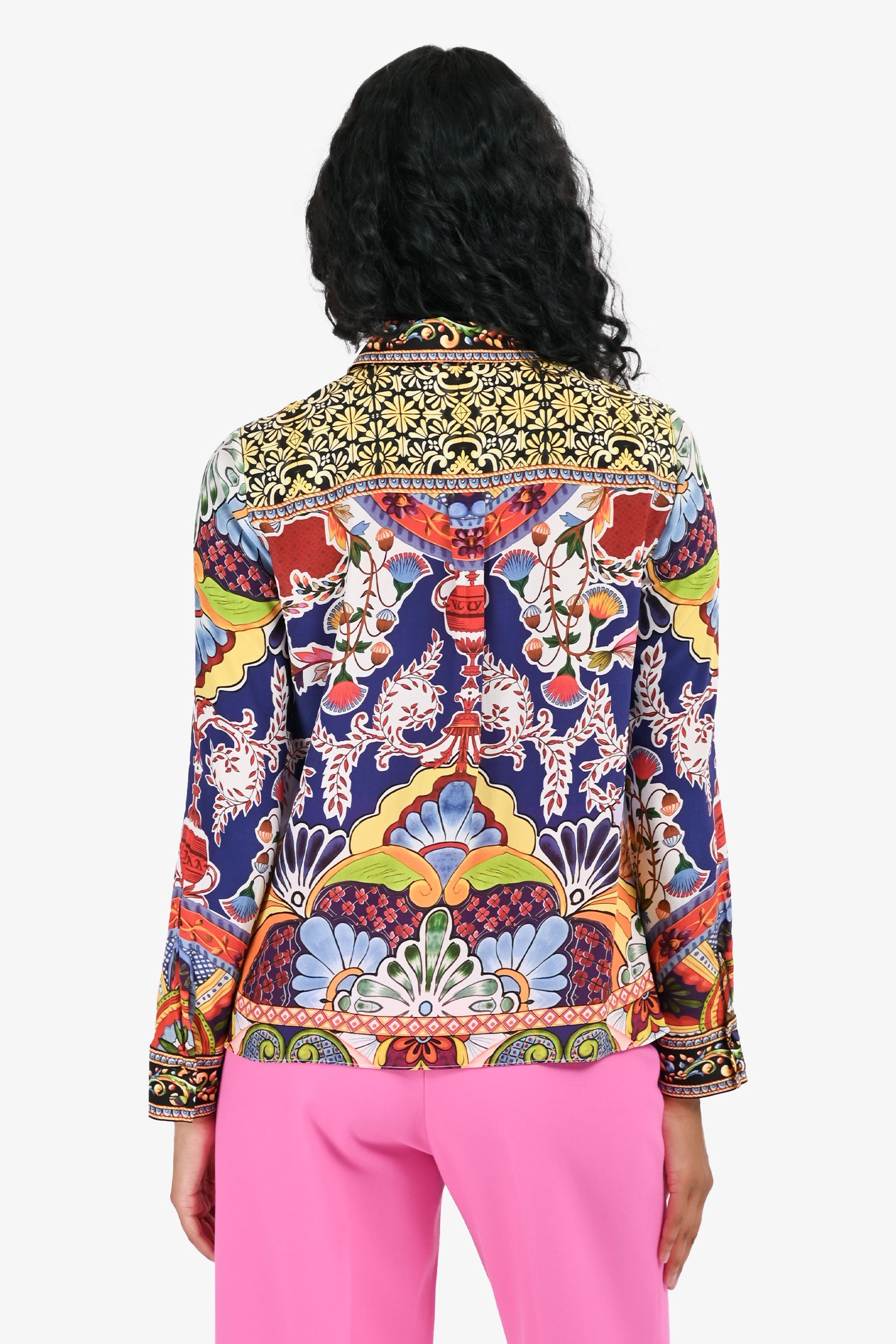 Refresh availabilityAlice + Olivia Blue Multicolour Printed Silk Button-Up Blouse. Long sleeves. Buttoned cuffs. Classic collar. Curved hem. Lightweight silk fabric. Tonal stitching.