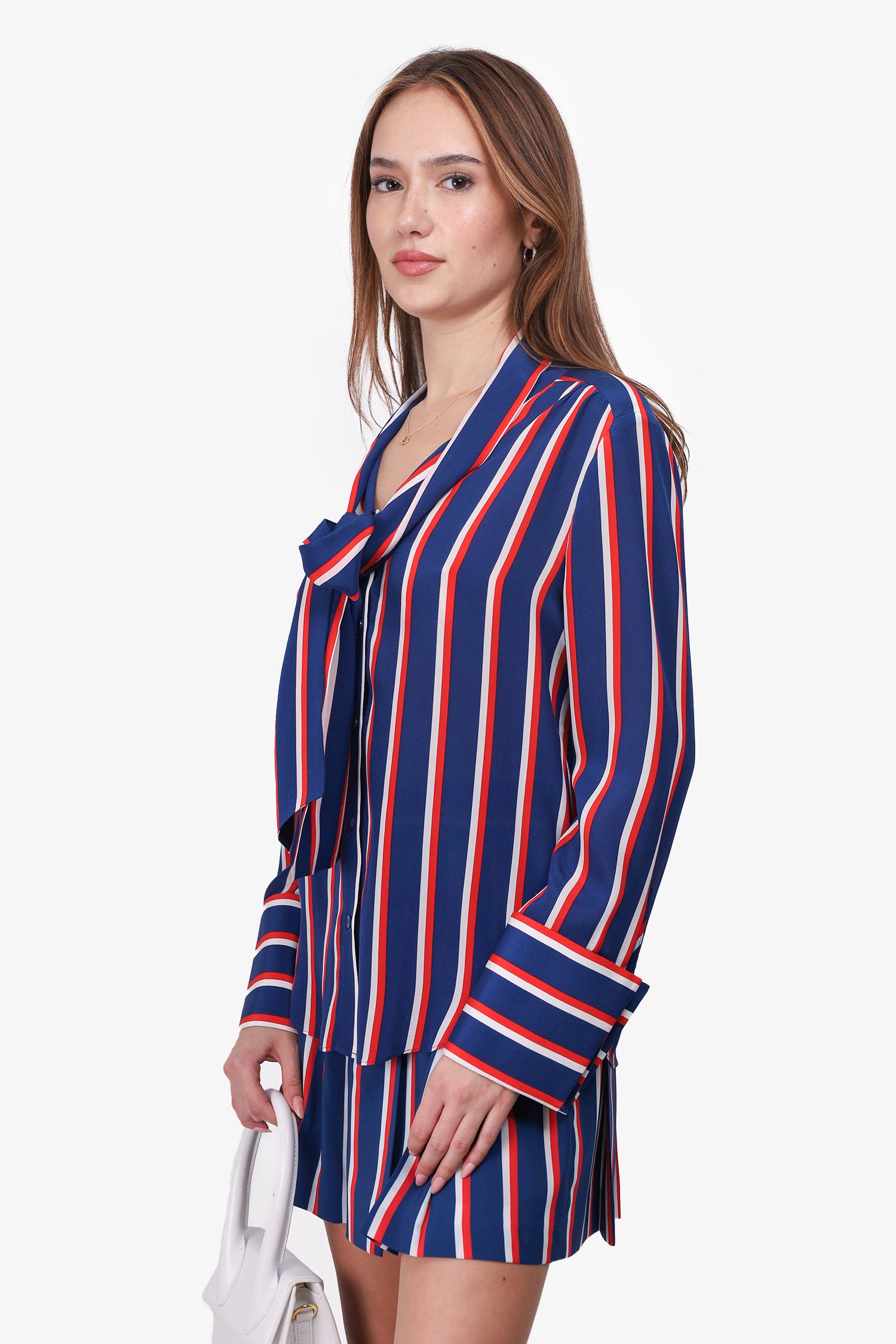 Refresh availabilityAlice + Olivia Blue/Red Striped Short Set. Top; Tie-up collar. Front button-up closure. Button-up closure on sleeve cuffs. Shorts; Front zip with double hook closure. Belt loops around waistband. Pleats throughout. Both are unlined with tonal stitching.