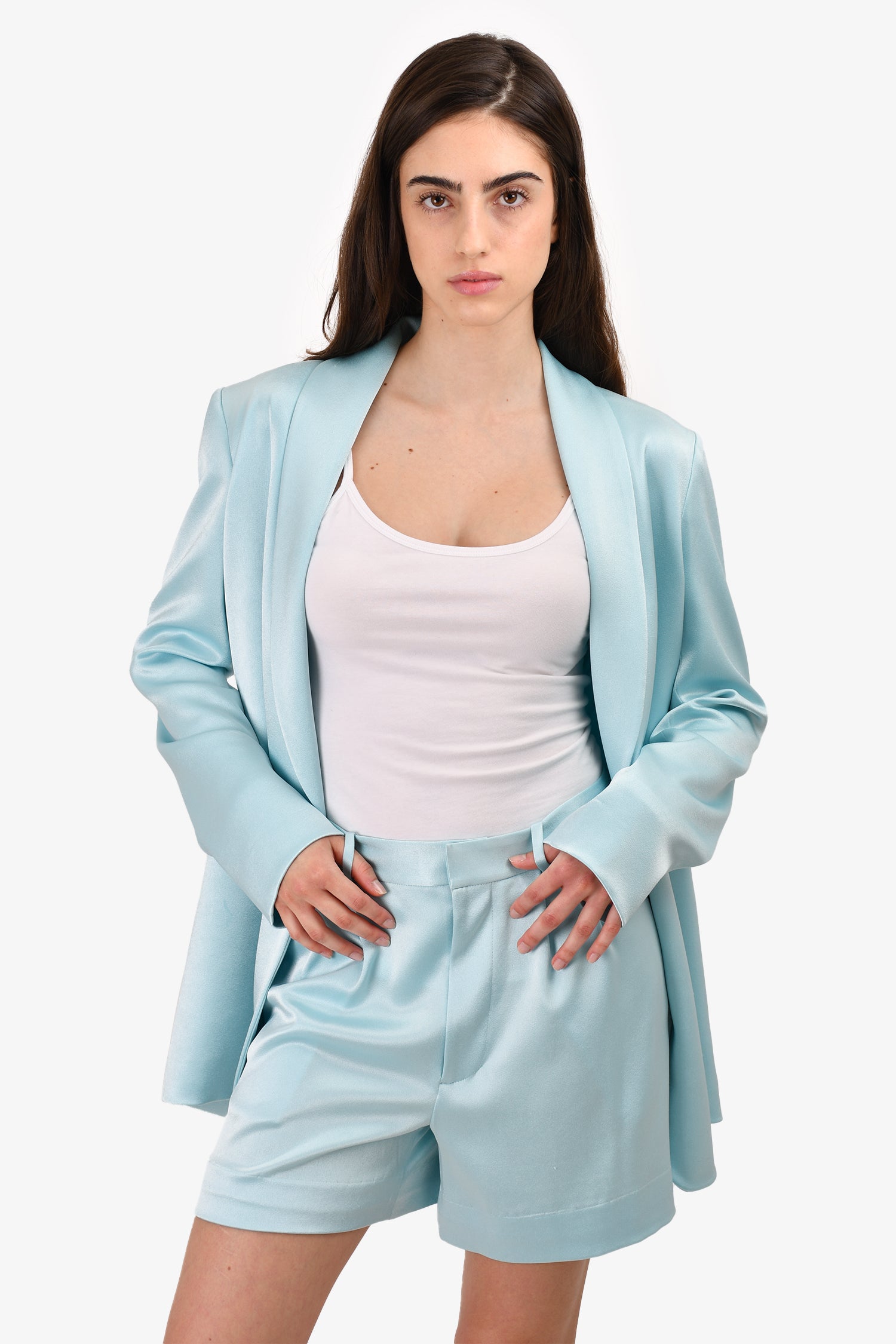 Refresh availabilityAlice & Olivia Blue Satin Shorts. Front zip and hook closures. Front and rear pockets. Waist belt loops.