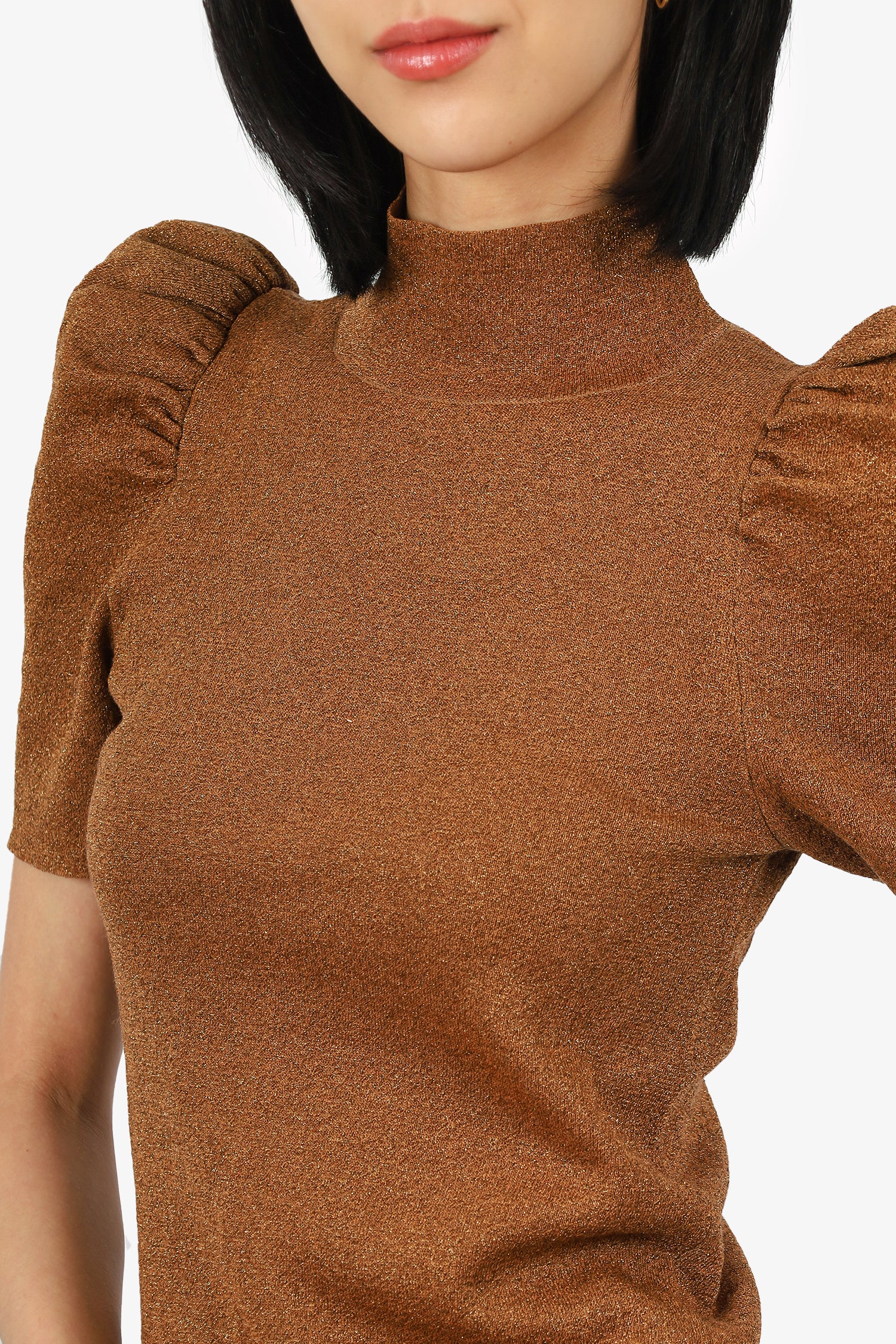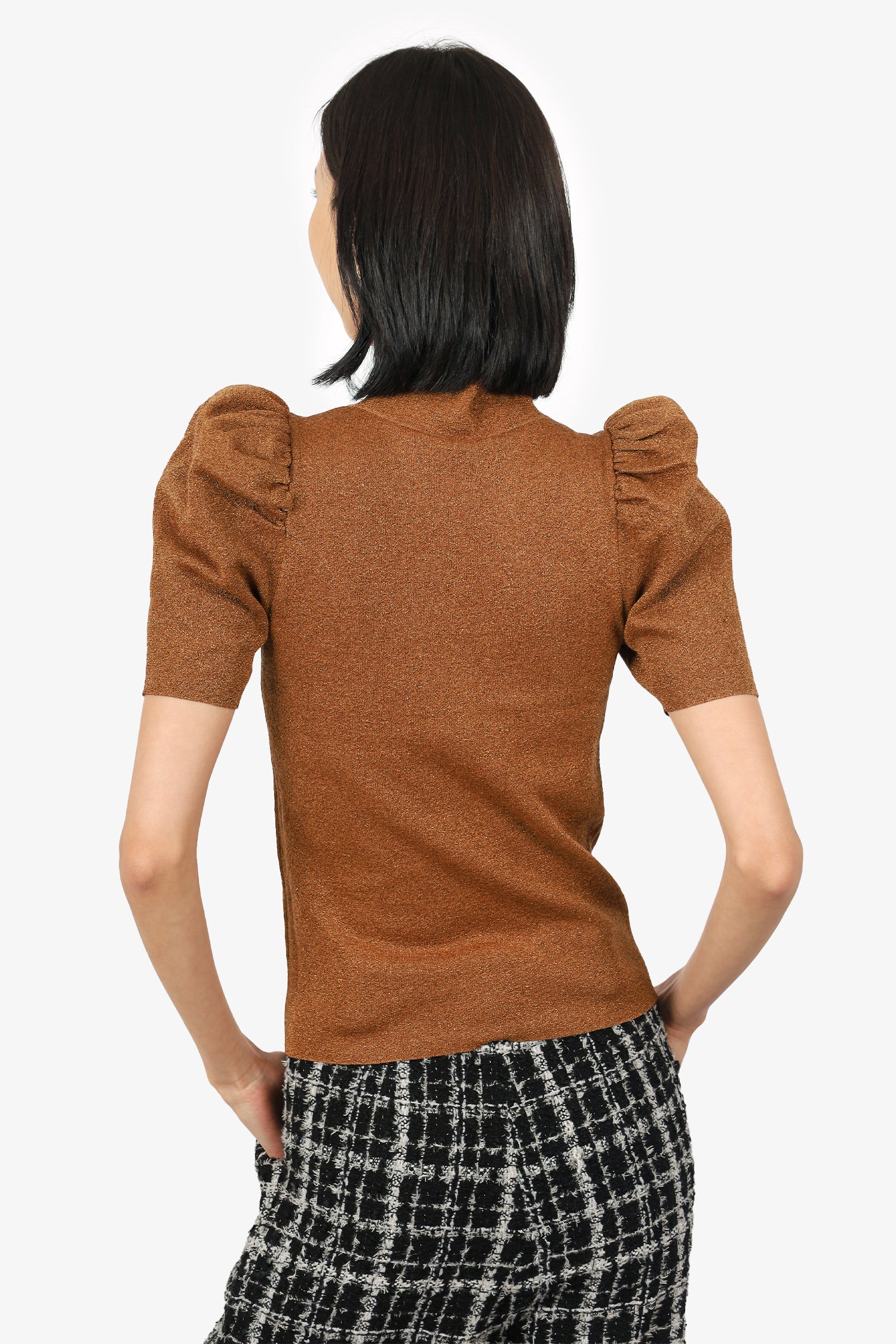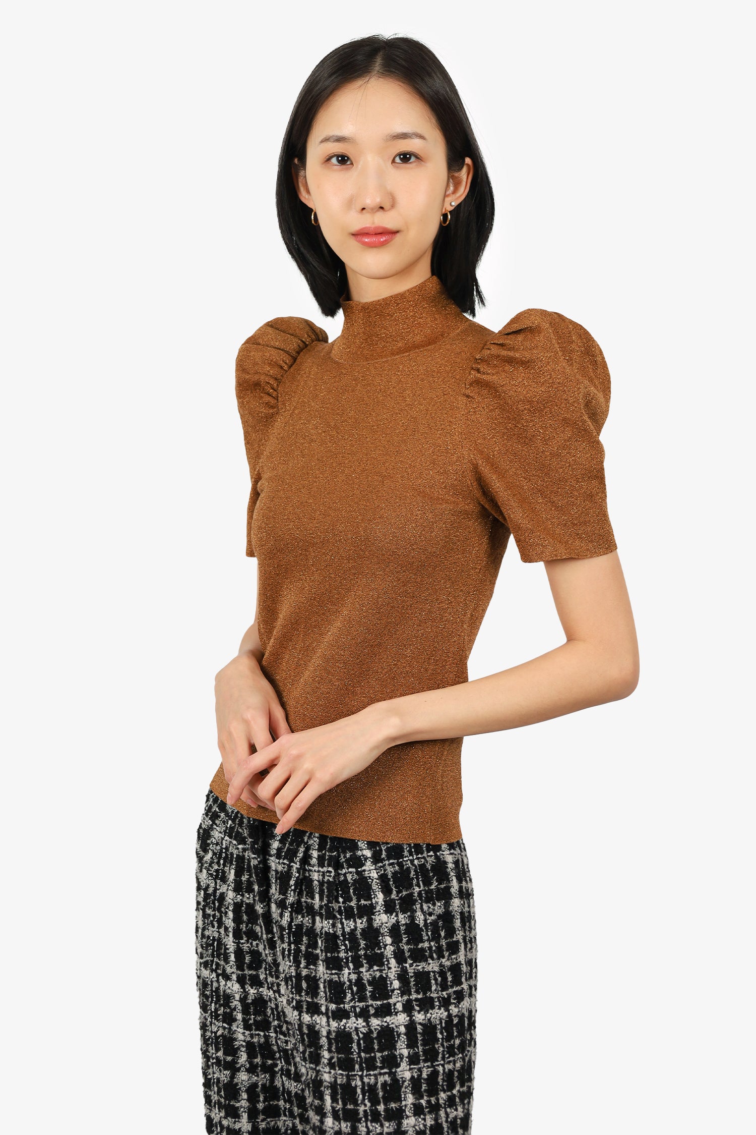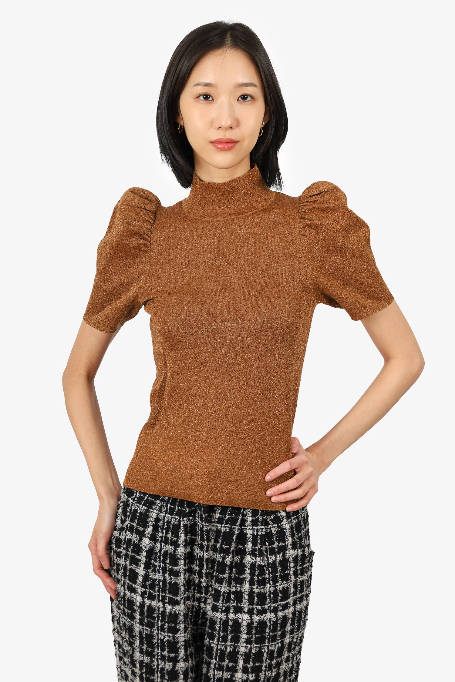Refresh availabilityAlice + Olivia Gold Glitter Puff Short Sleeve Knitted Top. Pull-on. Mock-neckline. Tonal stitching.