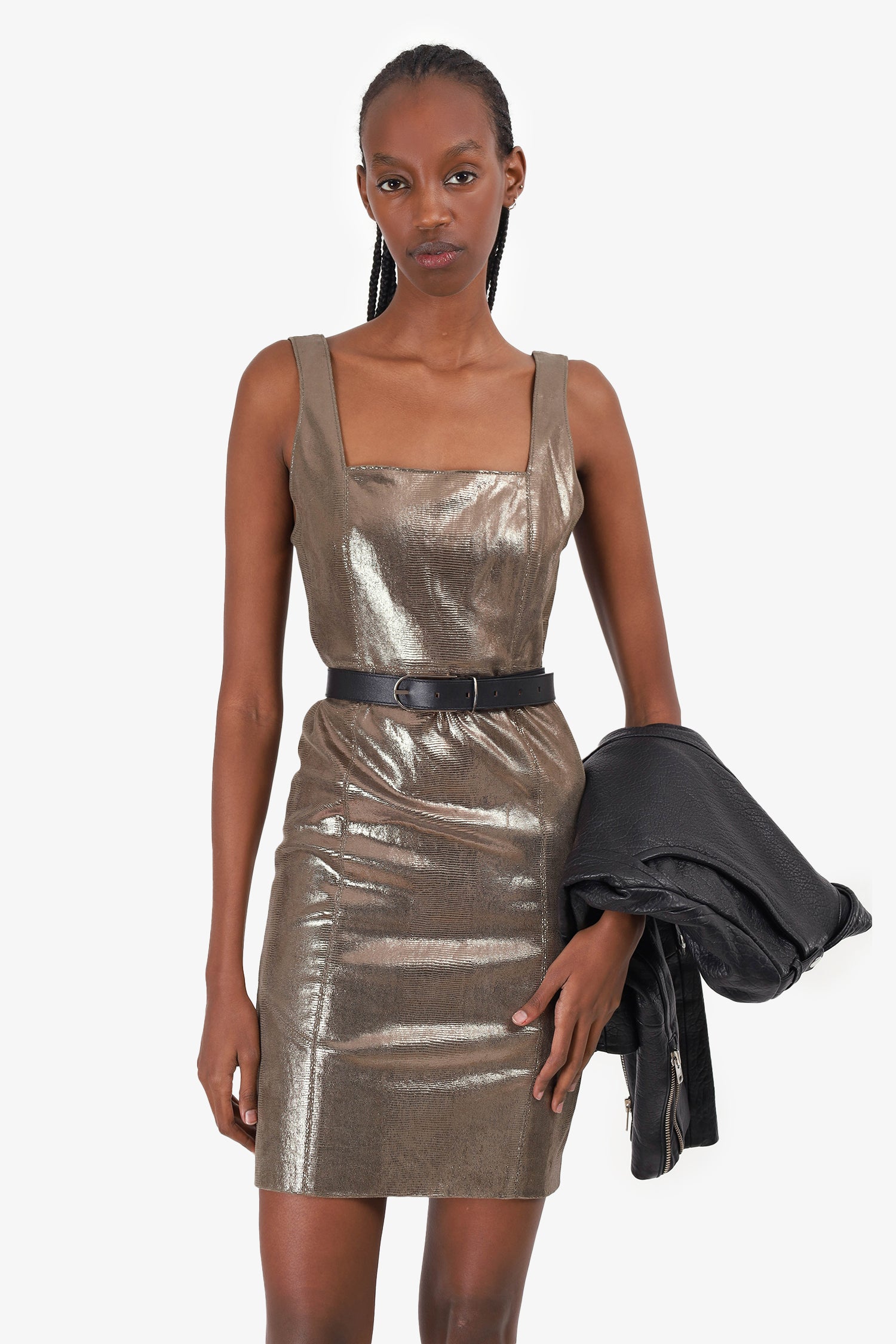 Refresh availabilityAlice & Olivia Gold Metalic Leather Sleeveless Mini Dress. Rear zip closure. Bronze-tone hardware. Rear vent. Lined. Tonal stitching.