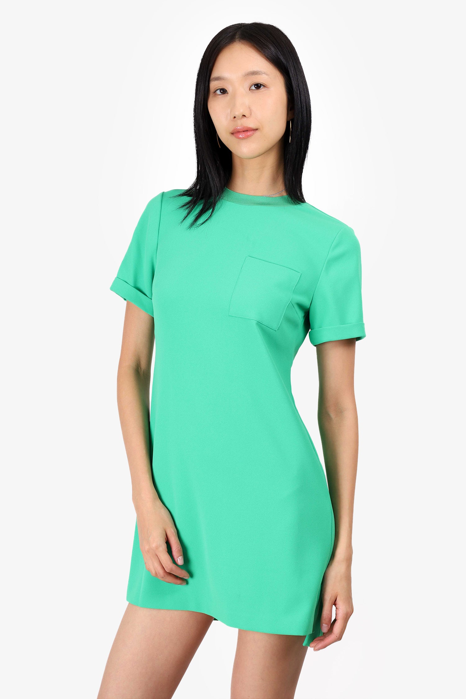 Refresh availabilityAlice + Olivia Green Short Sleeve Dress. Round neckline. Rear zip with hook closure. Folded sleeve cuffs. Single front slip pocket on left side. Unlined. Tonal stitching.