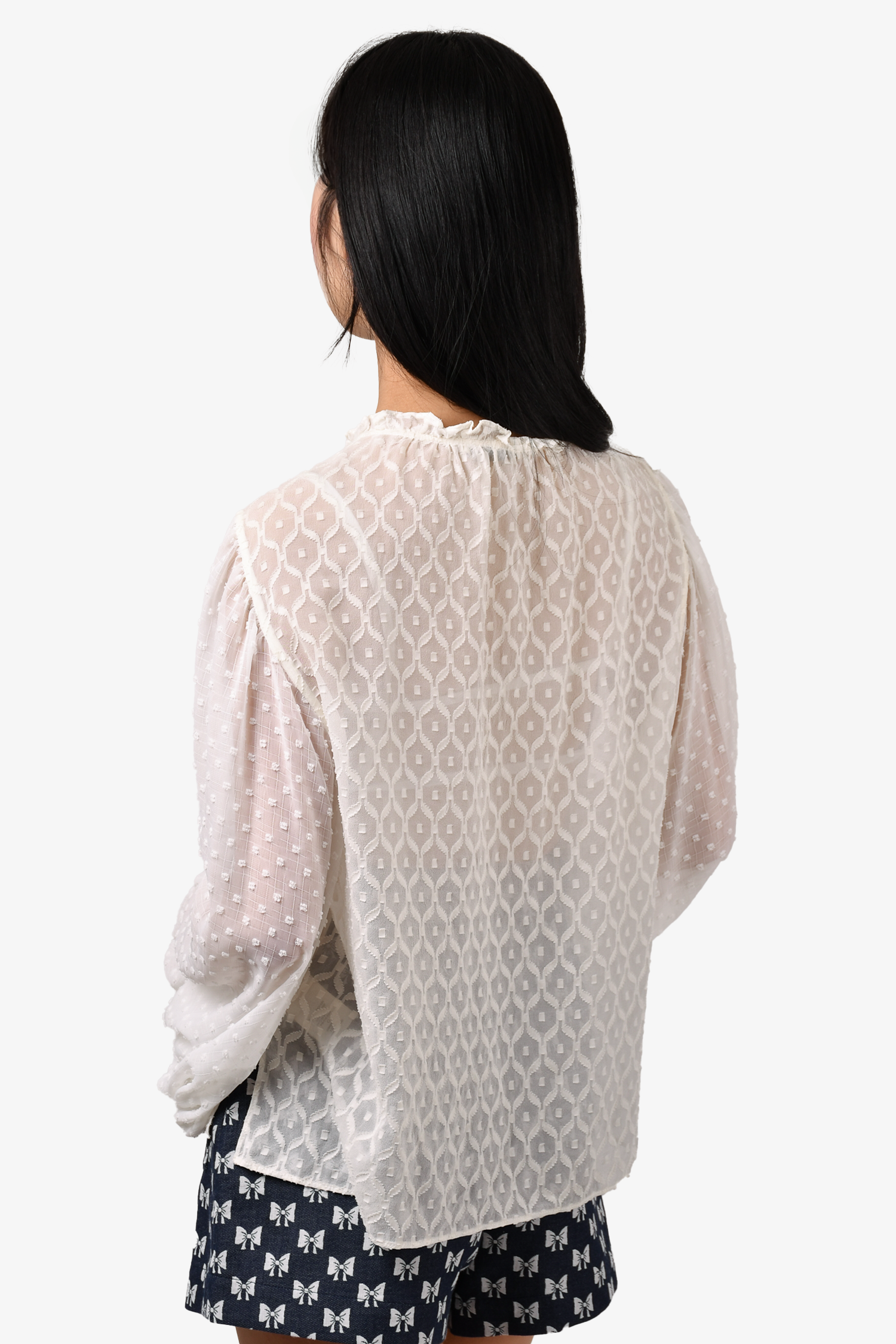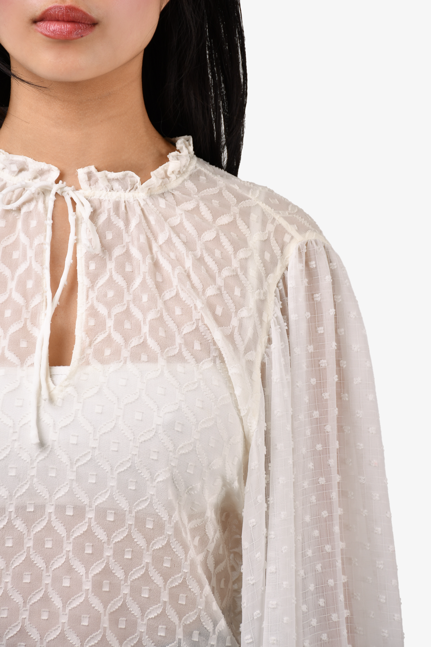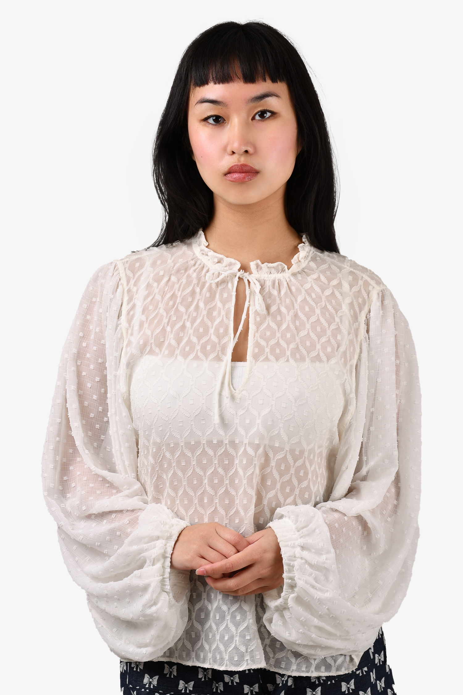 Refresh availabilityAlice & Olivia Silk and Cotton Blouse. Long bell bottom sleeve. V-neckline with ruffled collar. Tie keyhole closure. Unlined. Tonal stitching.