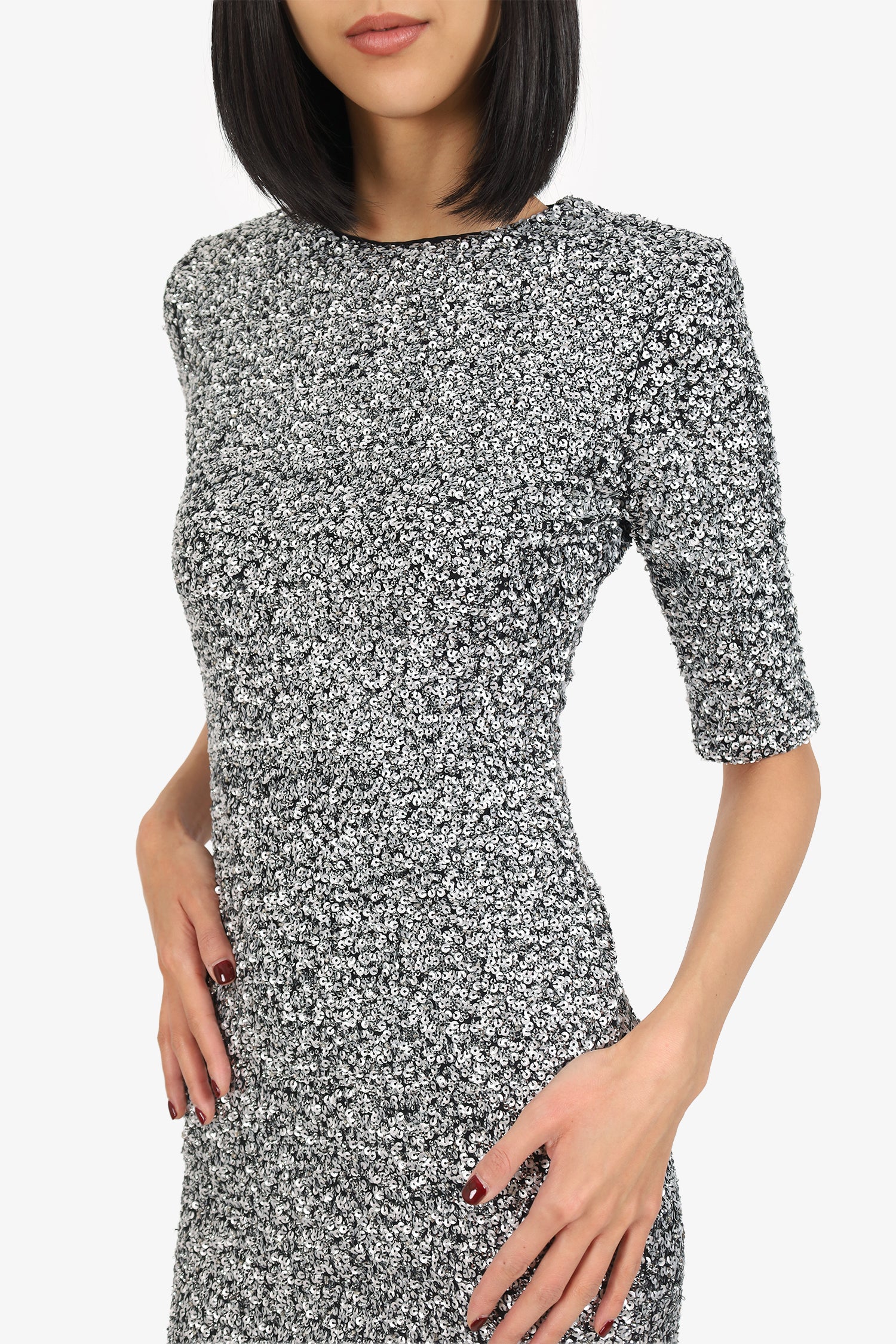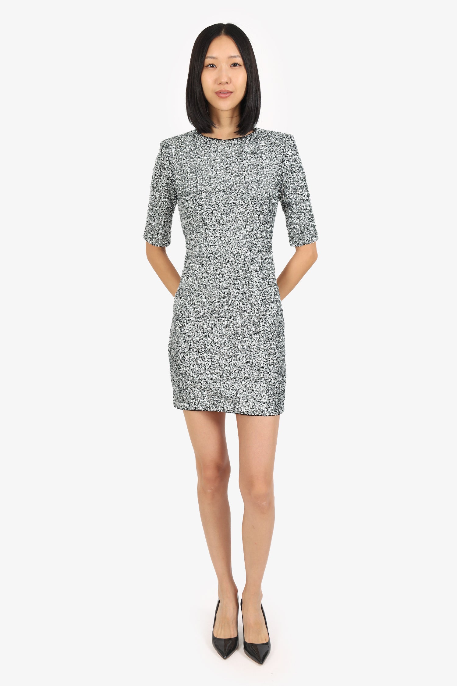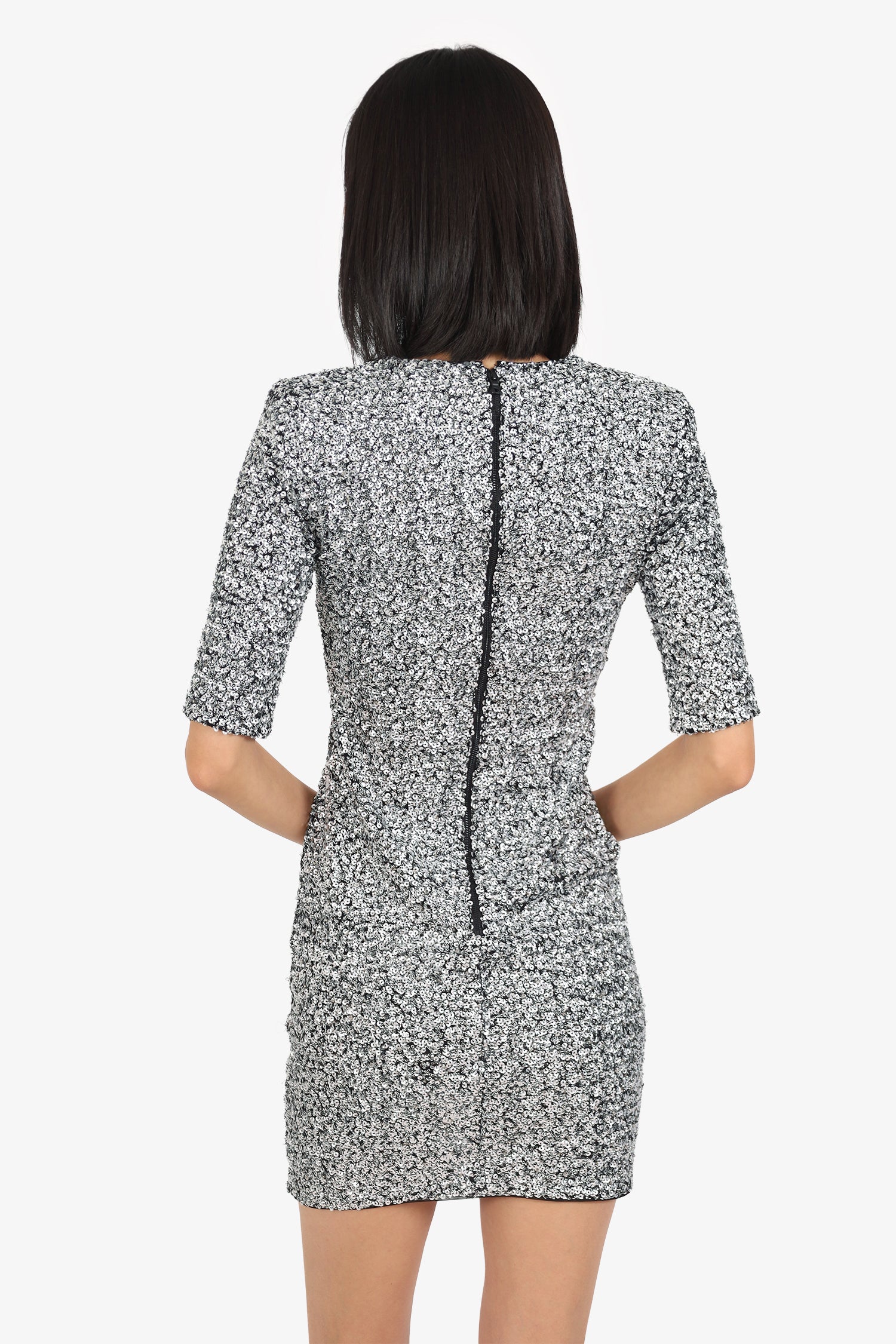 Refresh availabilityAlice & Olivia Silver Sequin Mini Dress. Slip-on. Round neckline. Rear zip and hook closure. Lined interior. Tonal stitching.